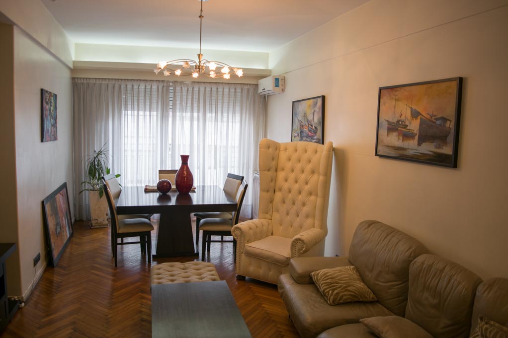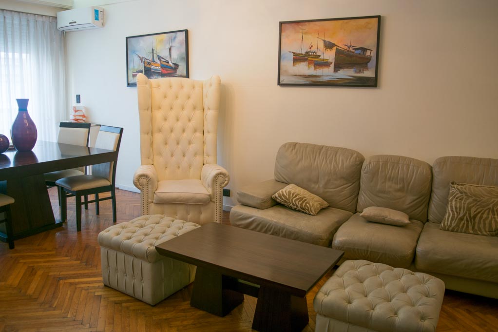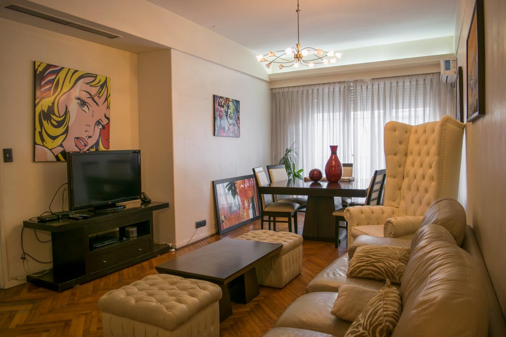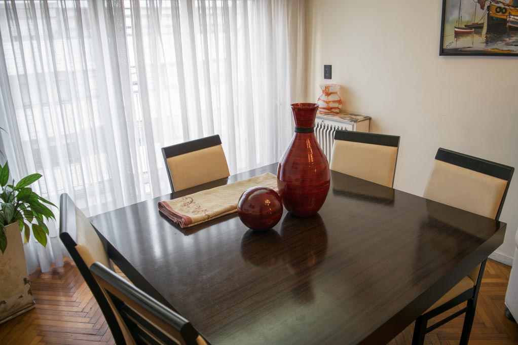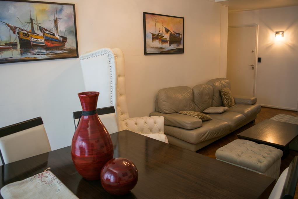 This 3 bedrooms furnished Apartment is located a 1 minute’ walk from the bus stop and a 3 minutes’ walk from the Metro Station Bulnes.The apartment has a living room, dinning room, kitchen (closed), 1 bathroom, 1 ½ bathroom and balcony. The bedroom 1 has a double bed, wardrobe, 2 nightstands and chair. The bedroom 2 has a single bed and wardrobe. The bedroom 3 has a sofa bed, wardrobe, dresser and chair. The place measures 95m² + 5m² of balcony approximately. The cost of services like common expenses, hot water, cold water, electricity, gas, internet, TV cable and phone are paid in advance together with the monthly rent, with a consumption limit of $ 320USD. You should pay a security deposit, which will be returned at the end of the lease term; The tenant(s) must also pay $ 11USD fee when the unit is returned for cleaning.
