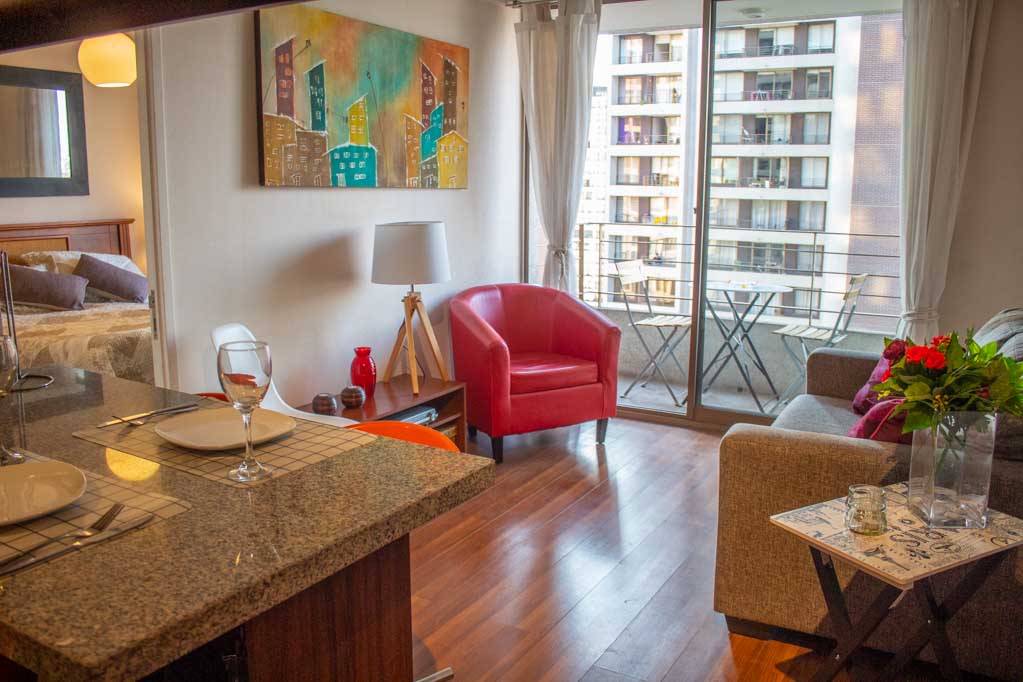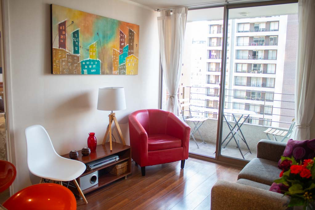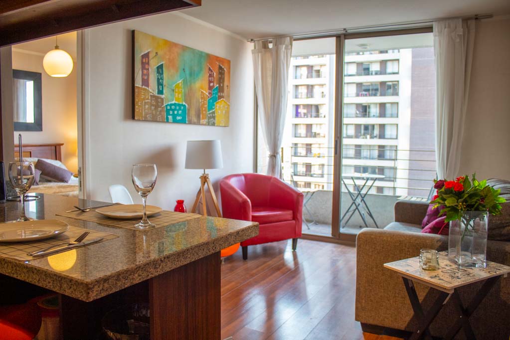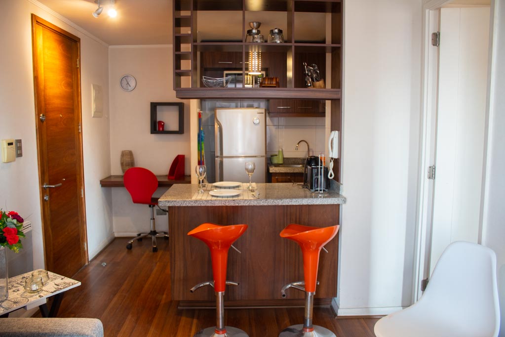 This 1 bedroom furnished Apartment is located a 1 minute’ walk from the bus stop and a 2 minutes’ walk from the Metro Station Irarrázaval.The apartment has a living room, dinning room, kitchen (open), 1 bathroom, terrace and 1 estacionamiento (optional for additional value of $ 49USD). The bedroom 1 has a double bed, walk-in closet, 2 nightstands, TV, chair and bathroom in suite. The place measures 42m² + 4m² of balcony approximately Should be considered, the payment of the expenses of services of common expenses, hot water, cold water and electricity that add $ 99USD approximately. The accommodation has in-house share laundry, price per load for both washers or dryers is $ 1USD approximately. You should pay a security deposit, which will be returned at the end of the lease term; The tenant(s) must also pay $ 44USD fee when the unit is returned for cleaning. The unit is located close to Irarrázaval Avenue, one of the main thoroughfares of Santiago, characterized by its different shops, supermarkets, restaurants, pubs and nightclubs. It also has various means of public transport to different parts of the city.