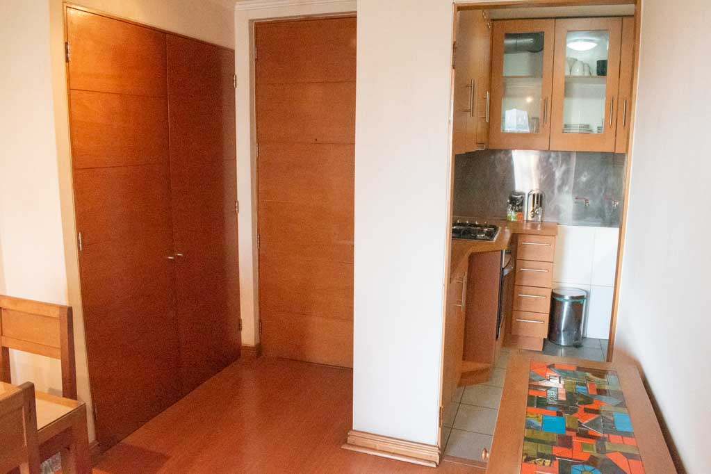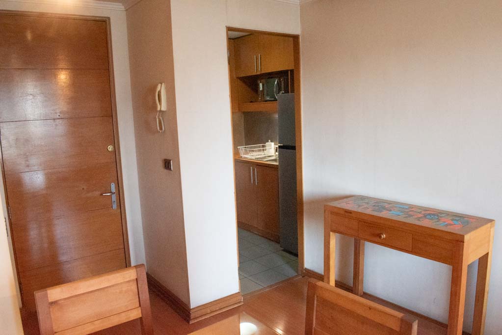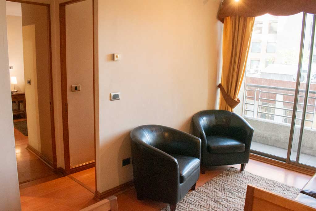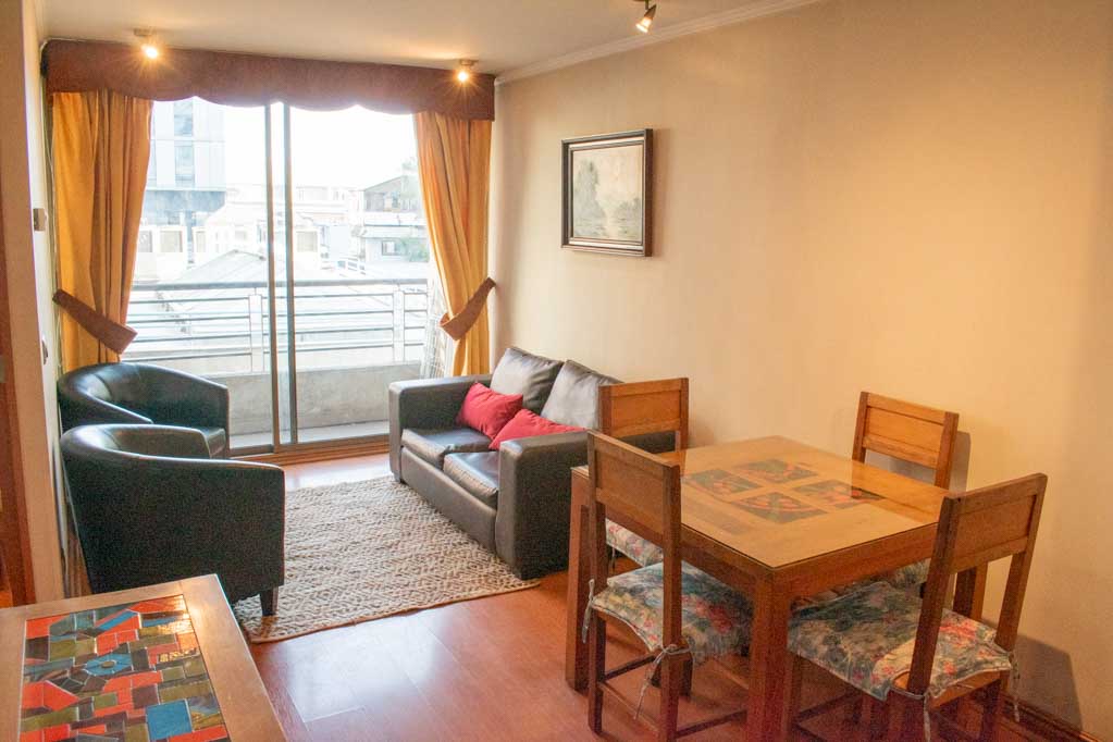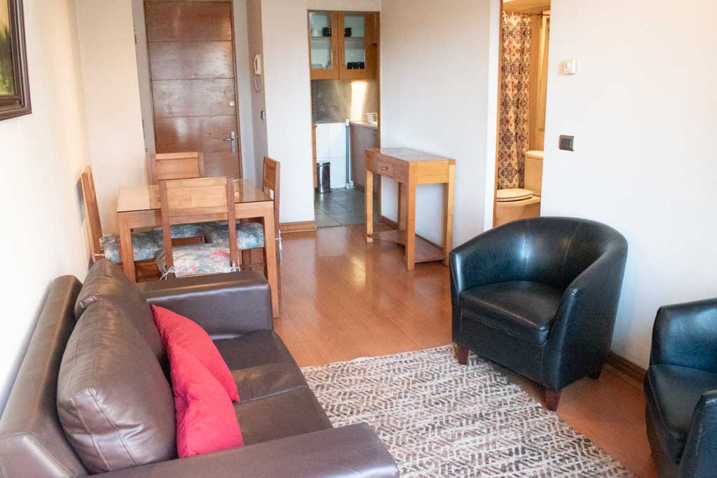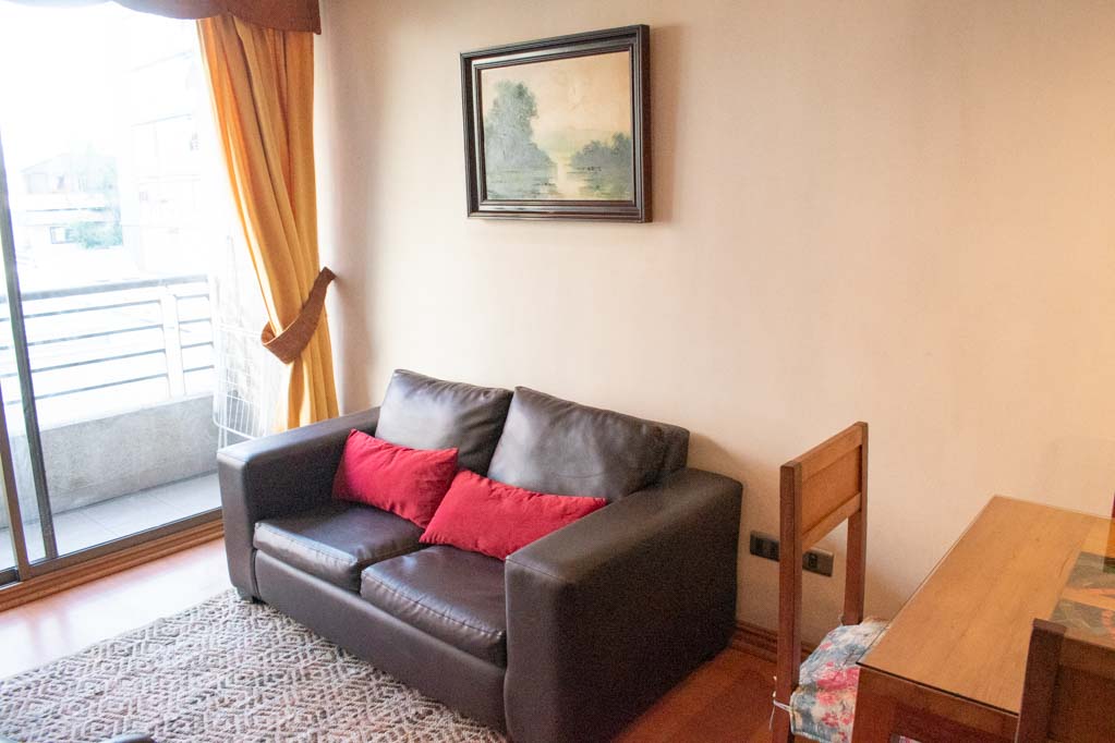 This 2 bedrooms furnished Apartment is located a 3 minutes’ walk from the bus stop and a 4 minutes’ walk from the Metro Station Pedro de Valdivia.The apartment has a living room, dinning room, kitchen (closed), 2 bathrooms and balcony. The bedroom 1 has a double bed, walk-in closet, 2 nightstands, couch, TV and bathroom in suite. The bedroom 2 has a single bed, closet and nightstand. The place measures 50m² + 3m² of balcony approximately The cost of services like internet and TV cable are paid in advance together with the monthly rent, with a consumption limit of $ 38USD. In addition, should be considered, the payment of the expenses of services of common expenses, hot water, cold water, electricity and gas that add $ 218USD approximately. The accommodation has in-house share laundry, price per load for both washers or dryers is $ 2USD approximately. You should pay a security deposit, which will be returned at the end of the lease term; The tenant(s) must also pay $ 54USD fee when the unit is returned for cleaning. The unit is located close to Providencia Avenue, where they are located different shops, banks, supermarkets, restaurants, coffee shops, bars, and accessibility to different parts of the city. A few steps away you can find the Church of the Divine Providence, a national monument, and the sculpture’s park, with artworks of different artists, and pleasant green areas.