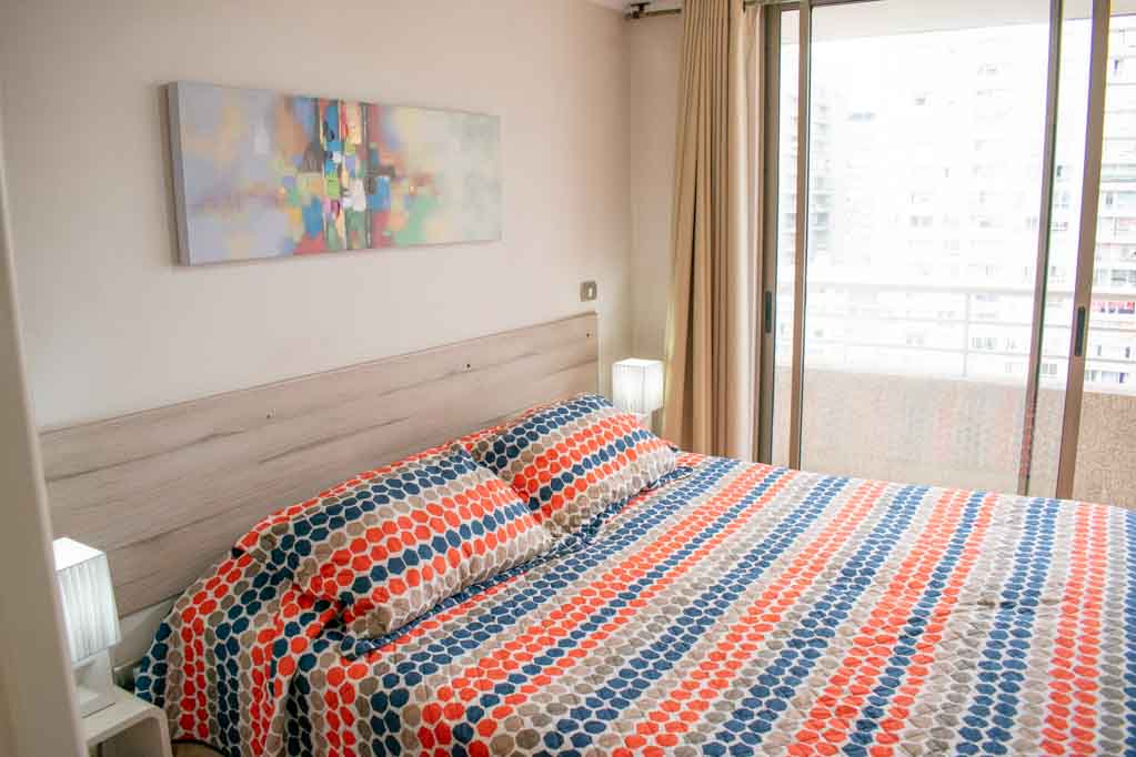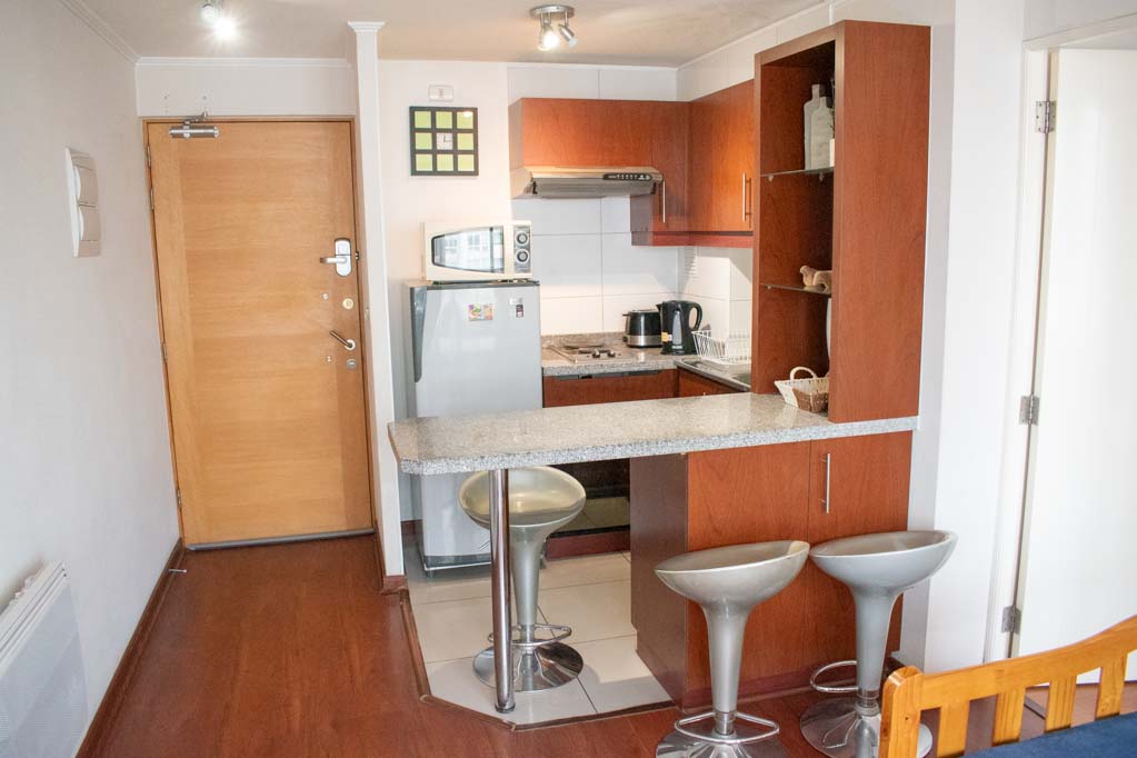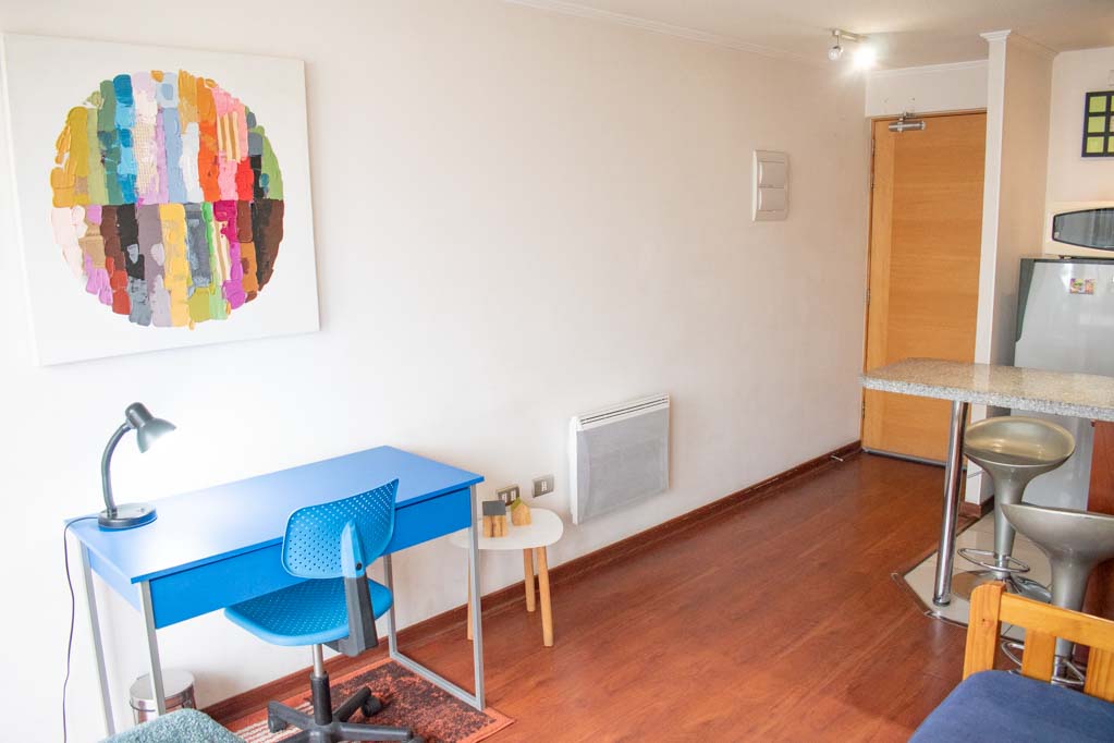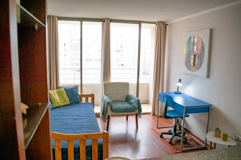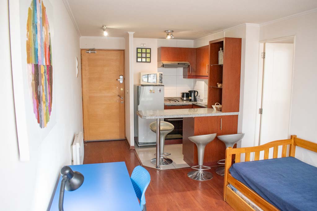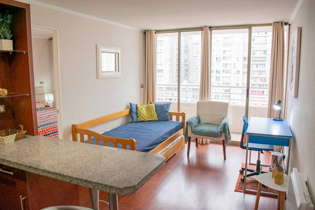 This 1 bedroom furnished Apartment is located a 5 minutes’ walk from the bus stop and a 5 minutes’ walk from the Metro Station Universidad de Chile.The apartment has a living room, dinning room, kitchen (open), 1 bathroom and terrace. The bedroom 1 has a double bed, walk-in closet, 2 nightstands, TV and bathroom in suite. The place measures 31m² + 6m² of balcony approximately The cost of services like common expenses, hot water, cold water, electricity, internet and TV cable are paid in advance together with the monthly rent, with a consumption limit of $ 131USD. The accommodation has in-house share laundry, price per load for both washers or dryers is $ 2USD approximately. You should pay a security deposit, which will be returned at the end of the lease term; The tenant(s) must also pay $ 27USD fee when the unit is returned for cleaning. The unit is located close to Bernardo O'Higgins Avenue (better known as Alameda,) where you can find different shops, a variety of public transport and the civic center of Santiago; also, a few steps away from the subway, you can find the emblematic José Miguel Carrera National Institute, the University of Chile and the Municipal Theater of Santiago.