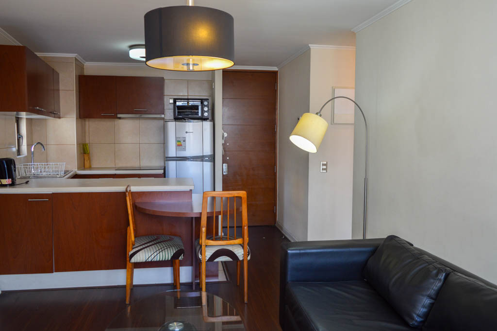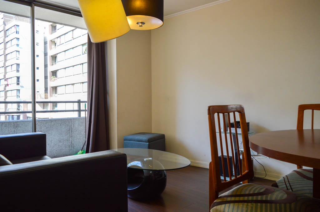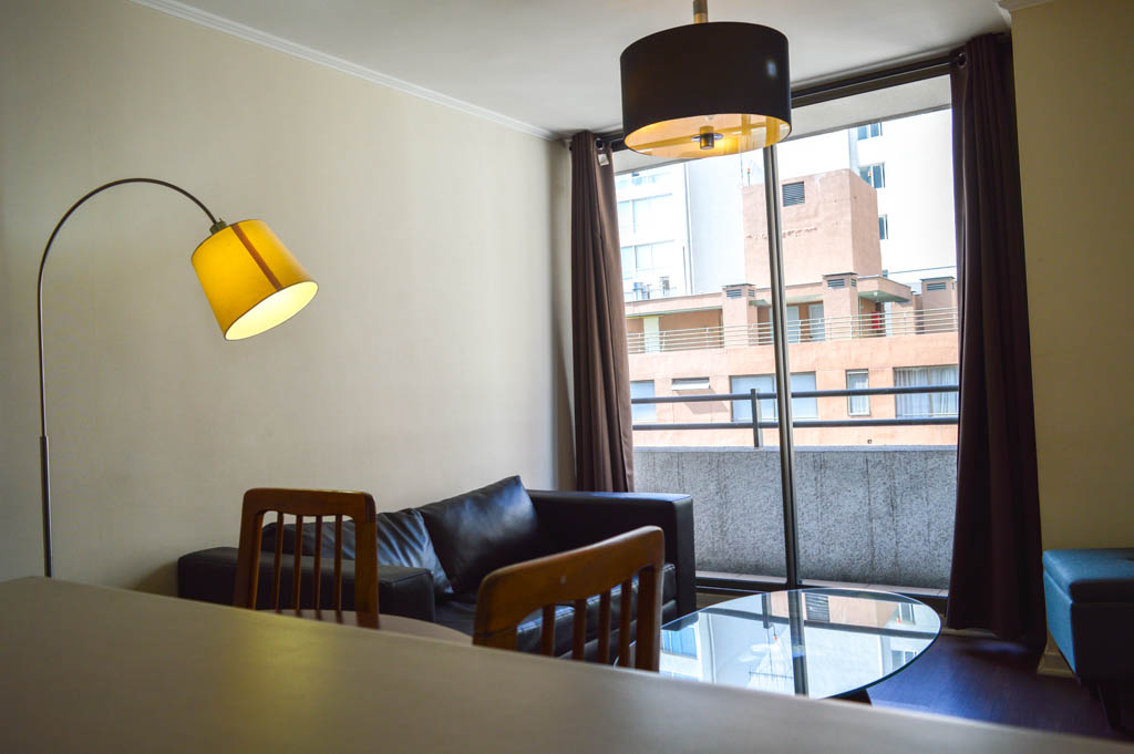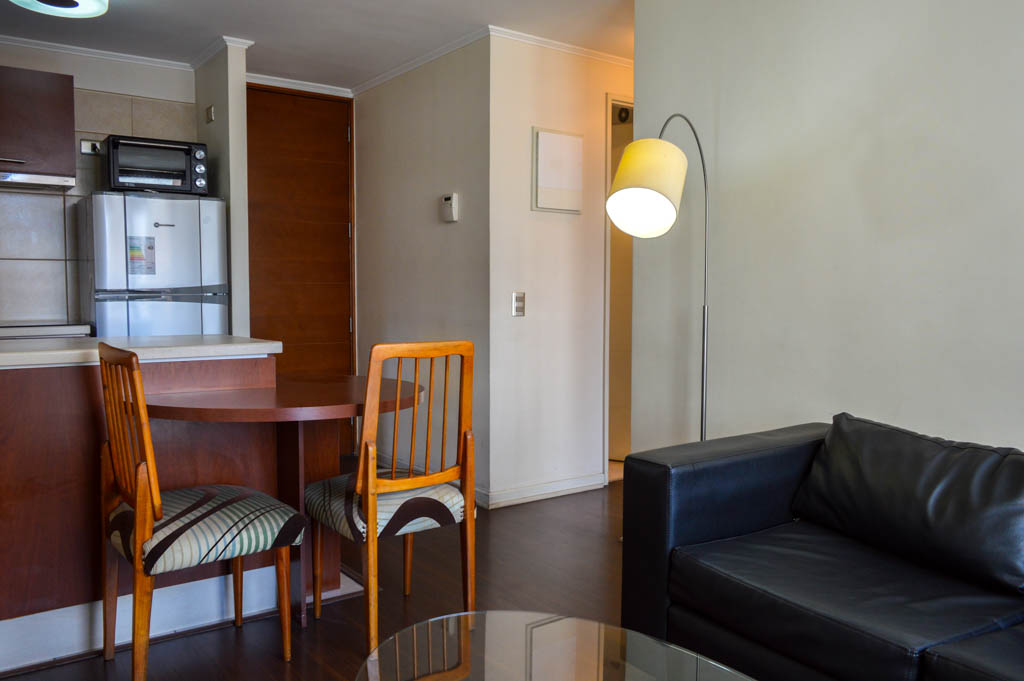This 2 bedrooms furnished Apartment is located a 6 minutes’ walk from the bus stop and a 8 minutes’ walk from the Metro Station Santa Ana.The apartment has a living room, dinning room, kitchen (open), 2 bathrooms and balcony. The bedroom 1 has a double bed, closet, 2 nightstands, TV and bathroom in suite. The bedroom 2 has a single bed, closet and nightstand. The place measures 48m² + 6m² of balcony approximately The cost of services like common expenses, hot water, cold water and electricity are paid in advance together with the monthly rent, with a consumption limit of $ 116USD. The accommodation has in-house share laundry, price per load for both washers or dryers is $ 1USD approximately. You should pay a security deposit, which will be returned at the end of the lease term; The tenant(s) must also pay $ 35USD fee when the unit is returned for cleaning. The unit is located close to the emblematic high schools 1 Javiera Carrera and Liceo de Aplicación, in addition to the national monument, the church Iglesia Parroquial de Santa Ana. A few steps away, you can find the square Plaza de Armas, an important part of the historic center of Santiago, renowned for its architecture and infrastructure; such as the Post Office of Santiago, the Cathedral of Santiago, the Municipality and the Casa Colorada.