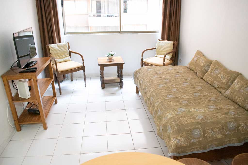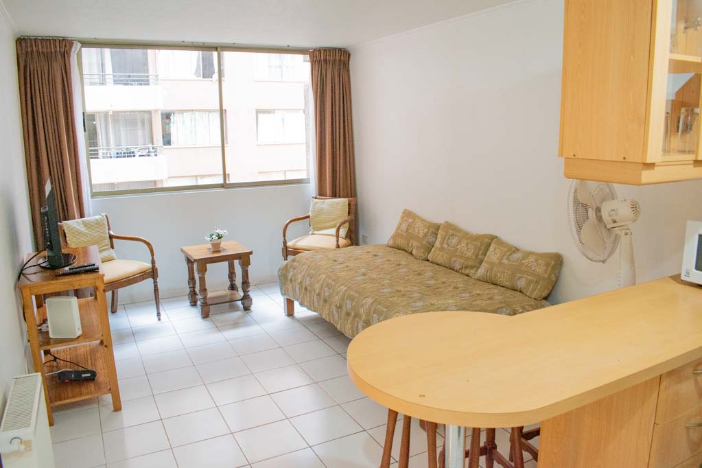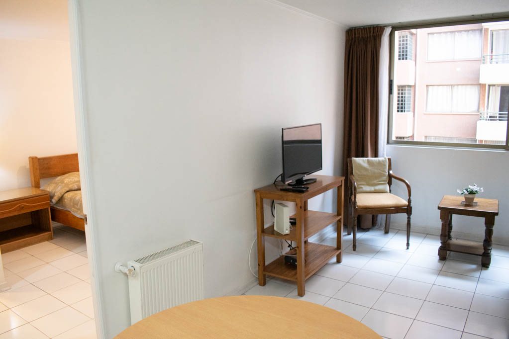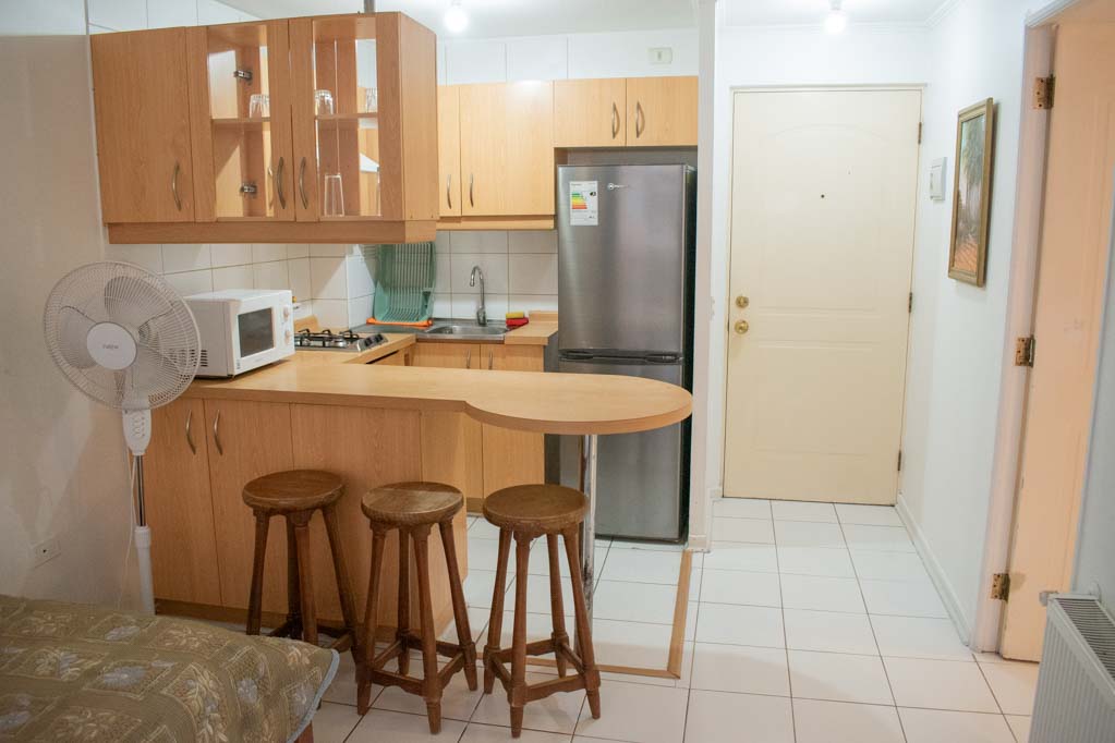 This 1 bedroom furnished Apartment is located a 2 minutes’ walk from the bus stop and a 5 minutes’ walk from the Metro Station Universidad de Chile.The apartment has a living room, dinning room, kitchen (open) and 1 bathroom. The bedroom 1 has a double bed, walk-in closet, 2 nightstands and bathroom in suite. The place measures 34m² approximately. The cost of services like common expenses, hot water, cold water, electricity, gas and internet are paid in advance together with the monthly rent, with a consumption limit of $ 182USD. The accommodation has in-house share laundry, price per load for both washers or dryers is $ 2USD approximately. You should pay a security deposit, which will be returned at the end of the lease term; The tenant(s) must also pay $ 38USD fee when the unit is returned for cleaning. The unit is located close to Bernardo O'Higgins Avenue (better known as Alameda,) where you can find different shops, a variety of public transport and the civic center of Santiago; also, a few steps away from the subway, you can find the emblematic José Miguel Carrera National Institute, the University of Chile and the Municipal Theater of Santiago.