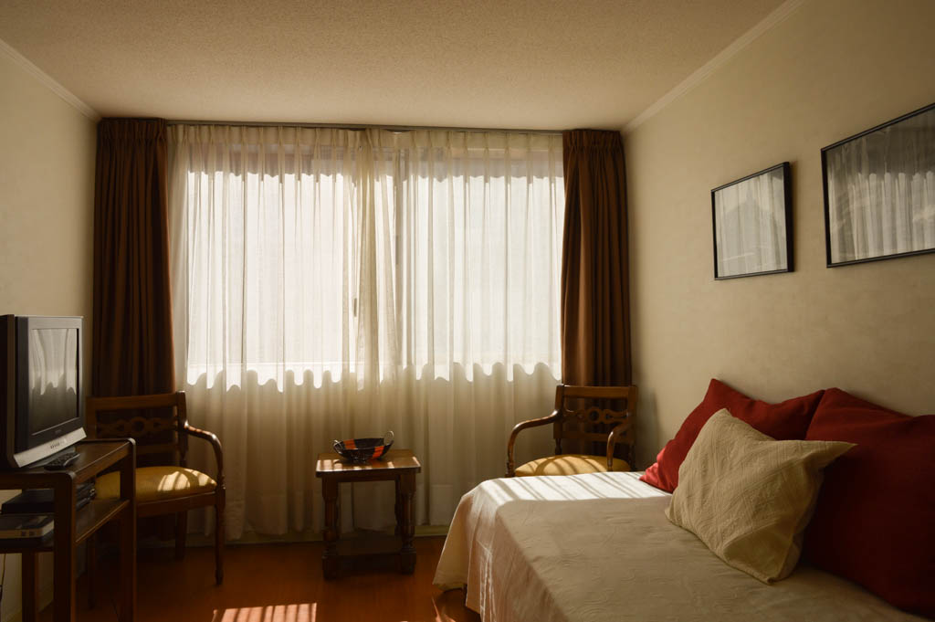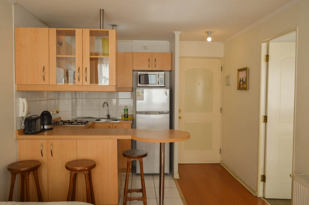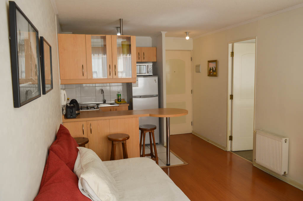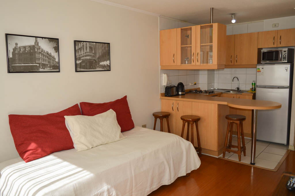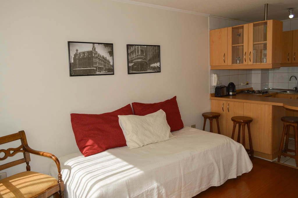 This 1 bedroom furnished Apartment is located a 2 minutes’ walk from the bus stop and a 5 minutes’ walk from the Metro Station Universidad de Chile.The apartment has a living room, dinning room, kitchen (open) and 1 bathroom. The bedroom 1 has a 2 single beds, walk-in closet, nightstand and bathroom in suite. The place measures 34m² approximately. The cost of services like common expenses, hot water, cold water, electricity, gas and internet are paid in advance together with the monthly rent, with a consumption limit of $ 158USD. The accommodation has in-house share laundry, price per load for both washers or dryers is $ 1USD approximately. You should pay a security deposit, which will be returned at the end of the lease term; The tenant(s) must also pay $ 39USD fee when the unit is returned for cleaning. The unit is located close to Bernardo O'Higgins Avenue (better known as Alameda,) where you can find different shops, a variety of public transport and the civic center of Santiago; also, a few steps away from the subway, you can find the emblematic José Miguel Carrera National Institute, the University of Chile and the Municipal Theater of Santiago.