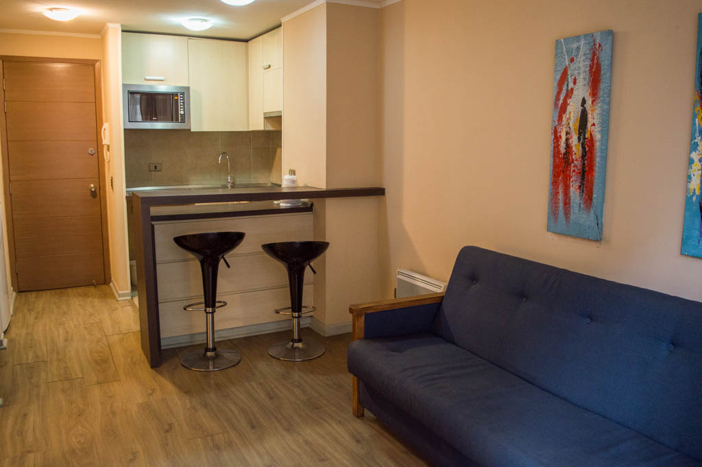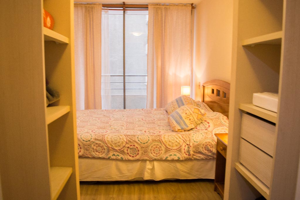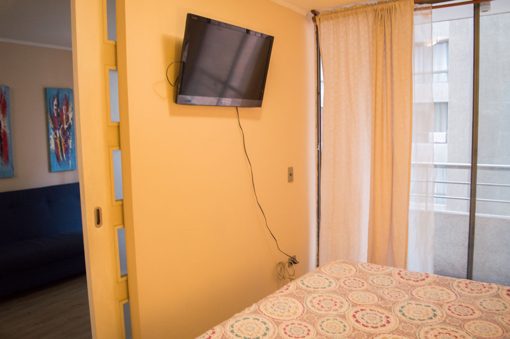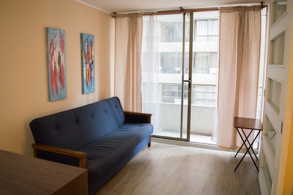 This 1 bedroom furnished Apartment is located a 3 minutes’ walk from the bus stop and a 5 minutes’ walk from the Metro Station Santa Lucía.The apartment has a living room, dinning room, kitchen (open), 1 bathroom and balcony. The bedroom 1 has a double bed, closet, 2 nightstands, TV and bathroom in suite. The place measures 33m² + 3m² of balcony approximately Should be considered, the payment of the expenses of services of common expenses, hot water, cold water and electricity that add $ 103USD approximately. The accommodation has in-house share laundry, price per load for both washers or dryers is $ 2USD approximately. You should pay a security deposit, which will be returned at the end of the lease term; The tenant(s) must also pay $ 54USD fee when the unit is returned for cleaning. The unit is located close to the Biblioteca Nacional de Chile, the Municipal Theater of Santiago, Cine Arte, craft fairs, cultural centers and the Santa Lucia Hill (an important focus for tourism and Sunday walks due to the attractions it presents, such as water fountains, terraces and viewpoints where you can enjoy a privileged view of Santiago.)
