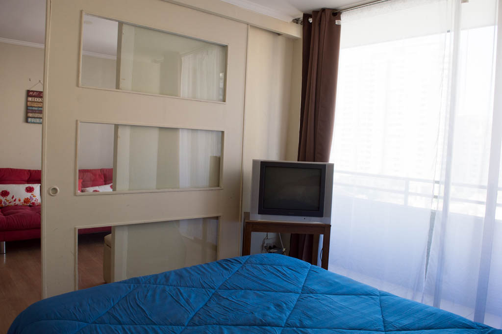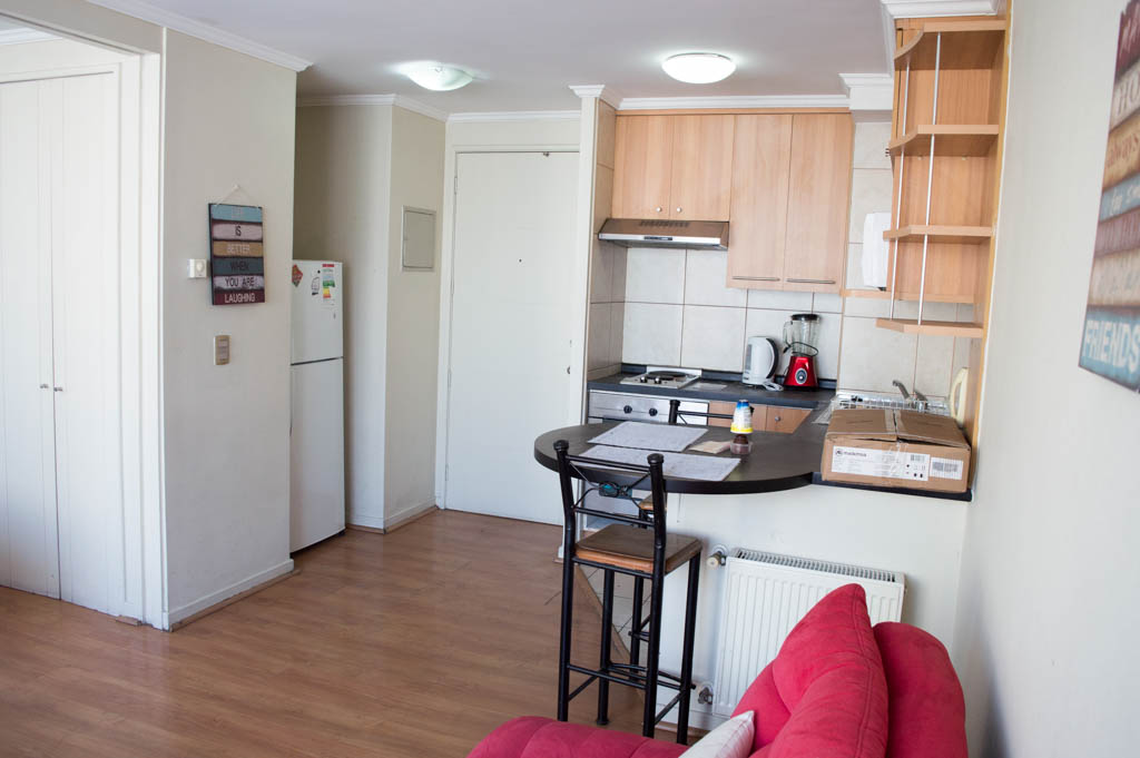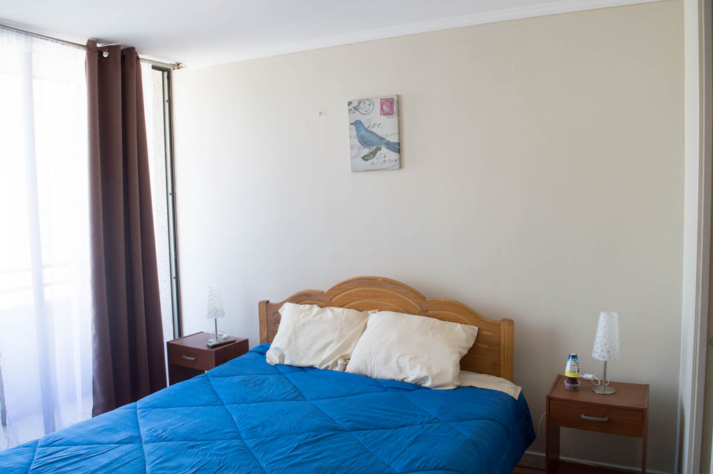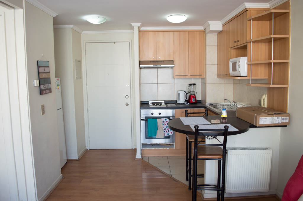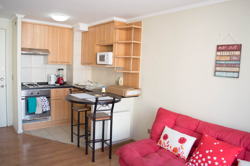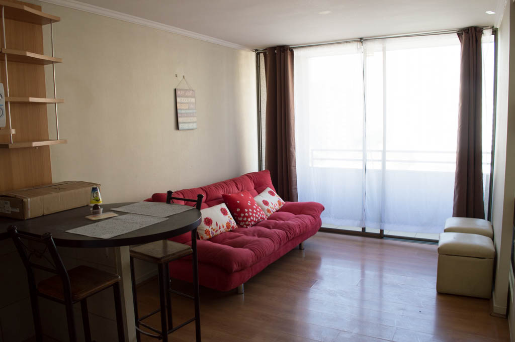 This 1 bedroom furnished Apartment is located a 1 minute’ walk from the bus stop and a 6 minutes’ walk from the Metro Station Santa Lucía.The apartment has a living room, dinning room, kitchen (open), 1 bathroom and balcony. The bedroom 1 has a double bed, closet, 2 nightstands, TV and bathroom in suite. The place measures 33m² + 3m² of balcony approximately Should be considered, the payment of the expenses of services of common expenses, hot water, cold water, electricity and gas that add $ 111USD approximately. The accommodation has in-house share laundry, price per load for both washers or dryers is $ 2USD approximately. You should pay a security deposit, which will be returned at the end of the lease term; The tenant(s) must also pay $ 59USD fee when the unit is returned for cleaning. The unit is located close to the Biblioteca Nacional de Chile, the Municipal Theater of Santiago, Cine Arte, craft fairs, cultural centers and the Santa Lucia Hill (an important focus for tourism and Sunday walks due to the attractions it presents, such as water fountains, terraces and viewpoints where you can enjoy a privileged view of Santiago.)