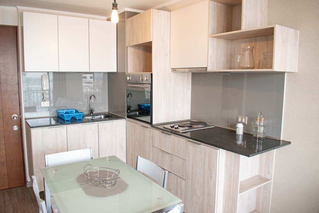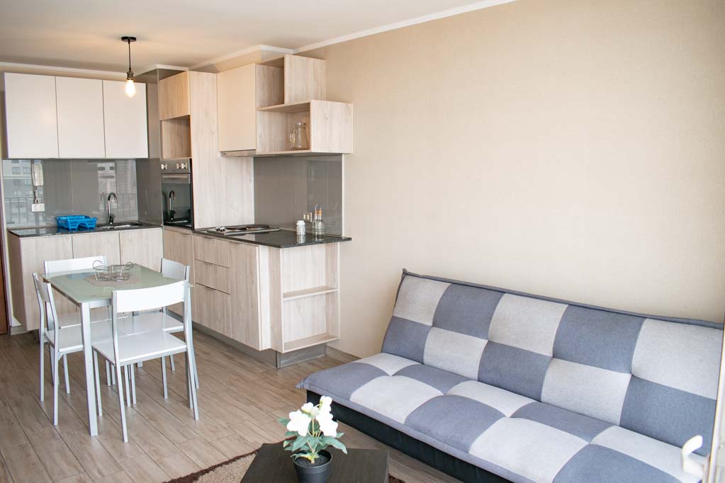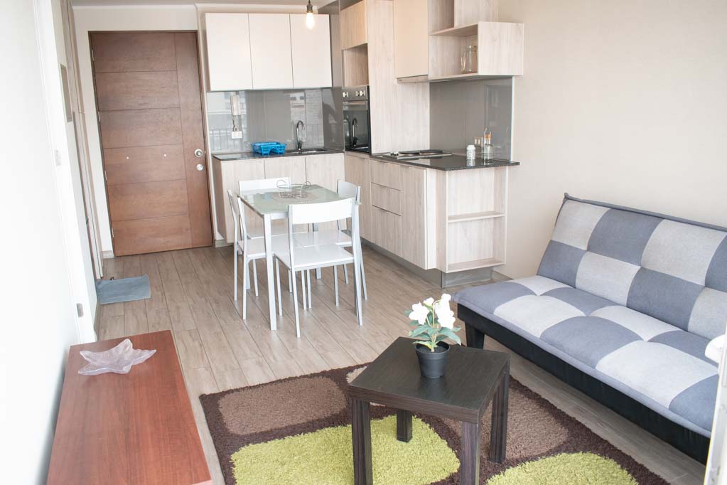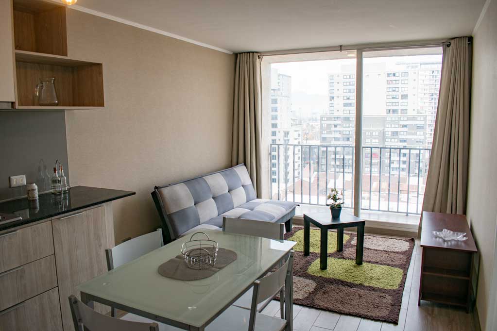 This 1 bedroom furnished Apartment is located a 1 minute’ walk from the bus stop and a 15 minutes’ walk from the Metro Station Irarrázaval.The apartment has a living room, dinning room, kitchen (open), 1 bathroom and terrace. The bedroom 1 has a double bed, closet, nightstand and bathroom in suite. The place measures 33m² + 5m² of balcony approximately Should be considered, the payment of the expenses of services of common expenses, hot water, cold water and electricity that add $ 124USD approximately. The accommodation has in-house share laundry, price per load for both washers or dryers is $ 2USD approximately. You should pay a security deposit, which will be returned at the end of the lease term; The tenant(s) must also pay $ 51USD fee when the unit is returned for cleaning. The unit is located close to Irarrázaval Avenue, one of the main thoroughfares of Santiago, characterized by its different shops, supermarkets, restaurants, pubs and nightclubs. It also has various means of public transport to different parts of the city.