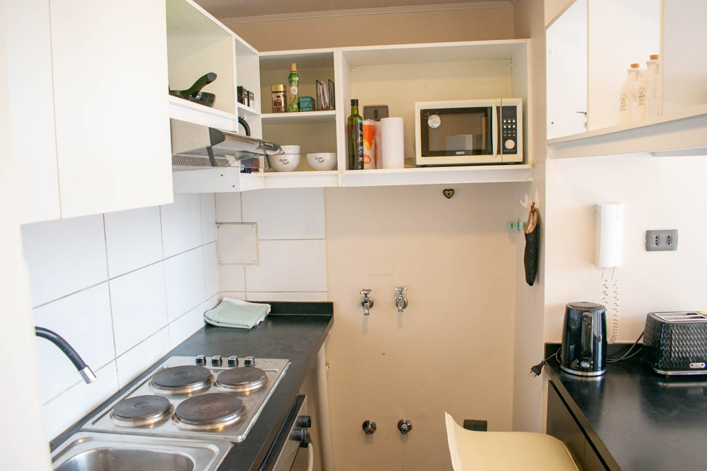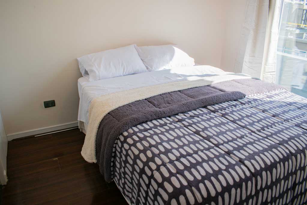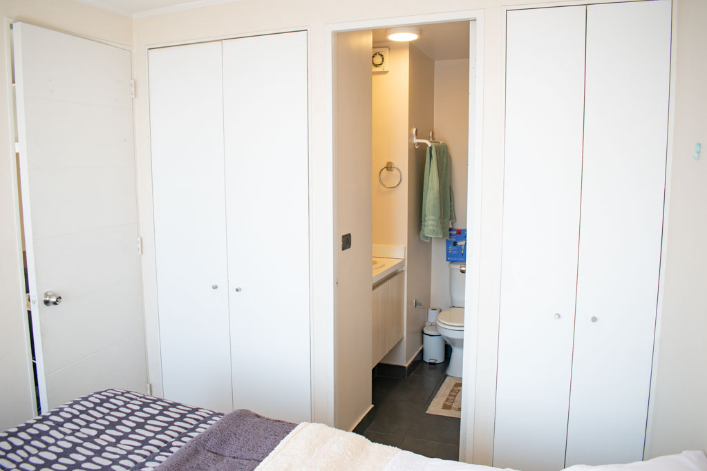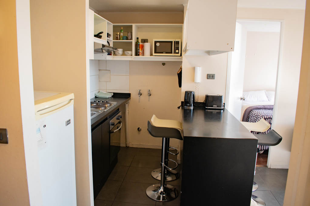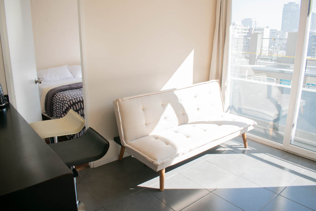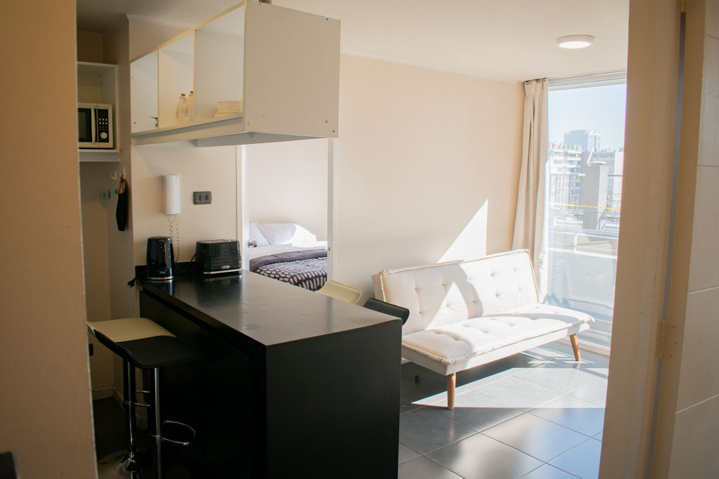 This 2 bedrooms furnished Apartment is located a 9 minutes’ walk from the bus stop and a 9 minutes’ walk from the Metro Station Universidad de Chile.The apartment has a living room, dinning room, kitchen (open), 2 bathrooms, balcony and 1 estacionamiento (optional for additional value of $ 56USD). The bedroom 1 has a double bed, closet, 2 nightstands and bathroom in suite. The bedroom 2 has a single bed, closet, desk and chair. The place measures 45m² + 4m² of balcony approximately Should be considered, the payment of the expenses of services of common expenses, hot water, cold water and electricity that add $ 190USD approximately. You should pay a security deposit, which will be returned at the end of the lease term; The tenant(s) must also pay $ 56USD fee when the unit is returned for cleaning. The unit is located close to Bernardo O'Higgins Avenue (better known as Alameda,) where you can find different shops, a variety of public transport and the civic center of Santiago; also, a few steps away from the subway, you can find the emblematic José Miguel Carrera National Institute, the University of Chile and the Municipal Theater of Santiago.