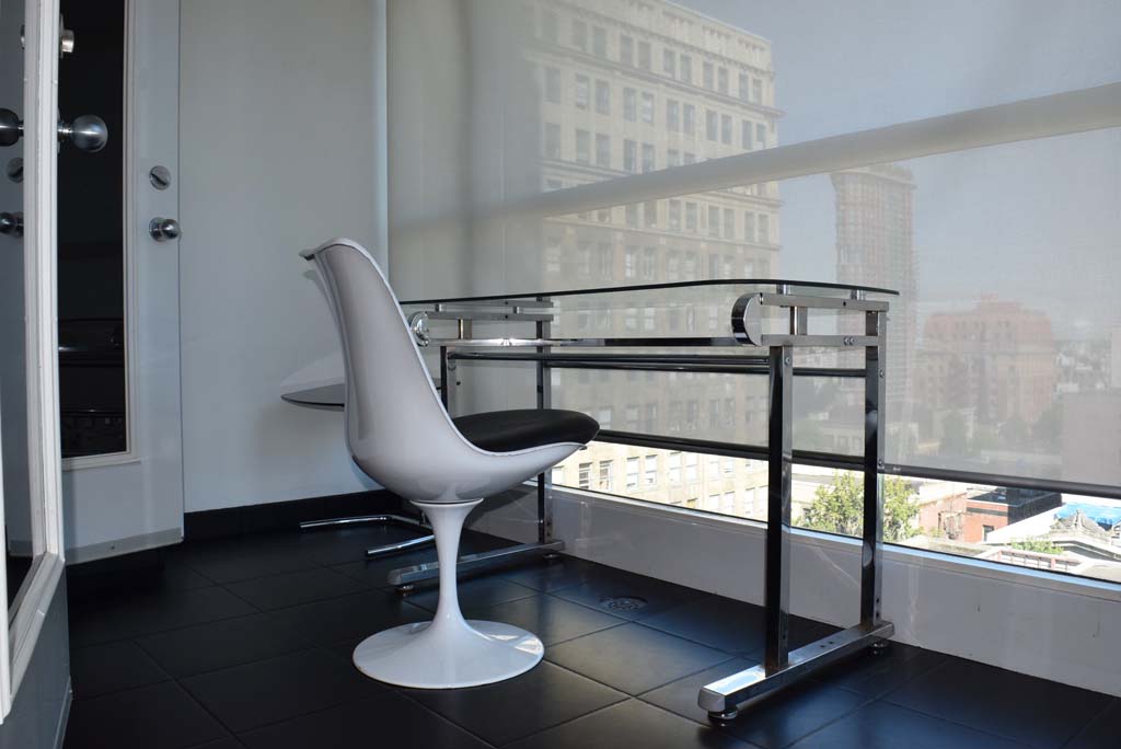 The unit has a living room, kitchen, bathroom in suite, den with desk and chair. The bedroom has a queen size bed, nightstand and closet. The space measures 546 ft² approximately. Parking available by extra cost of 150 CAD