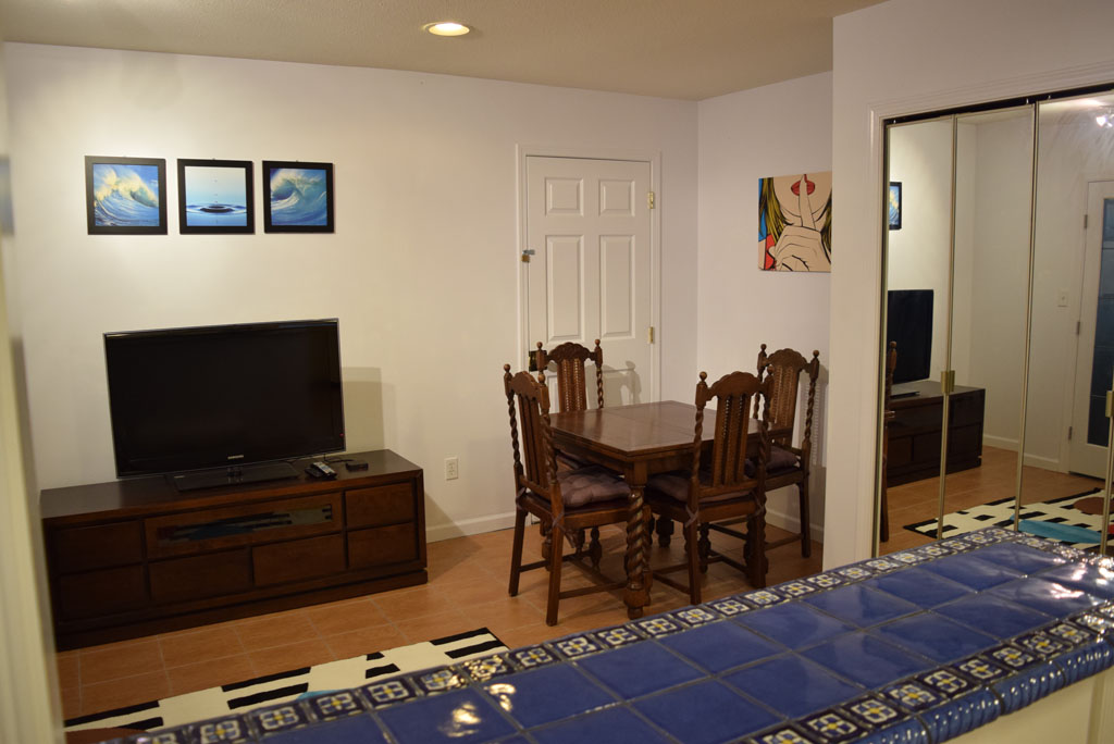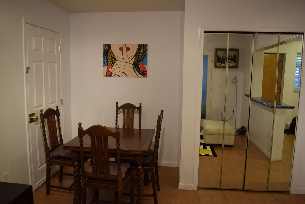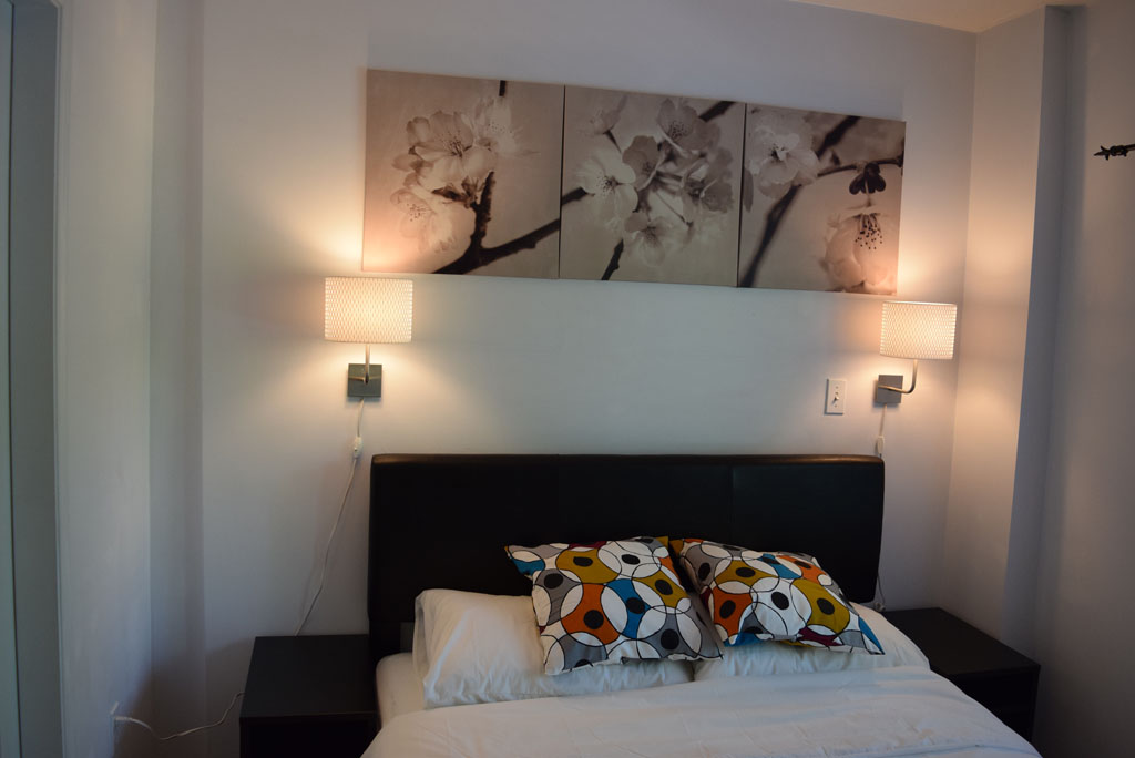 The unit has a living room, kitchen, and bathroom in suite. The bedroom 1 has a queen size bed, nightstand, desk and a wardrobe; the bedroom 2 has a queen size bed, nightstand, closet and drawers. The space measures 800 ft² approximately.