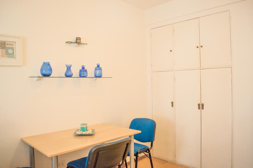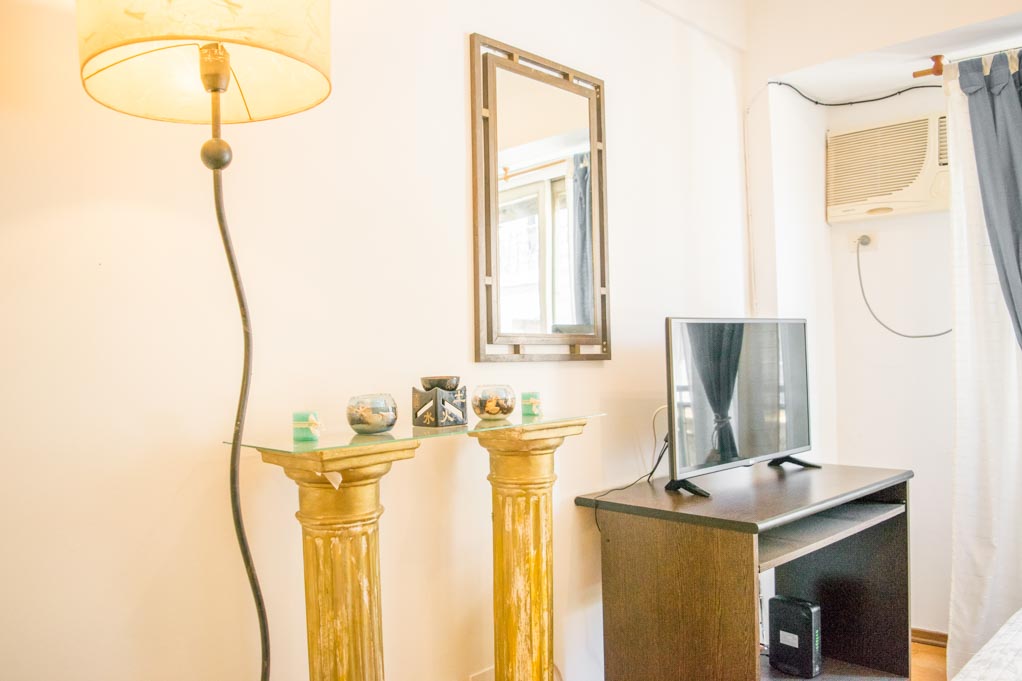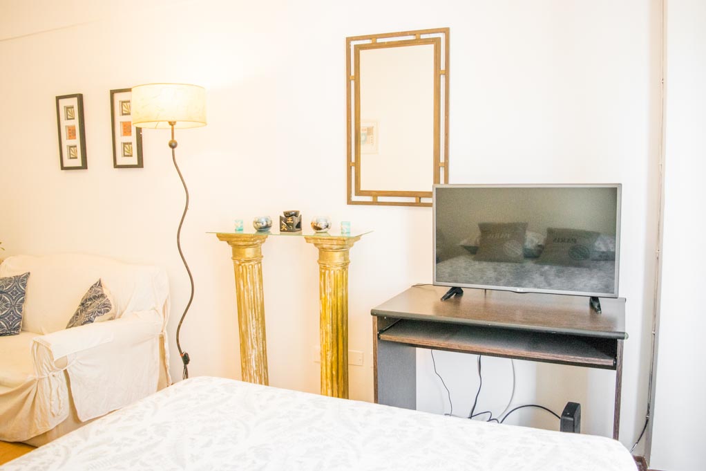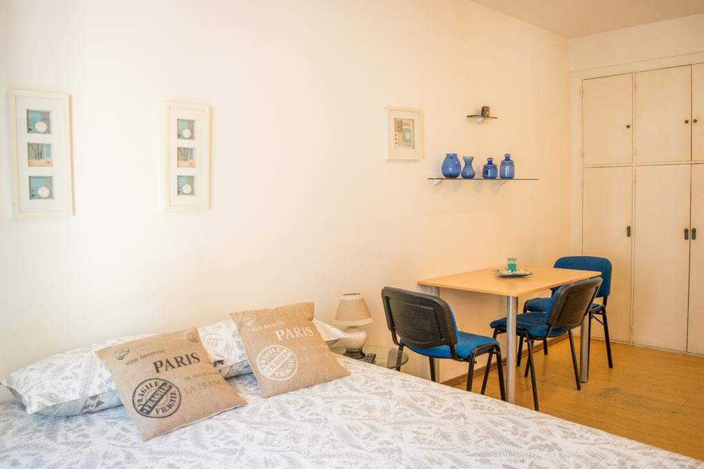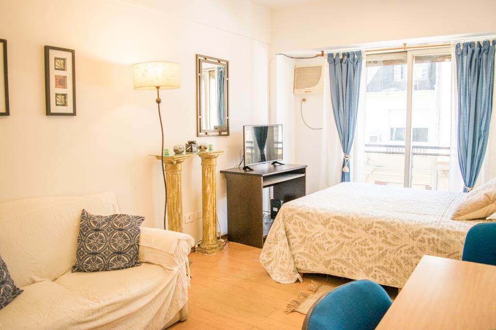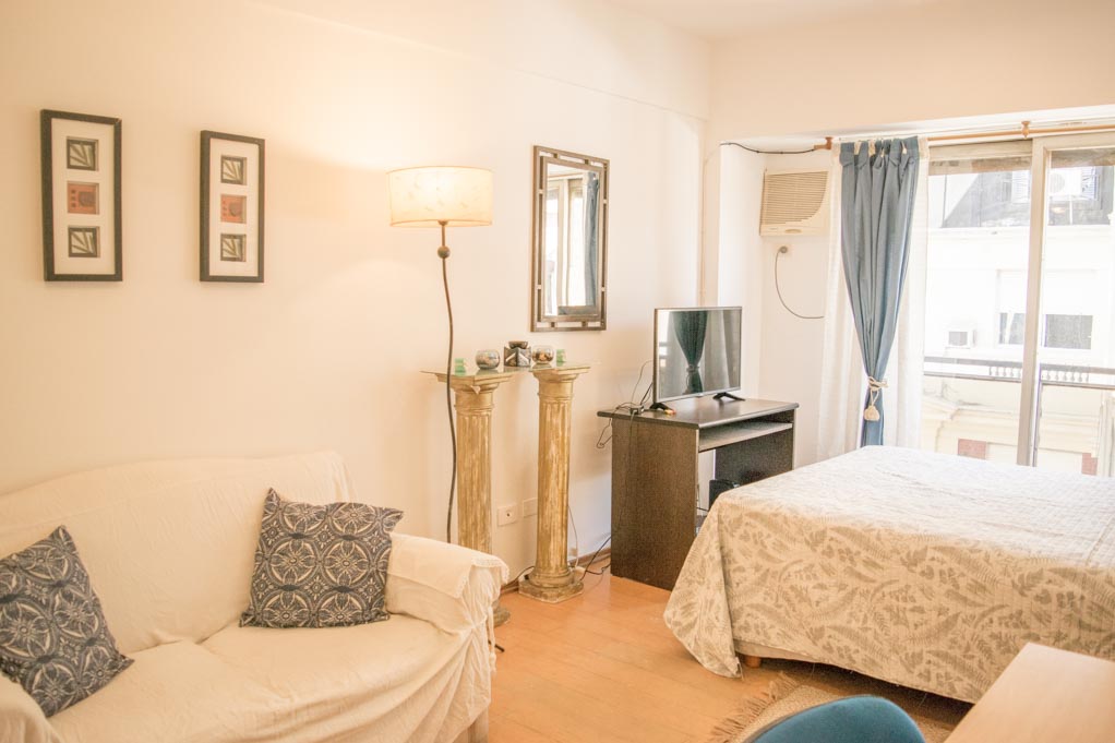 Departamento amoblado de un ambiente (studio) ubicado a 1 minuto caminando de la parada de autobús y a 3 minutos caminando de la Estación de Metro San Martín.El departamento tiene living, comedor, cocina (abierta) y 1 baño. La habitación 1 tiene cama matrimonial, 2 mesas de noche, televisor y escritorio; El lugar mide 25m² aproximadamente. Se debe considerar el pago de gastos de servicios de gastos comunes, agua caliente, agua fría, electricidad, gas, internet, TV cable y calefacción que suman $ 4USD aproximadamente. Se debe pagar garantía (depósito) la que será devuelta al finalizar el período de arriendo.