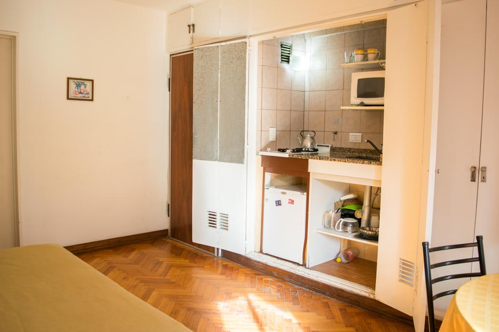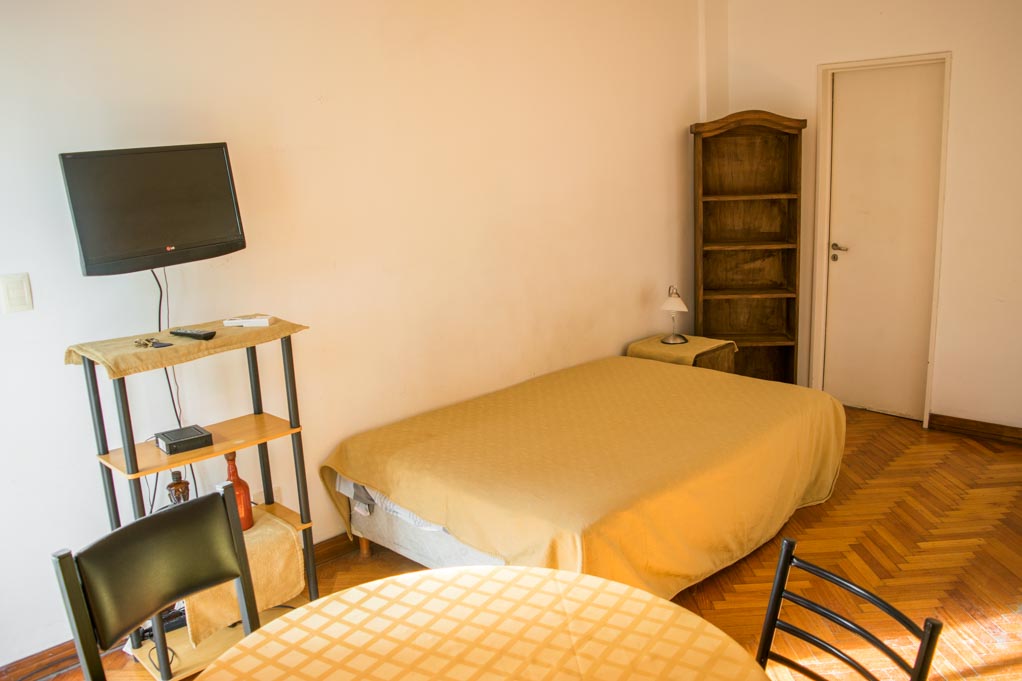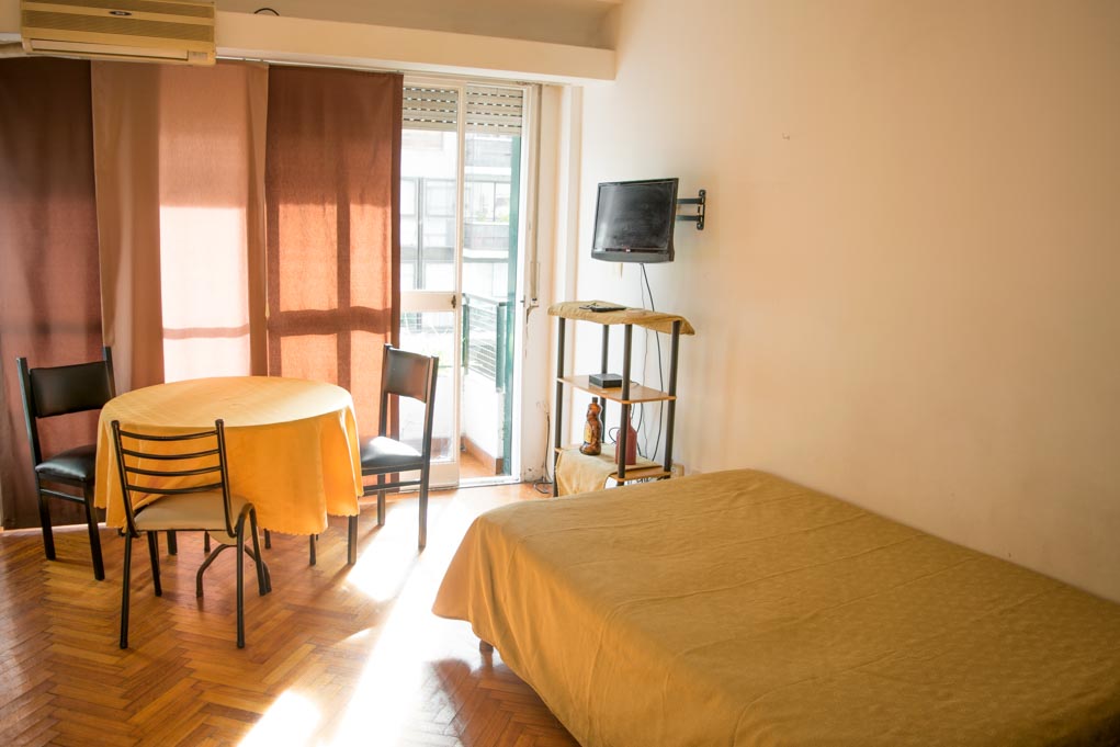 Departamento amoblado de un ambiente (studio) ubicado a 1 minuto caminando de la parada de autobús y a 11 minutos caminando de la Estación de Metro Bulnes.El departamento tiene comedor, cocina (kitchinette), 1 baño y balcón. La habitación 1 tiene cama matrimonial, armario, mesa de noche, televisor, 4 sillas y baño en suite; El lugar mide 28m² + 1m² de terraza aproximadamente. Los gastos de servicios de gastos comunes, agua caliente y agua fría se pagan por adelantado junto a la renta mensual, con un límite de consumo de $ 3USD. Además, se debe considerar el pago de gastos de servicios de electricidad, gas, internet, TV cable y calefacción que suman $ 2USD aproximadamente. Se debe pagar garantía (depósito) la que será devuelta al finalizar el período de arriendo; además, se debe pagar $ 0USD al momento de devolver el alojamiento para realizar la limpieza del lugar. Cerca del alojamiento se encuentra el Parque Las Heras, donde es posible practicar deportes o disfrutar de caminatas al aire libre. En la Av. Santa Fe se encuentran múltiples comercios como bancos, restaurantes, bares, supermercados, diversas tiendas; además, también está el centro comercial Alto Palermo, uno de los más conocidos de la ciudad. También tiene bueno acceso a transporte público.