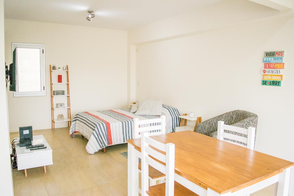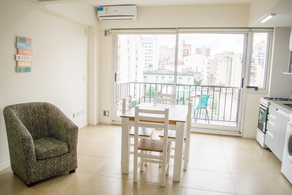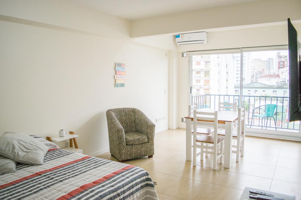 Departamento amoblado de un ambiente (studio) ubicado a 1 minuto caminando de la parada de autobús y a 7 minutos caminando de la Estación de Metro Carlos Gardel.El departamento tiene comedor, cocina (abierta), 1 baño y balcón. La habitación 1 tiene cama matrimonial, armario, 2 mesas de noche, sofá y televisor; El lugar mide 32m² + 3m² de terraza aproximadamente. Los gastos de servicios de gastos comunes, agua caliente, agua fría, electricidad, gas, internet, TV cable y calefacción se pagan por adelantado junto a la renta mensual, con un límite de consumo de $ 140USD. Se debe pagar garantía (depósito) la que será devuelta al finalizar el período de arriendo.