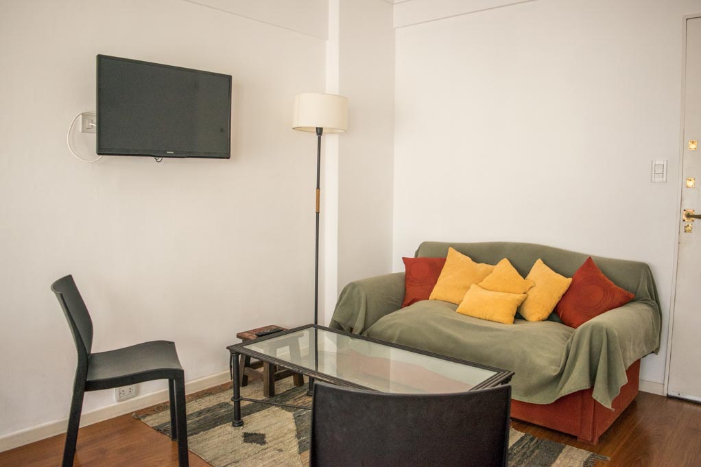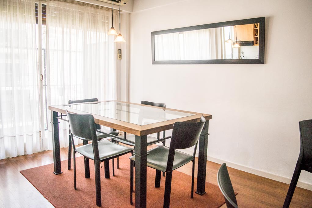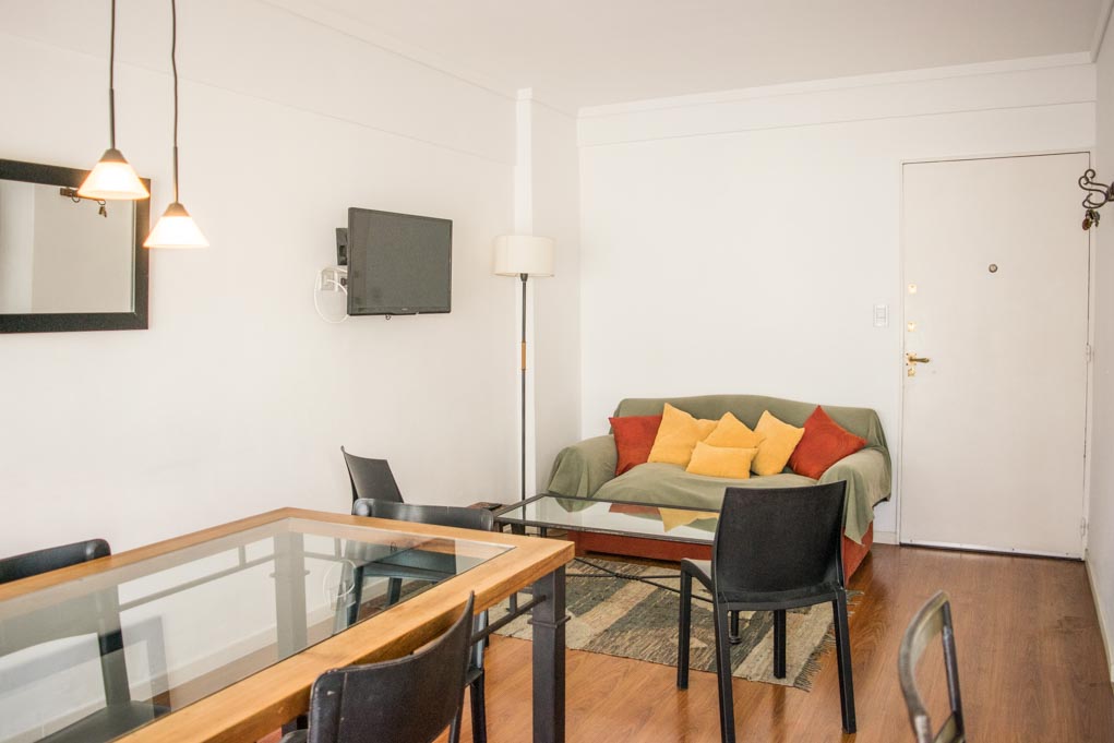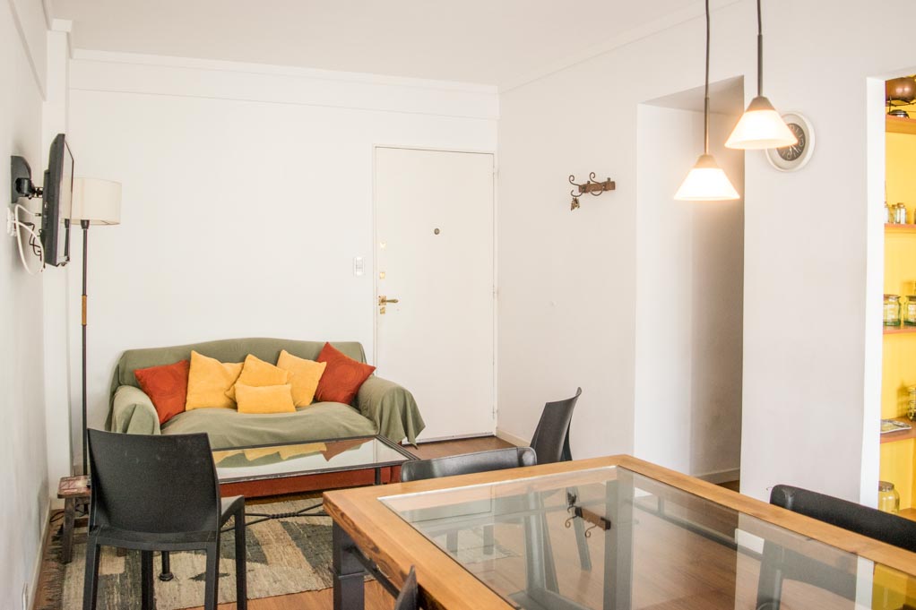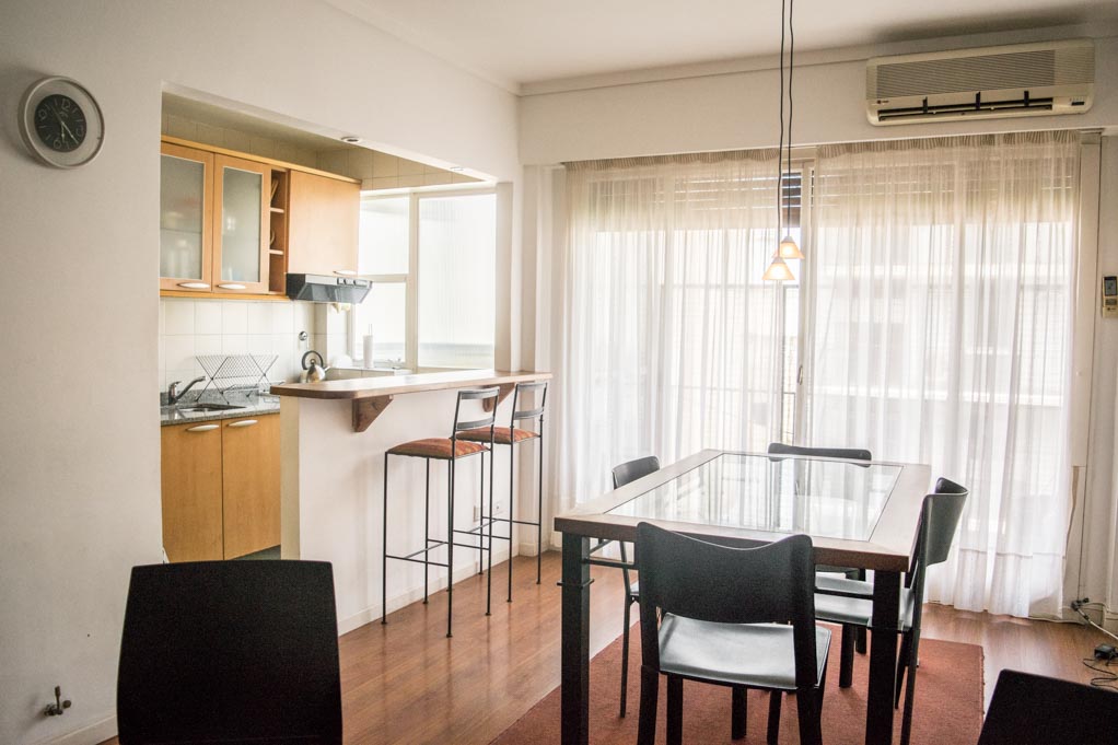 Departamento amoblado de 2 habitaciones ubicado a 1 minuto caminando de la parada de autobús y a 4 minutos caminando de la Estación de Metro Aguero.El departamento tiene living, comedor, cocina (abierta), 1 baño, 1 ½ baño y balcón. La habitación 1 tiene cama matrimonial, armario y 2 mesas de noche; La habitación 2 tiene 2 camas individuales, armario, mesa de noche, escritorio y silla; El lugar mide 57m² + 3m² de terraza aproximadamente. Los gastos de servicios de gastos comunes, agua caliente, agua fría, electricidad, gas, internet, TV cable y calefacción se pagan por adelantado junto a la renta mensual, con un límite de consumo de $ 5USD. Se debe pagar garantía (depósito) la que será devuelta al finalizar el período de arriendo. Cerca del alojamiento se encuentra una gran variedad de comercios, restaurantes, cafeterías y librerías ubicados principalmente en la Avenida Santa Fe. A sólo pasos de la estación de Metro Agüero se encuentra el Museo Xul Solar, con obras de uno de los artistas argentinos más emblemáticos. Además hay múltiples áreas verdes para practicar deportes o disfrutar del aire libre. También cuenta con diversos medios de transporte público a distintas zonas de la ciudad.
