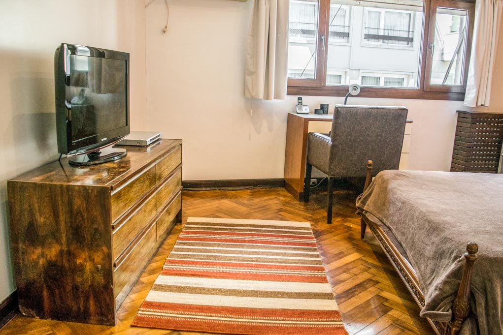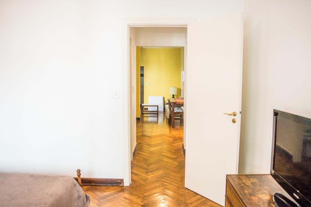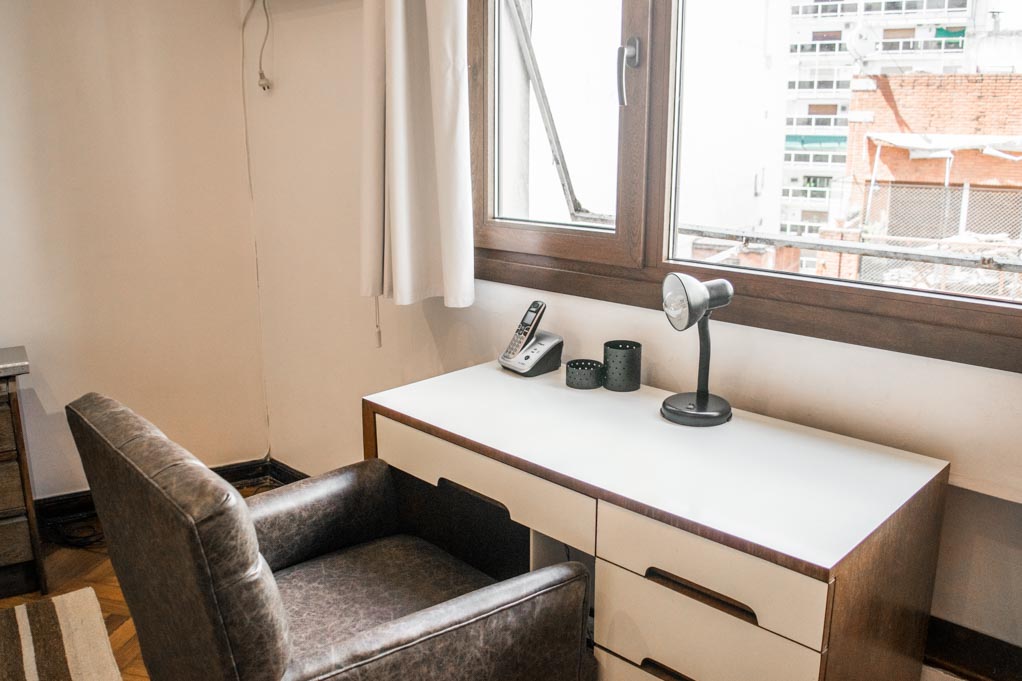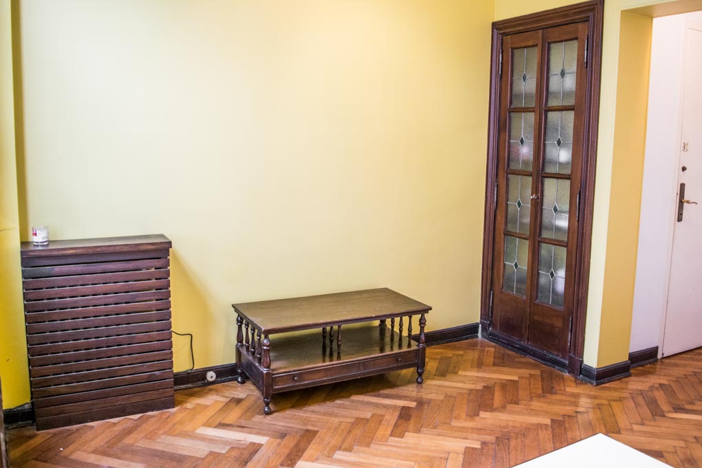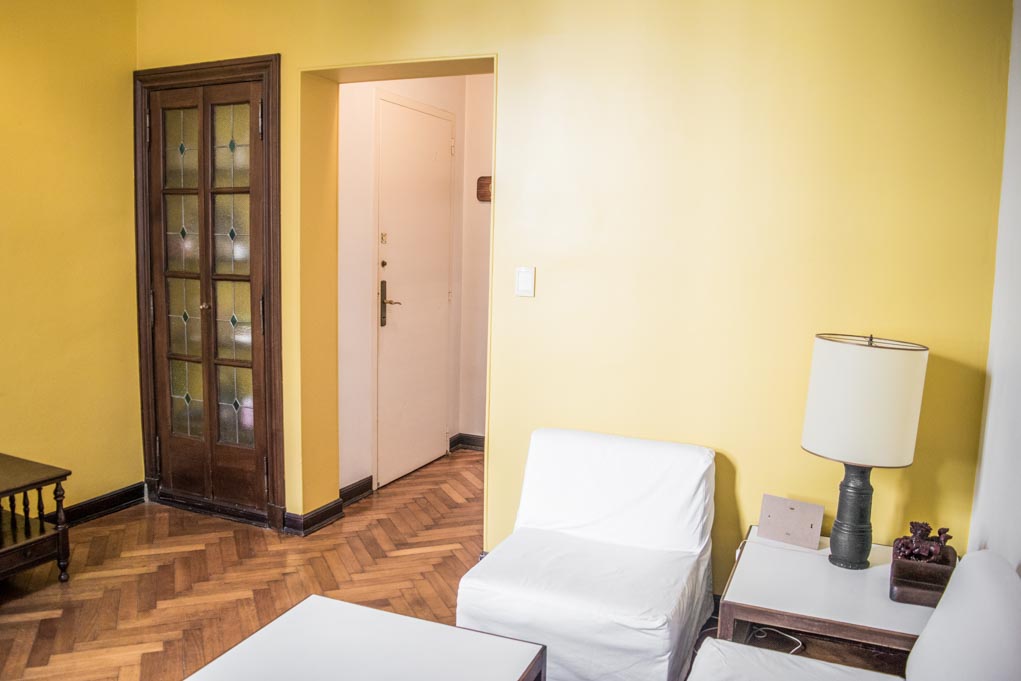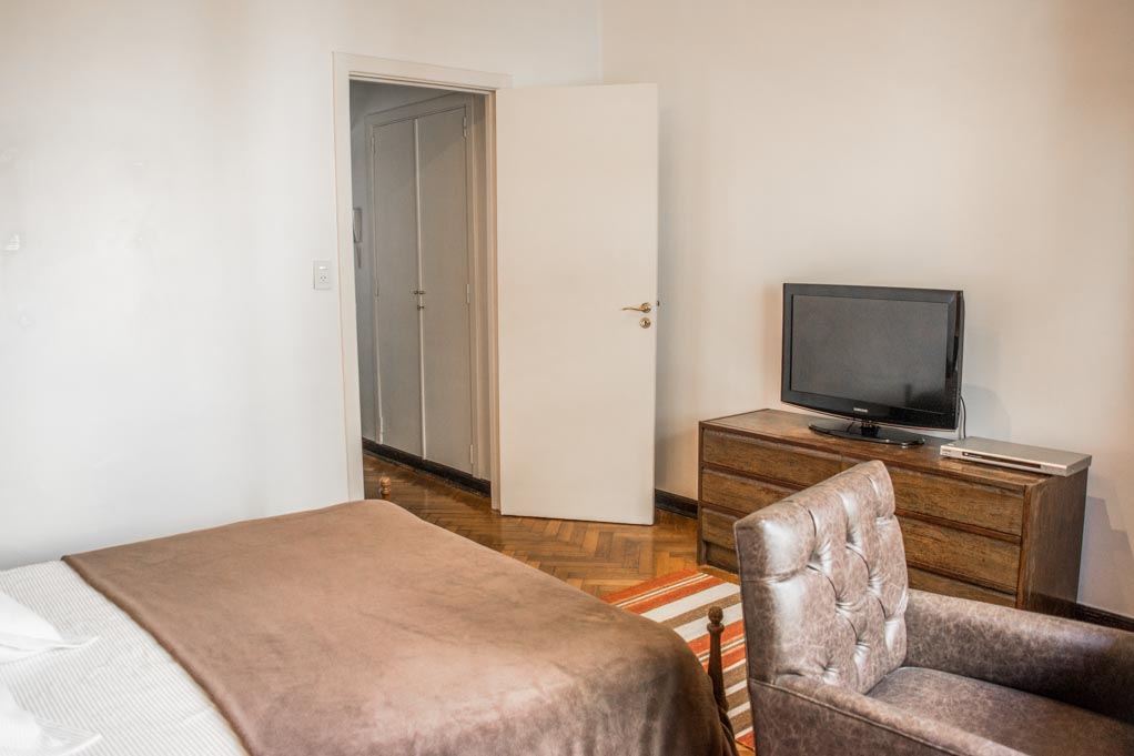 Departamento amoblado de 1 habitación ubicado a 1 minuto caminando de la parada de autobús y a 10 minutos caminando de la Estación de Metro Callao (D).El departamento tiene living, comedor, cocina (cerrada) y 1 baño. La habitación 1 tiene cama matrimonial, armario, cómoda, 2 mesas de noche y televisor; El lugar mide 45m² aproximadamente. Los gastos de servicios de gastos comunes, agua caliente, agua fría, electricidad, gas, internet, TV cable, teléfono, limpieza quincenal y calefacción se pagan por adelantado junto a la renta mensual, con un límite de consumo de $ 165USD. Se debe pagar garantía (depósito) la que será devuelta al finalizar el período de arriendo. Cerca del alojamiento se encuentra el Ateneo Grand Splendid, librería conocida a nivel mundial, donde también se realizan presentaciones de libros y musicales en vivo que se pueden apreciar desde su cafetería. A pocos pasos, se encuentra una gran variedad de teatros, entre ellos el famoso Teatro Colón. Posee edificios y estatuas de gran valor histórico y arquitectónico. Esta localidad se conecta con diversos medios de transporte público.