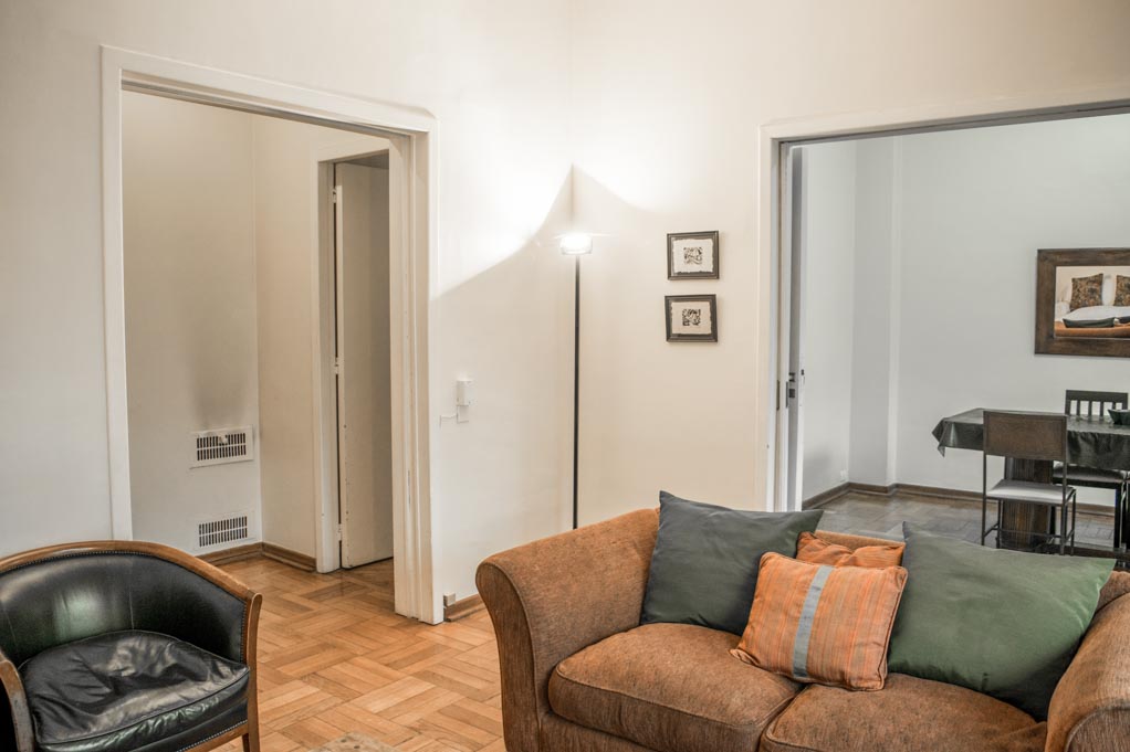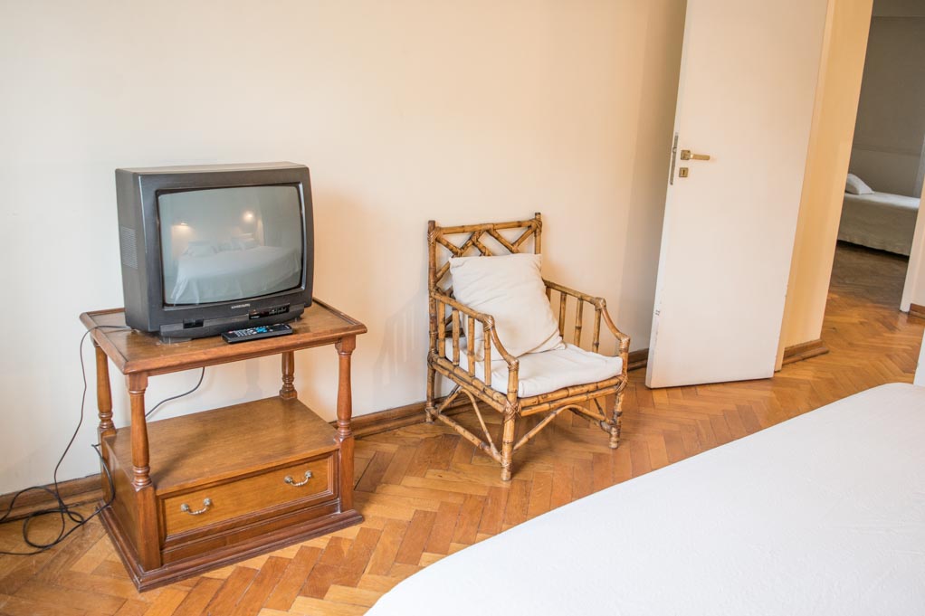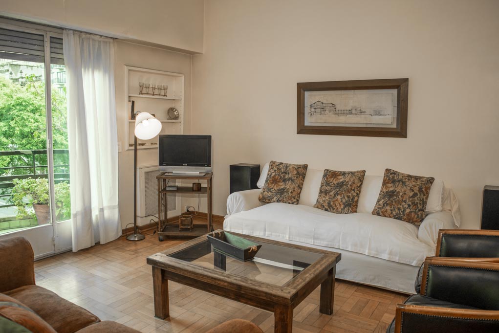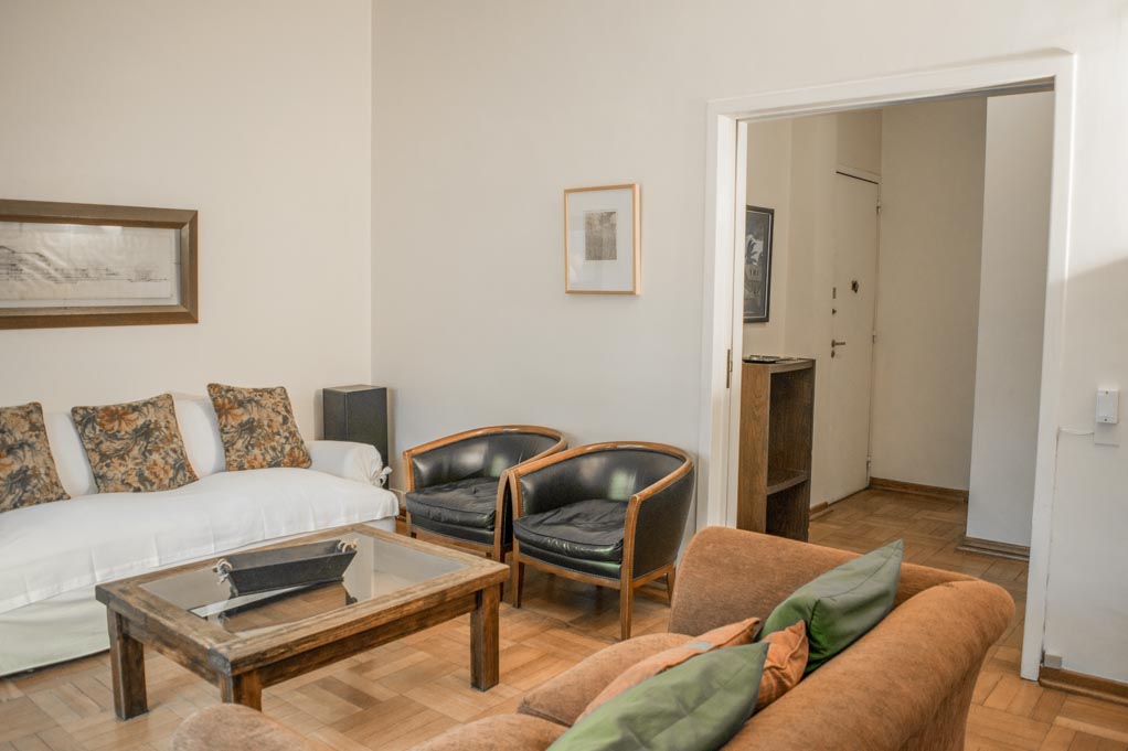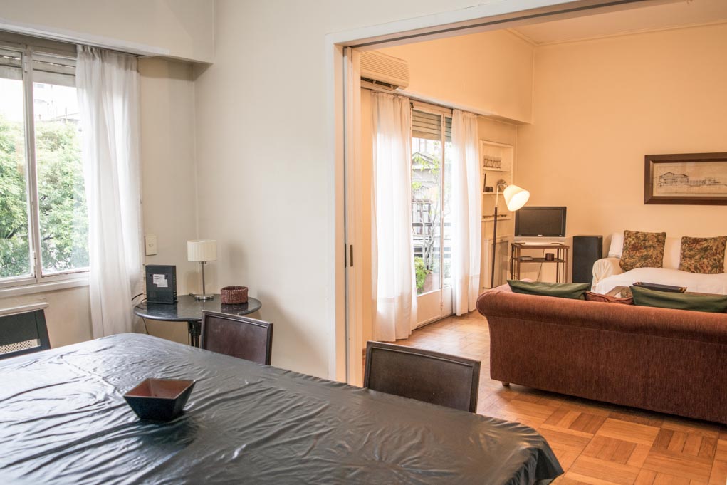 Departamento amoblado de 3 habitaciones ubicado a 2 minutos caminando de la parada de autobús y a 4 minutos caminando de la Estación de Metro Callao (D).El departamento tiene living, comedor, cocina (cerrada), 1 baño y balcón. La habitación 1 tiene cama matrimonial, armario, sofá y televisor; La habitación 2 tiene 2 camas individuales, armario, cómoda y mesa de noche; La habitación 3 tiene cama individual, armario, mesa de noche y sofá; El lugar mide 110m² + 3m² de terraza aproximadamente. Los gastos de servicios de gastos comunes, agua caliente, agua fría, electricidad, gas, internet, TV cable y limpieza semanal se pagan por adelantado junto a la renta mensual, con un límite de consumo de $ 360USD. Se debe pagar garantía (depósito) la que será devuelta al finalizar el período de arriendo. Cerca del alojamiento se encuentra el Ateneo Grand Splendid, librería conocida a nivel mundial, donde también se realizan presentaciones de libros y musicales en vivo que se pueden apreciar desde su cafetería. A pocos pasos, se encuentra una gran variedad de teatros, entre ellos el famoso Teatro Colón. Posee edificios y estatuas de gran valor histórico y arquitectónico. Esta localidad se conecta con diversos medios de transporte público.