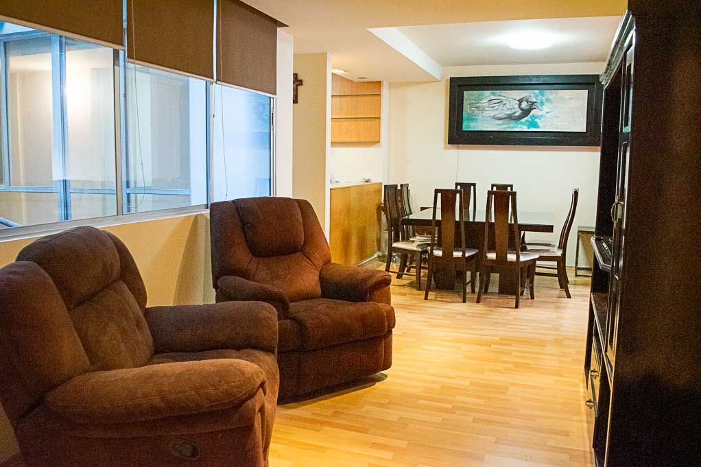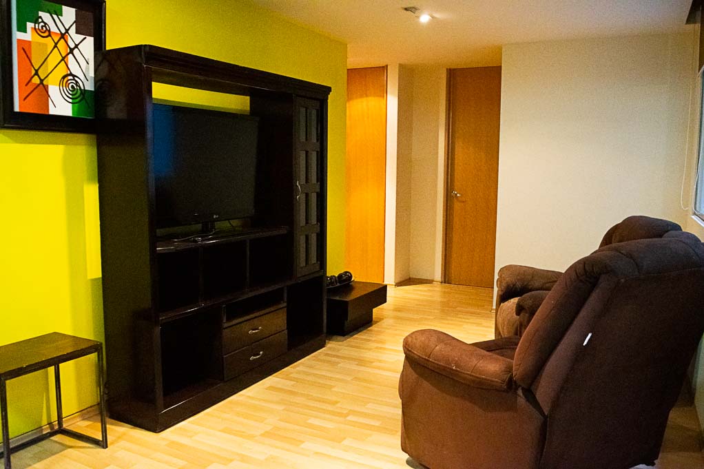 Departamento amoblado de 3 habitaciones ubicado a 3 minutos caminando de la parada de autobús y a 4 minutos caminando de la Estación de Metro Chilpancingo.El departamento tiene living, comedor, cocina (abierta), 2 baños, balcón, sala de TV y 1 estacionamiento. La habitación 1 tiene cama matrimonial, clóset, 2 mesas de noche, televisor y baño en suite; La habitación 2 tiene 2 camas individuales y clóset; La habitación 3 tiene cama matrimonial, clóset, cómoda, mesa de noche, escritorio y silla; El lugar mide 120m² aproximadamente. Los gastos de servicios de mantenimiento se pagan por adelantado junto a la renta mensual, con un límite de consumo de $ 143USD. Además, se debe considerar el pago de gastos de servicios de agua fría, electricidad, gas, internet, TV cable y teléfono que suman $ 70USD aproximadamente. Se debe pagar garantía (depósito) la que será devuelta al finalizar el período de arriendo. Cerca del alojamiento se encuentra un circuito de gastronomía y cafeterías tradicionales del sector. Está ubicada en una zona de centros hospitalarios y de salud. Hay diversos medios de transporte público a distintos puntos de la ciudad, destacando el Metro Chilpancingo.