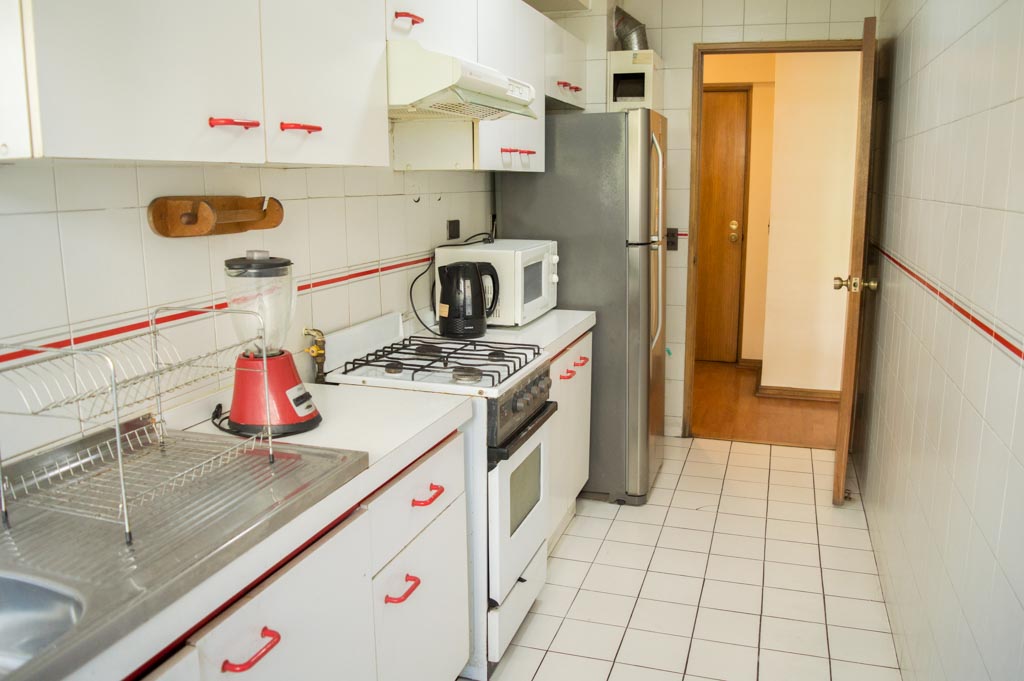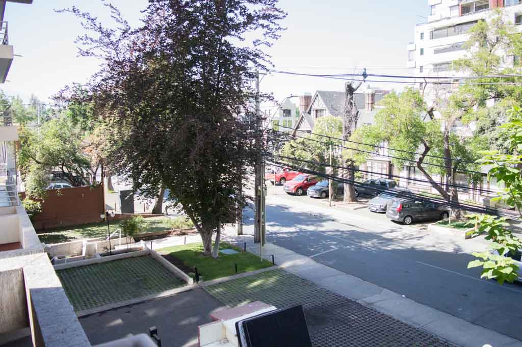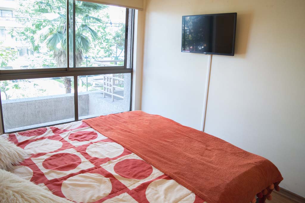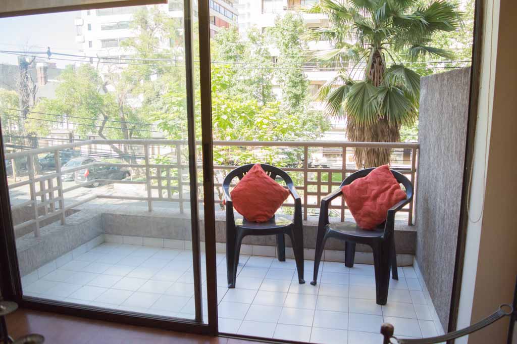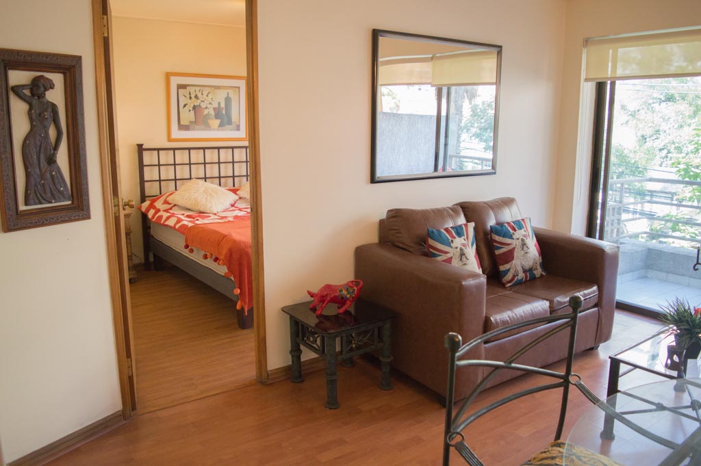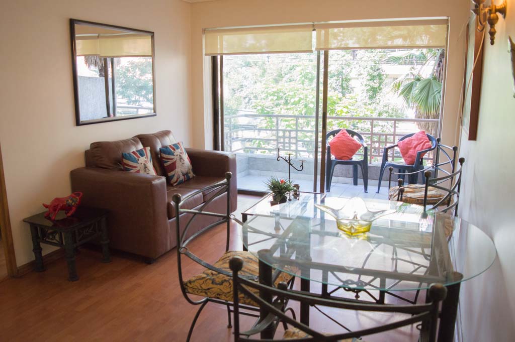 Departamento amoblado de 1 habitación ubicado a 3 minutos caminando de la parada de autobús y a 3 minutos caminando de la Estación de Metro Escuela Militar.El departamento tiene living, comedor, cocina (cerrada), 1 baño y terraza. La habitación 1 tiene cama matrimonial, walk-in clóset, 2 mesas de noche y baño en suite; El lugar mide 45m² aproximadamente. Se debe considerar el pago de gastos de servicios de gastos comunes, agua caliente, agua fría, electricidad y gas que suman $ 119USD aproximadamente. Se debe pagar garantía (depósito) la que será devuelta al finalizar el período de arriendo; además, se debe pagar $ 79USD al momento de devolver el alojamiento para realizar la limpieza del lugar. Cerca del alojamiento se encuentra la Escuela Militar del Libertador Bernardo O'Higgins, instituto encargado de formar oficiales para el Ejército de Chile, además de embajadas, institutos profesionales, colegios, bancos y supermercados; además de diversos medios de transporte público a distintos puntos de la ciudad. En la estación de metro (subsuelo) se encuentra una galería comercial.