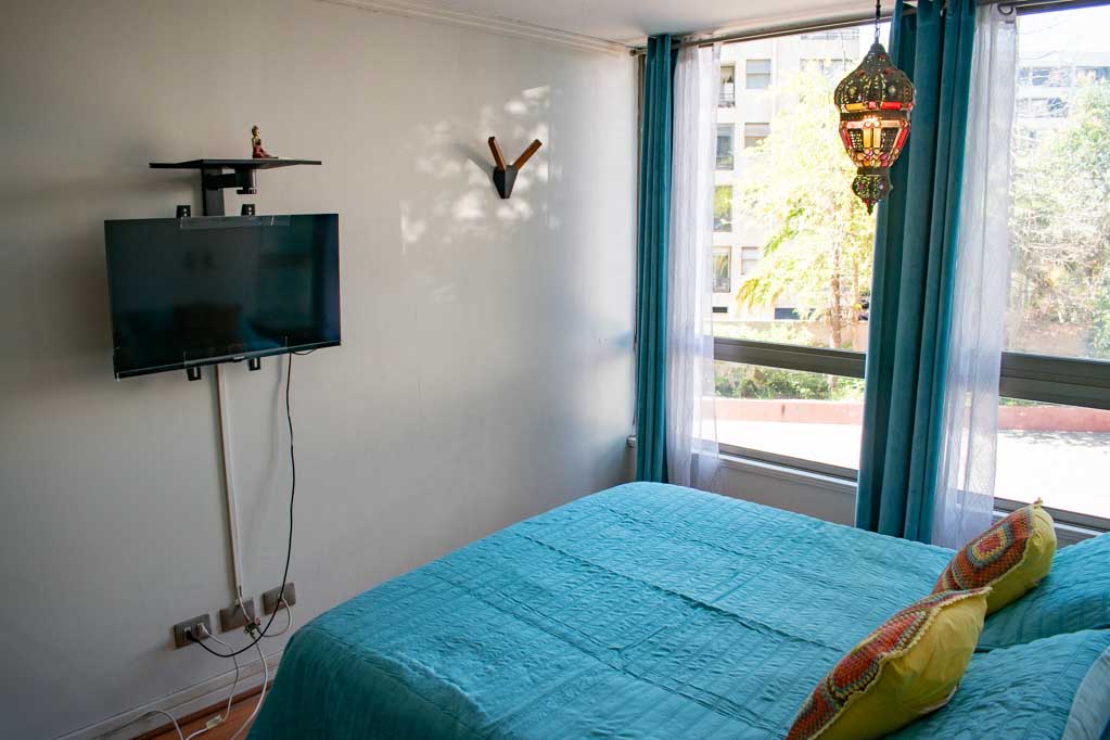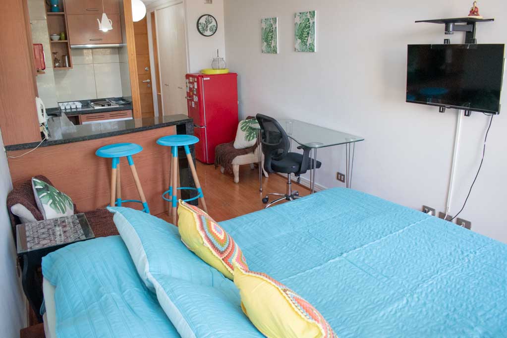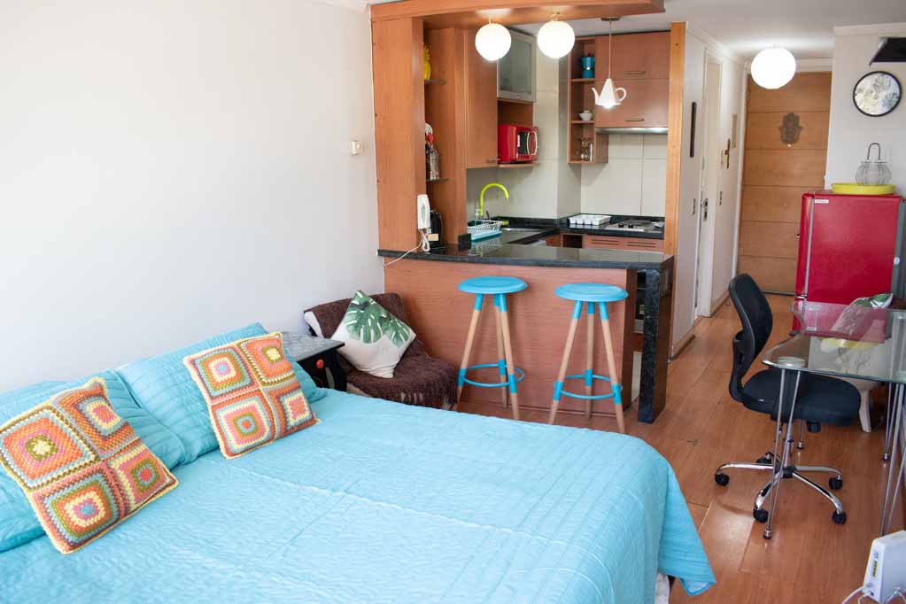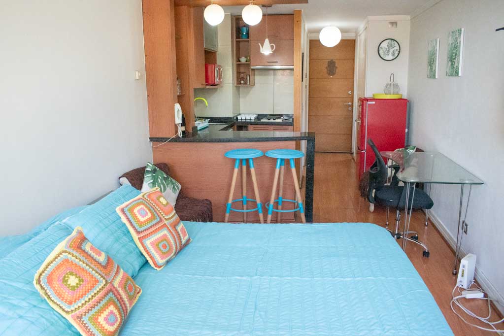 Departamento amoblado de un ambiente (studio) ubicado a 5 minutos caminando de la parada de autobús y a 5 minutos caminando de la Estación de Metro Manquehue.El departamento tiene cocina (cerrada) y 1 baño. La habitación 1 tiene cama matrimonial, sofá cama, walk-in clóset, 2 mesas de noche y baño en suite; El lugar mide 26m² aproximadamente. Los gastos de servicios de gastos comunes, agua caliente, agua fría, electricidad e internet se pagan por adelantado junto a la renta mensual, con un límite de consumo de $ 173USD. El alojamiento tiene lavandería compartida cuyo valor es $ 2USD aproximadamente por carga de ropa (lavado o secado). Se debe pagar garantía (depósito) la que será devuelta al finalizar el período de arriendo; además, se debe pagar $ 46USD al momento de devolver el alojamiento para realizar la limpieza del lugar. Cerca del alojamiento se encuentra el Parque Araucano, 30 hectáreas de áreas verdes, donde es posible descansar rodeado de árboles y jardines, además de practicar una amplia variedad de deportes como correr, andar en bicicleta, patinar, nadar, entre otros. En el también podrás disfrutar de centros de eventos, librerías, restaurantes, cafés y el centro de entretenciones para niños. En el sector se encuentra uno de los primeros centros comerciales de Chile, Apumanque.