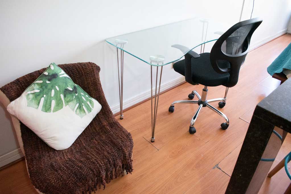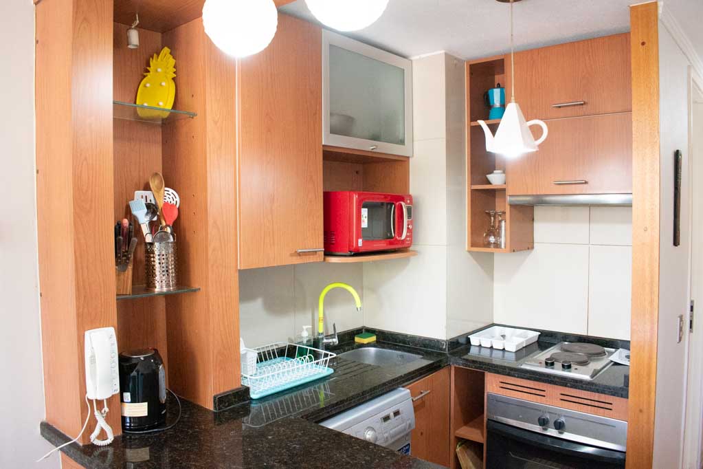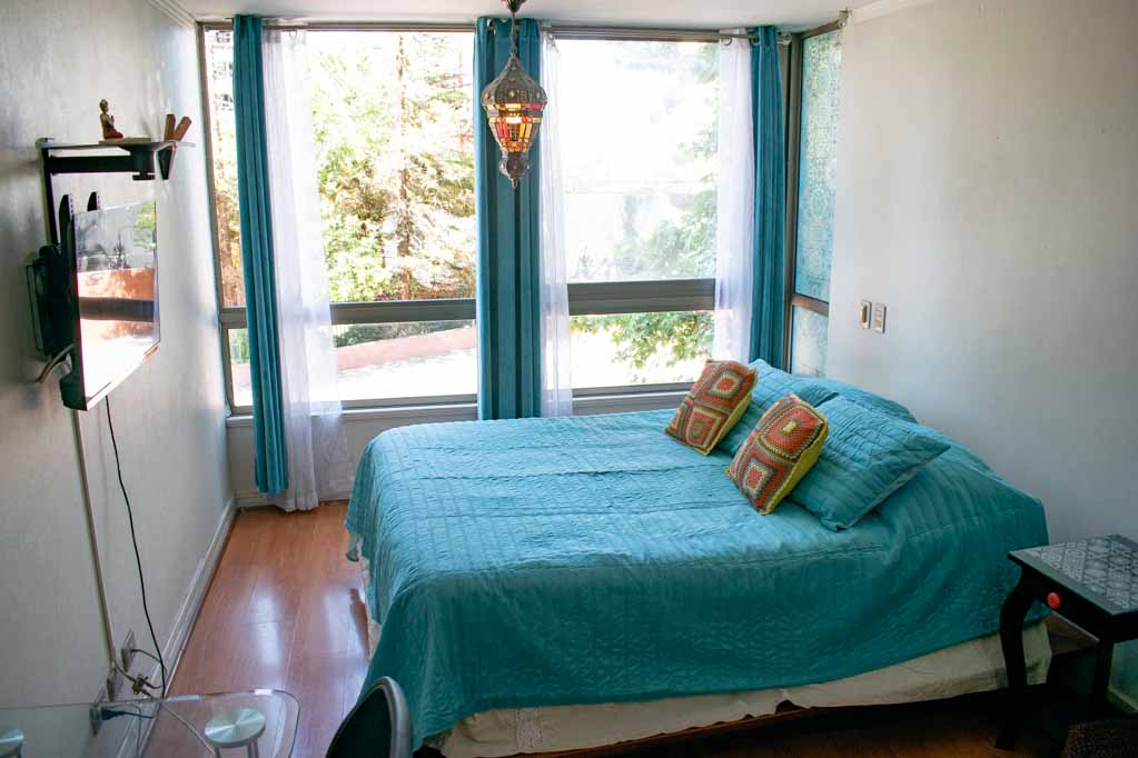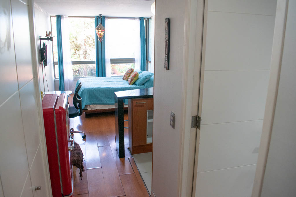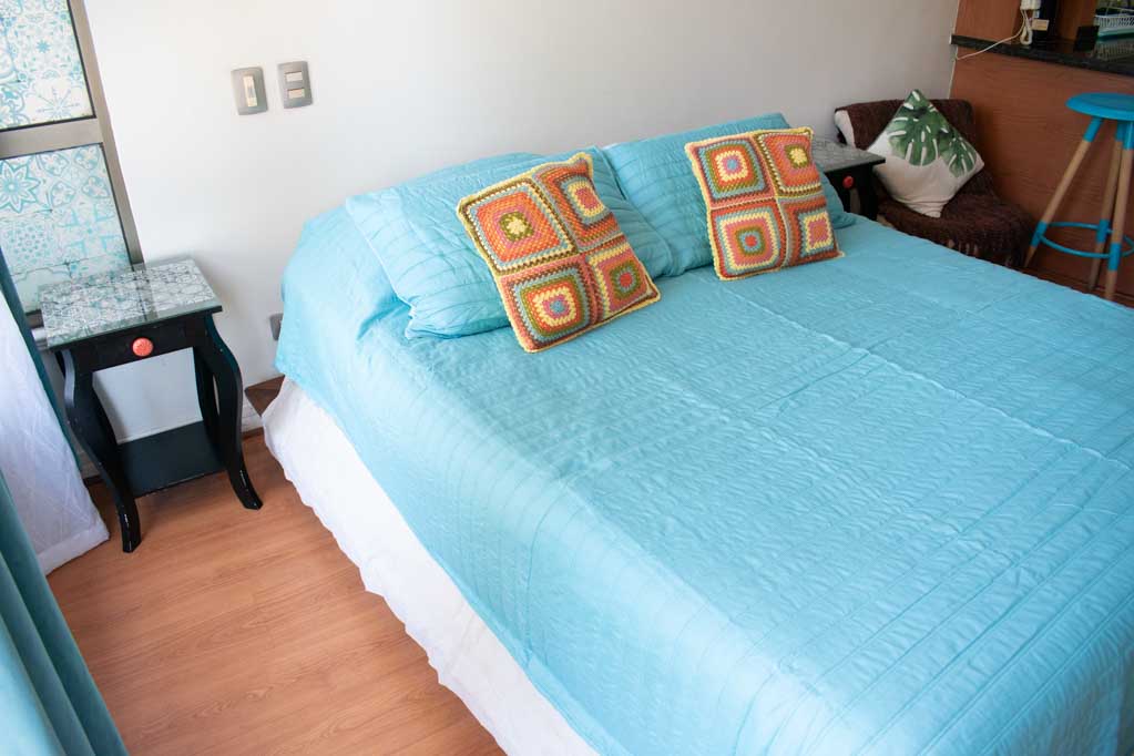 Departamento amoblado de un ambiente (studio) ubicado a 5 minutos caminando de la parada de autobús y a 5 minutos caminando de la Estación de Metro Manquehue.El departamento tiene cocina (cerrada) y 1 baño. La habitación 1 tiene cama matrimonial, sofá cama, walk-in clóset, 2 mesas de noche y baño en suite; El lugar mide 26m² aproximadamente. Los gastos de servicios de gastos comunes, agua caliente, agua fría, electricidad e internet se pagan por adelantado junto a la renta mensual, con un límite de consumo de $ 173USD. El alojamiento tiene lavandería compartida cuyo valor es $ 2USD aproximadamente por carga de ropa (lavado o secado). Se debe pagar garantía (depósito) la que será devuelta al finalizar el período de arriendo; además, se debe pagar $ 46USD al momento de devolver el alojamiento para realizar la limpieza del lugar. Cerca del alojamiento se encuentra el Parque Araucano, 30 hectáreas de áreas verdes, donde es posible descansar rodeado de árboles y jardines, además de practicar una amplia variedad de deportes como correr, andar en bicicleta, patinar, nadar, entre otros. En el también podrás disfrutar de centros de eventos, librerías, restaurantes, cafés y el centro de entretenciones para niños. En el sector se encuentra uno de los primeros centros comerciales de Chile, Apumanque.