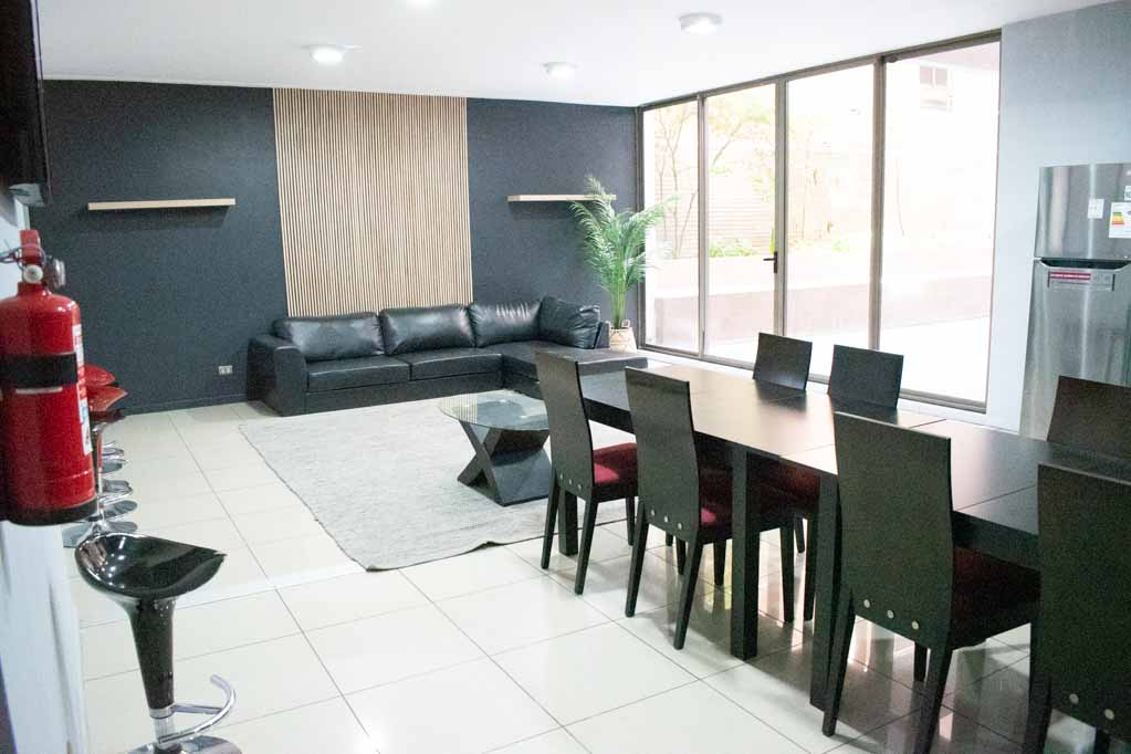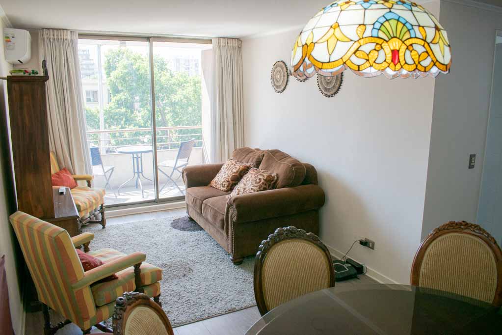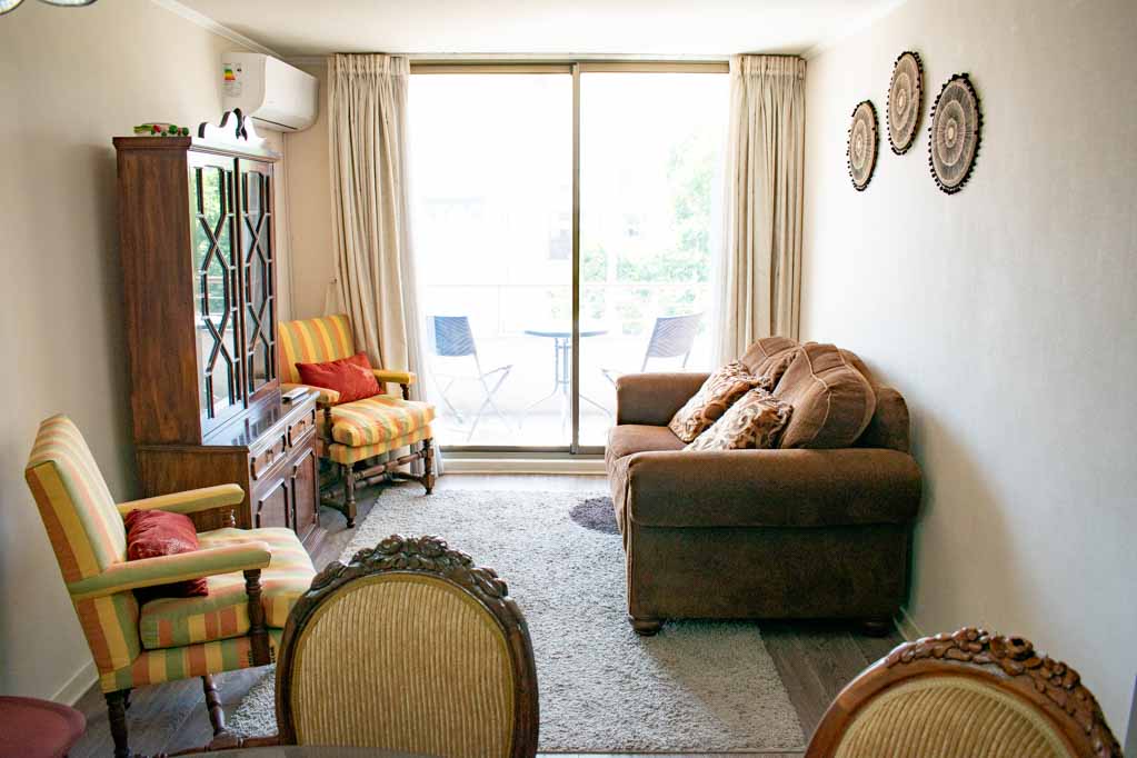Departamento amoblado de 2 habitaciones ubicado a 2 minutos caminando de la parada de autobús y a 2 minutos caminando de la Estación de Metro Chile España.El departamento tiene living, comedor, cocina (cerrada), 2 baños, terraza y 1 estacionamiento. La habitación 1 tiene cama matrimonial, walk-in clóset, 2 mesas de noche y baño en suite; La habitación 2 tiene cama nido, clóset y mesa de noche; El lugar mide 62m² + 4m² de terraza aproximadamente. Se debe considerar el pago de gastos de servicios de gastos comunes, agua caliente, agua fría y electricidad que suman $ 204USD aproximadamente. El alojamiento tiene lavandería compartida cuyo valor es $ 2USD aproximadamente por carga de ropa (lavado o secado). Se debe pagar garantía (depósito) la que será devuelta al finalizar el período de arriendo; además, se debe pagar $ 44USD al momento de devolver el alojamiento para realizar la limpieza del lugar. Cerca del alojamiento se encuentra la Plaza Ñuñoa, Municipalidad de Ñuñoa, centros culturales tales como el Teatro de la Universidad Católica (Teatro Dante) y la tradicional pérgola de la Plaza Ñuñoa punto de encuentro de los residentes y turistas. El lugar se caracteriza por su identidad llena de vida y la gran variedad de bares y restoranes.