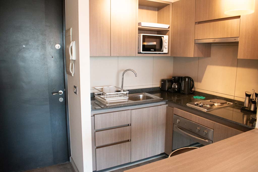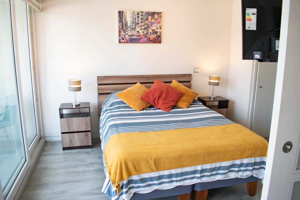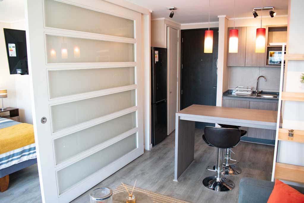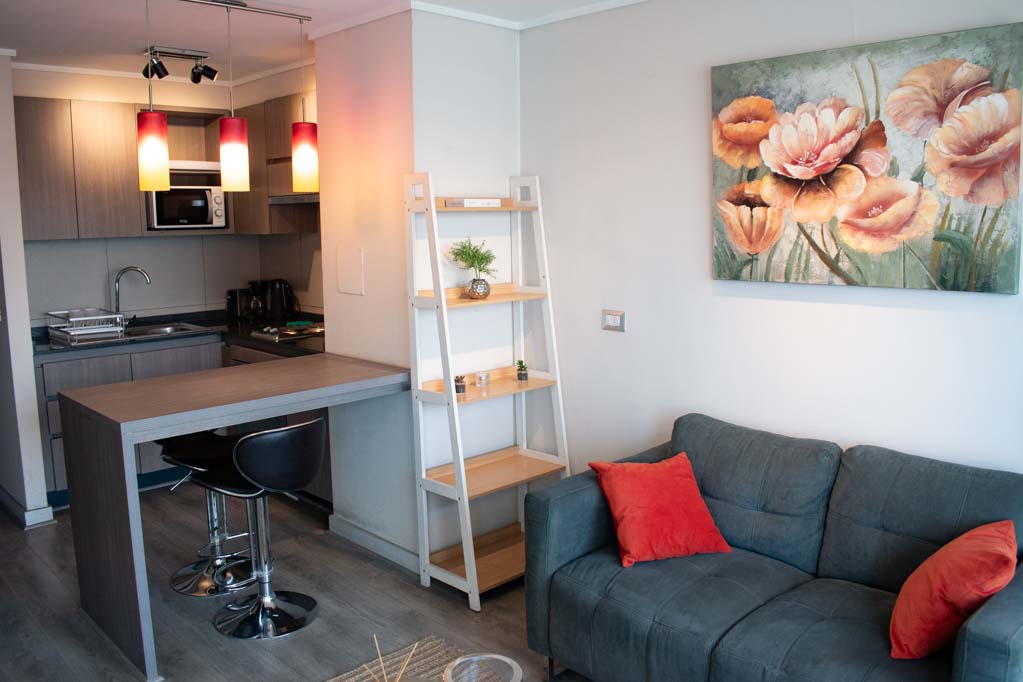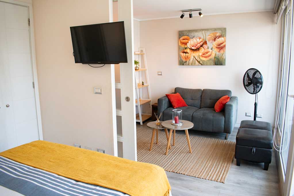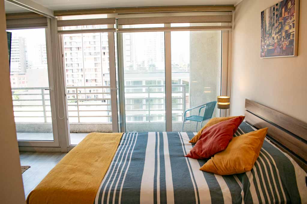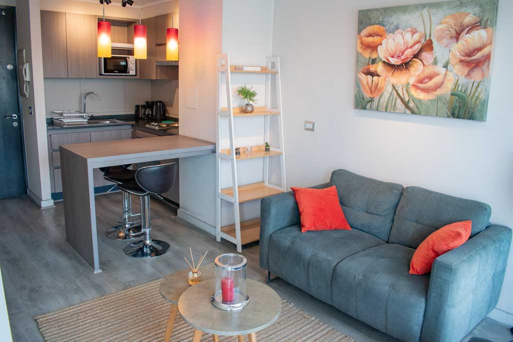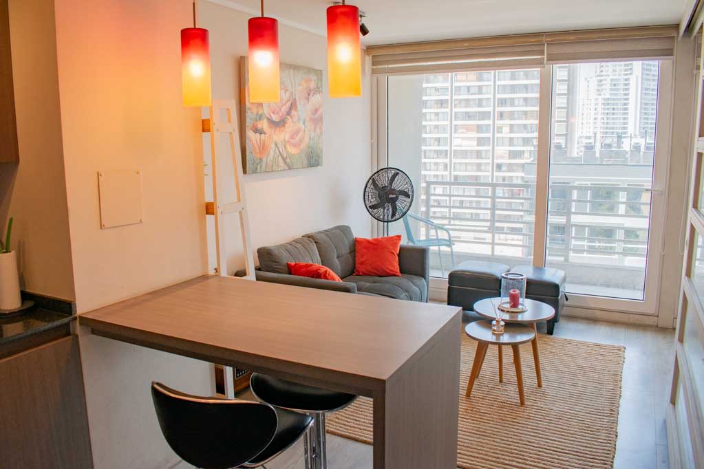 Departamento amoblado de 1 habitación ubicado a 4 minutos caminando de la parada de autobús y a 4 minutos caminando de la Estación de Metro Irarrázaval.El departamento tiene living, comedor, cocina (abierta), 1 baño y terraza. La habitación 1 tiene cama matrimonial, clóset, 2 mesas de noche, televisor y baño en suite; El lugar mide 38m² + 4m² de terraza aproximadamente. Los gastos de servicios de gastos comunes, agua caliente, agua fría, electricidad e internet se pagan por adelantado junto a la renta mensual, con un límite de consumo de $ 192USD. El alojamiento tiene lavandería compartida cuyo valor es $ 2USD aproximadamente por carga de ropa (lavado o secado). Se debe pagar garantía (depósito) la que será devuelta al finalizar el período de arriendo; además, se debe pagar $ 45USD al momento de devolver el alojamiento para realizar la limpieza del lugar. Cerca del alojamiento se encuentra la Avenida Irarrázaval, una de las arterias principales de Santiago, caracterizada por sus diversos locales comerciales, supermercados, restaurantes, pubs y discotecas. Además posee variados medios de transporte público a distintos puntos de la ciudad.