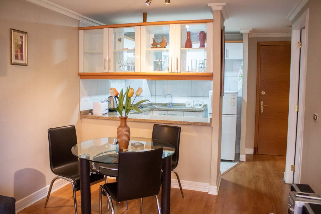 Departamento amoblado de 1 habitación ubicado a 5 minutos caminando de la parada de autobús y a 5 minutos caminando de la Estación de Metro Cristóbal Colón.El departamento tiene living, comedor, cocina (abierta), 1 baño, terraza y 1 estacionamiento. La habitación 1 tiene cama matrimonial, clóset, cómoda, 2 mesas de noche, televisor y baño en suite; El lugar mide 40m² + 3m² de terraza aproximadamente. Se debe considerar el pago de gastos de servicios de gastos comunes, agua caliente, agua fría, electricidad y gas que suman $ 121USD aproximadamente. El alojamiento tiene lavandería compartida cuyo valor es $ 1USD aproximadamente por carga de ropa (lavado o secado). Se debe pagar garantía (depósito) la que será devuelta al finalizar el período de arriendo; además, se debe pagar $ 55USD al momento de devolver el alojamiento para realizar la limpieza del lugar. Cerca del alojamiento se encuentra la Avenida Cristóbal Colón y Avenida Tobalaba, ambas con bastante tránsito debido a que conectan gran parte de la ciudad; en ellas encontrarás diversos medios de transporte público, farmacias, supermercados, restaurantes y cafés. El lugar está emplazado en un barrio residencial y tranquilo.