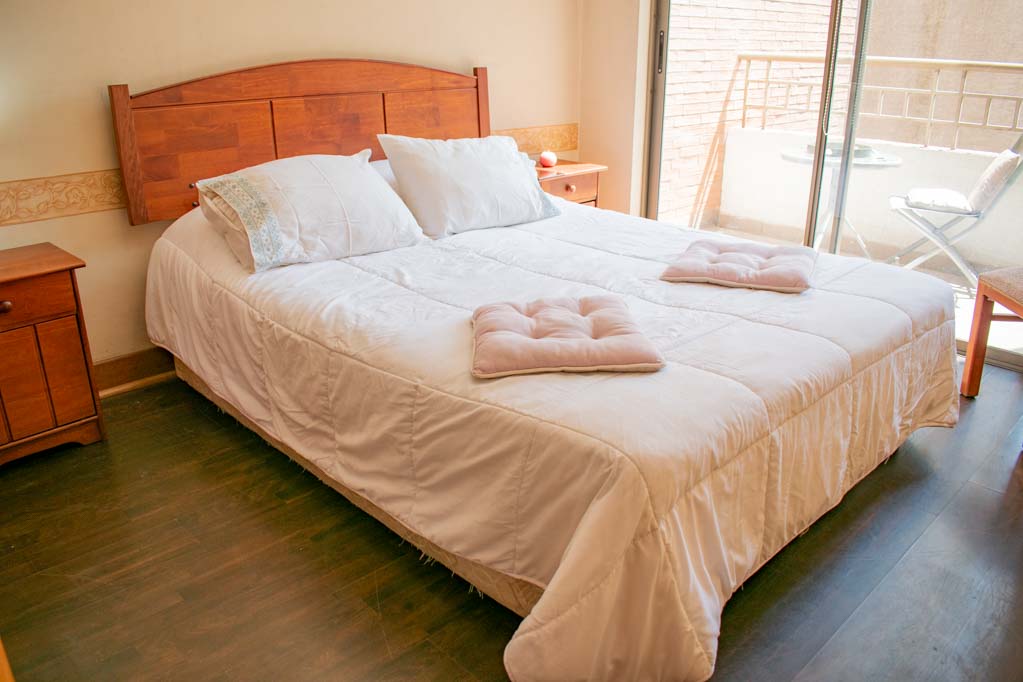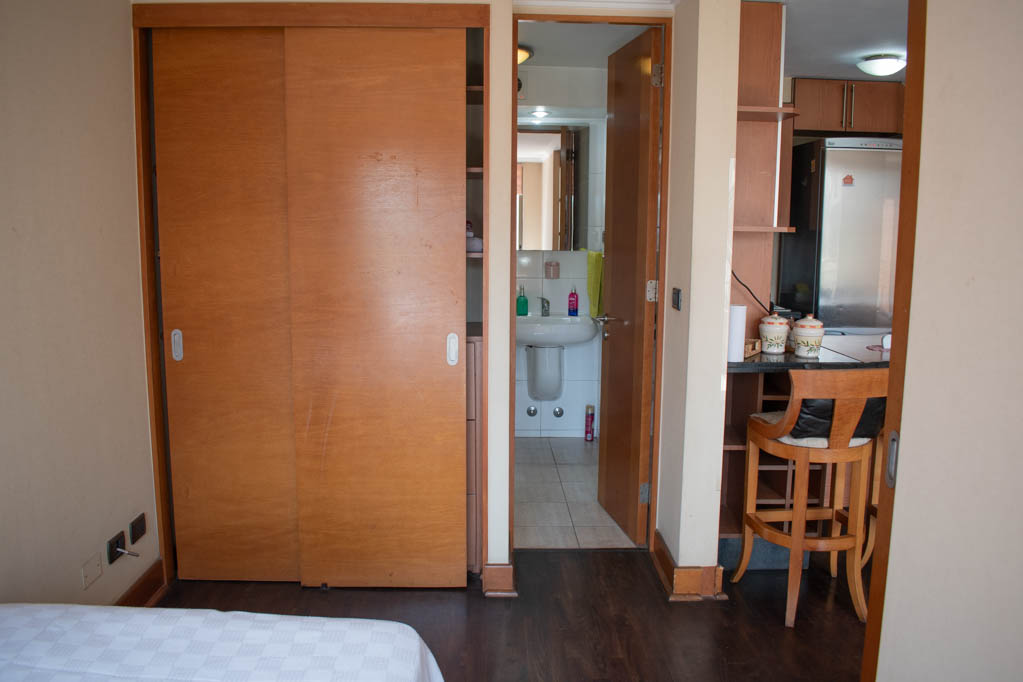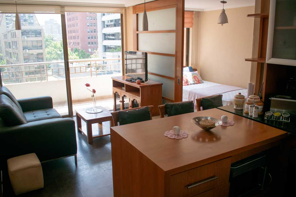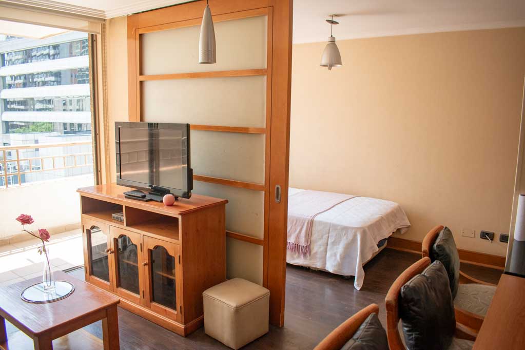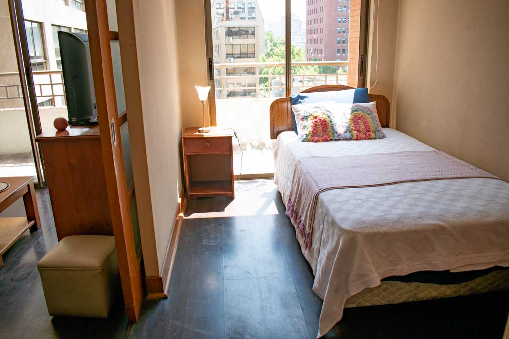 Departamento amoblado de 2 habitaciones ubicado a 5 minutos caminando de la parada de autobús y a 7 minutos caminando de la Estación de Metro Pedro de Valdivia.El departamento tiene living, comedor, cocina (abierta), 2 baños y terraza. La habitación 1 tiene cama matrimonial, clóset, 2 mesas de noche y baño en suite; La habitación 2 tiene cama individual, clóset y baño en suite; El lugar mide 50m² aproximadamente. Los gastos de servicios de gastos comunes, agua caliente, agua fría, electricidad, gas e internet se pagan por adelantado junto a la renta mensual, con un límite de consumo de $ 249USD. El alojamiento tiene lavandería compartida cuyo valor es $ 2USD aproximadamente por carga de ropa (lavado o secado). Se debe pagar garantía (depósito) la que será devuelta al finalizar el período de arriendo; además, se debe pagar $ 81USD al momento de devolver el alojamiento para realizar la limpieza del lugar. Cerca del alojamiento se encuentra la Avenida Providencia donde se encuentran diferentes locales comerciales, bancos, supermercados, restoranes, cafeterías, bares, y locomoción hacia distintos punto de la capital. A pasos podrás encontrar la iglesia de la divina providencia, monumento nacional y, el parque de las esculturas, con obras de diversos artistas y agradables áreas verdes.