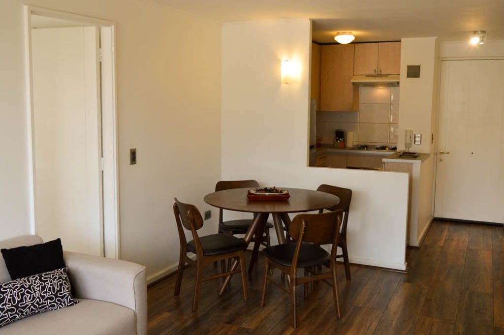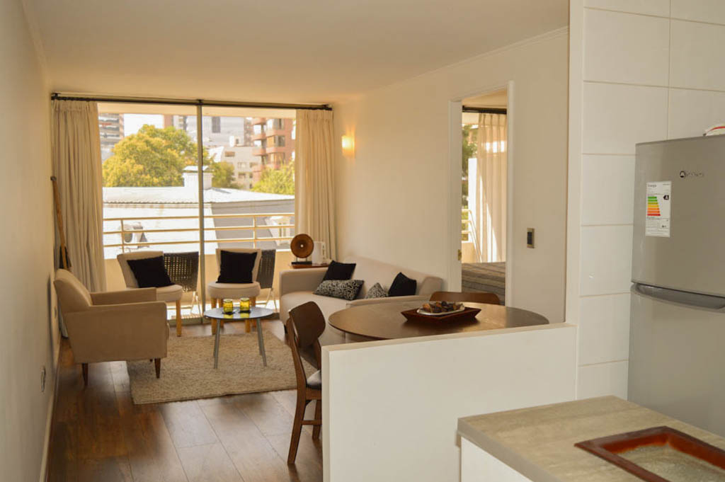 Departamento amoblado de 1 habitación ubicado a 5 minutos caminando de la parada de autobús y a 6 minutos caminando de la Estación de Metro Los Leones.El departamento tiene 1 estacionamiento. La habitación 1 tiene cama matrimonial; El lugar mide 43m² + 9m² de terraza aproximadamente. Los gastos de servicios de gastos comunes, agua caliente, agua fría, electricidad, gas, internet y TV cable se pagan por adelantado junto a la renta mensual, con un límite de consumo de $ 256USD. El alojamiento tiene lavandería compartida cuyo valor es $ 1USD aproximadamente por carga de ropa (lavado o secado). Se debe pagar garantía (depósito) la que será devuelta al finalizar el período de arriendo; además, se debe pagar $ 44USD al momento de devolver el alojamiento para realizar la limpieza del lugar. Cerca del alojamiento se encuentra la Avenida Nueva Providencia y la Avenida Providencia (el corazón de Providencia) donde es posible encontrar tiendas comerciales, bancos, gimnasios, supermercados y medios de transporte público. A pasos se encuentra el conocido Mall Costanera Center, el centro comercial más grande y moderno de Latinoamérica.