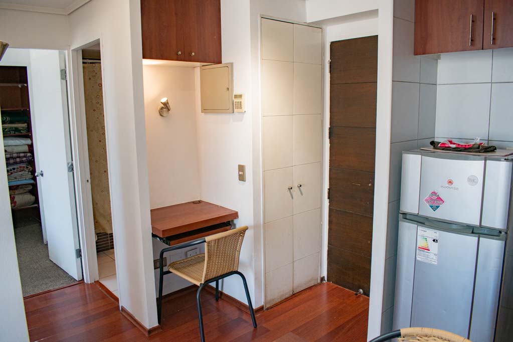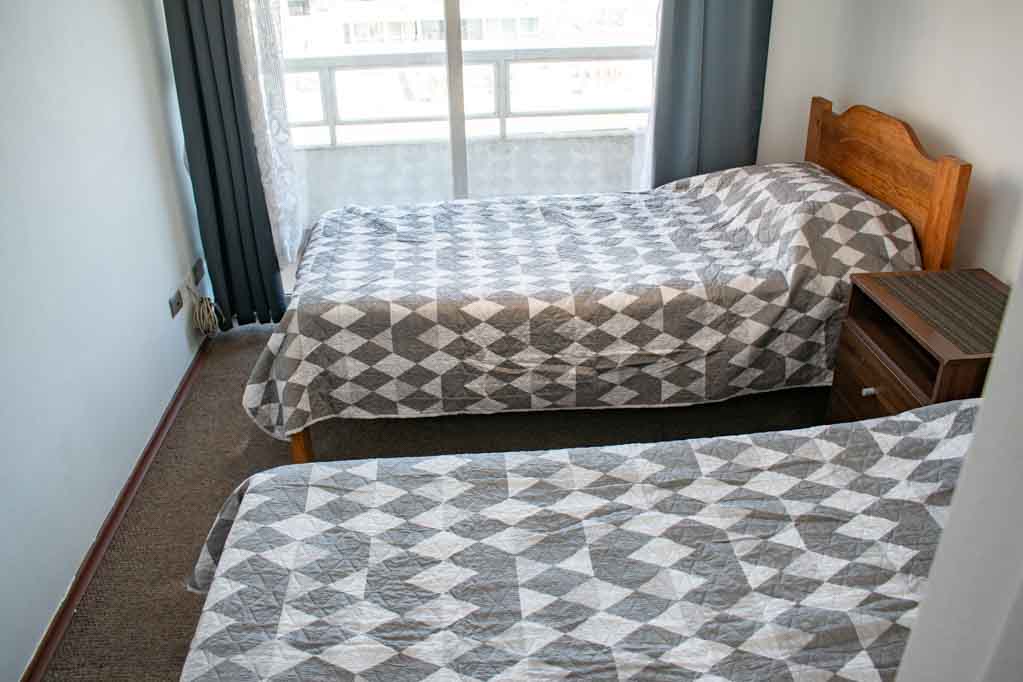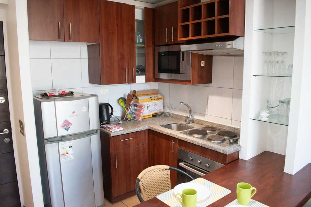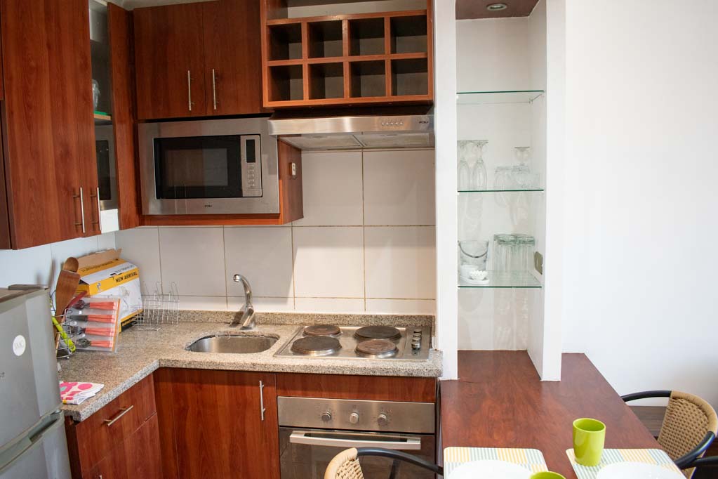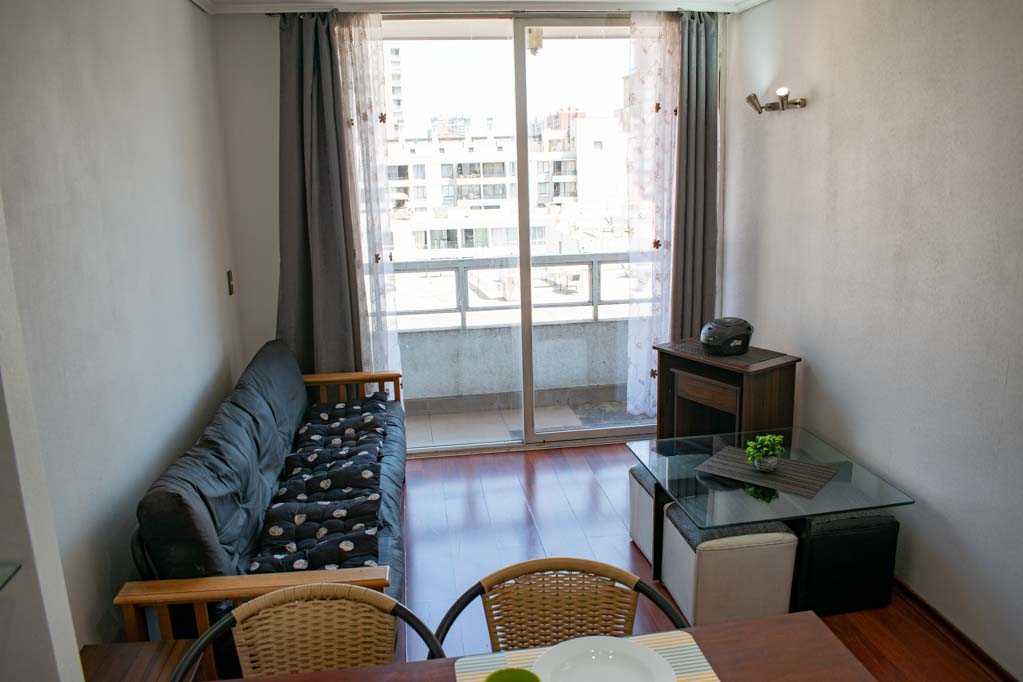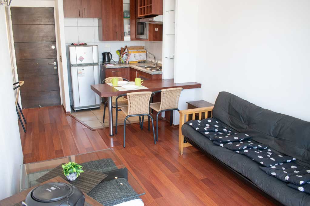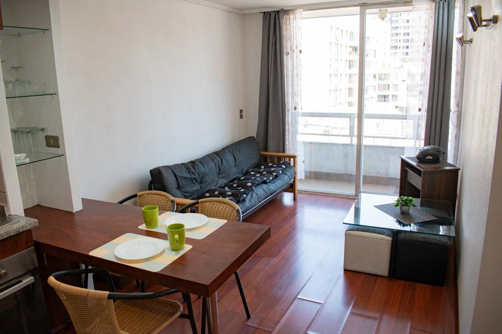 Departamento amoblado de 2 habitaciones ubicado a 10 minutos caminando de la Estación de Metro Santa Lucía.El departamento tiene living, cocina (abierta), 1 baño y balcón. La habitación 1 tiene 2 camas individuales, walk-in clóset y mesa de noche; La habitación 2 tiene cama individual, clóset y mesa de noche; El lugar mide 42m² + 3m² de terraza aproximadamente. Los gastos de servicios de gastos comunes, agua caliente, agua fría y electricidad se pagan por adelantado junto a la renta mensual, con un límite de consumo de $ 147USD. El alojamiento tiene lavandería compartida cuyo valor es $ 2USD aproximadamente por carga de ropa (lavado o secado). Se debe pagar garantía (depósito) la que será devuelta al finalizar el período de arriendo; además, se debe pagar $ 45USD al momento de devolver el alojamiento para realizar la limpieza del lugar. Cerca del alojamiento se encuentra la Biblioteca Nacional, Teatro Municipal de Santiago, Cine Arte, ferias artesanales, centros culturales y el Cerro Santa Lucía, importante foco de turismo y paseos dominicales por los atractivos que presenta, como fuentes de agua, terrazas y miradores donde puedes disfrutar de una vista privilegiada de Santiago.
