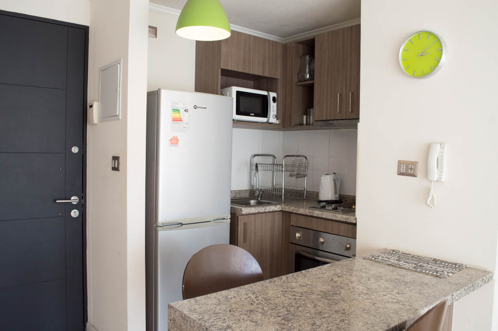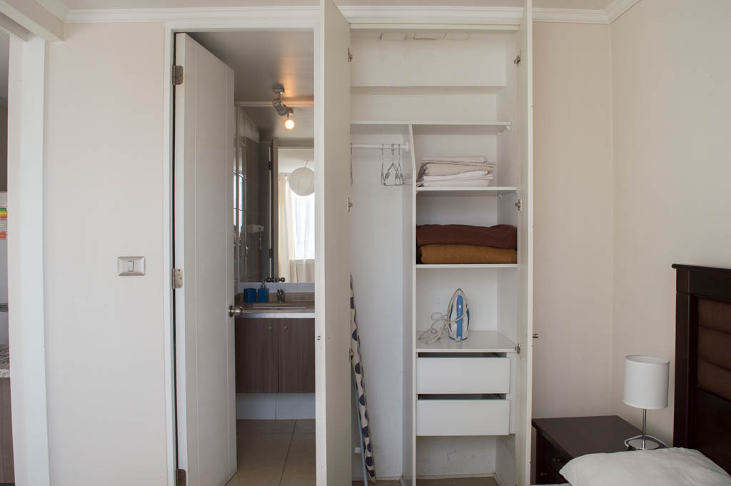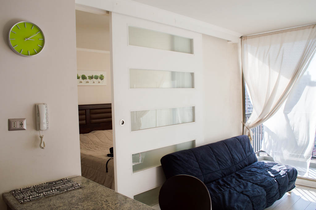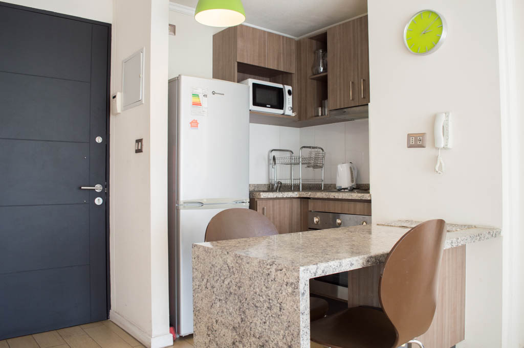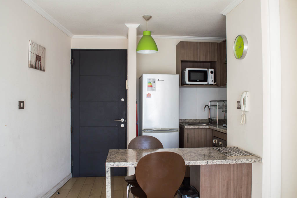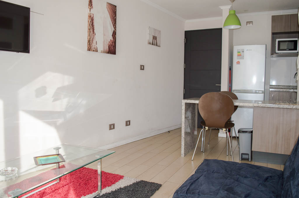 Departamento amoblado de 1 habitación ubicado a 10 minutos caminando de la parada de autobús y a 10 minutos caminando de la Estación de Metro Santa Lucía.El departamento tiene living, comedor, cocina (abierta), 1 baño y balcón. La habitación 1 tiene cama matrimonial, clóset, 2 mesas de noche y baño en suite; El lugar mide 32m² + 3m² de terraza aproximadamente. Se debe considerar el pago de gastos de servicios de gastos comunes, agua caliente, agua fría, electricidad y gas que suman $ 116USD aproximadamente. El alojamiento tiene lavandería compartida cuyo valor es $ 1USD aproximadamente por carga de ropa (lavado o secado). Se debe pagar garantía (depósito) la que será devuelta al finalizar el período de arriendo; además, se debe pagar $ 40USD al momento de devolver el alojamiento para realizar la limpieza del lugar. Cerca del alojamiento se encuentra la Biblioteca Nacional, Teatro Municipal de Santiago, Cine Arte, ferias artesanales, centros culturales y el Cerro Santa Lucía, importante foco de turismo y paseos dominicales por los atractivos que presenta, como fuentes de agua, terrazas y miradores donde puedes disfrutar de una vista privilegiada de Santiago.