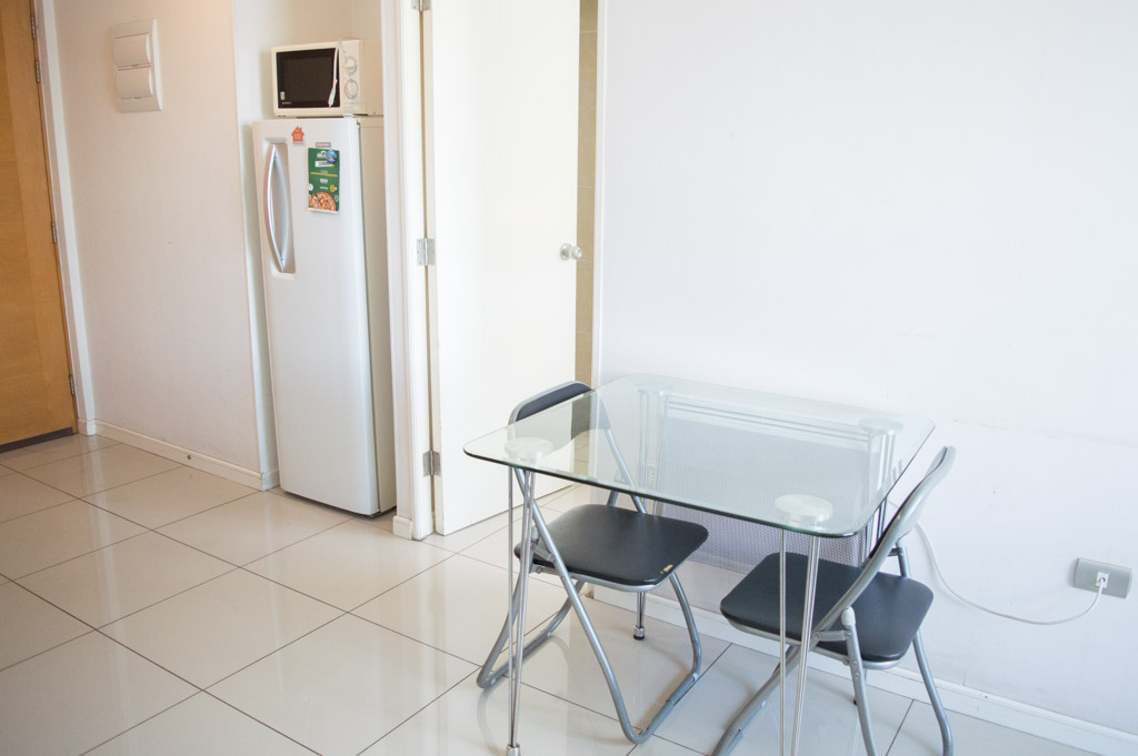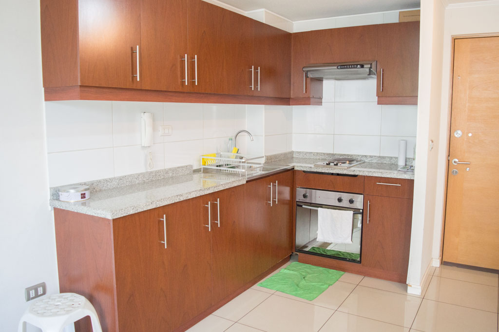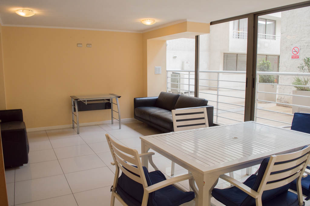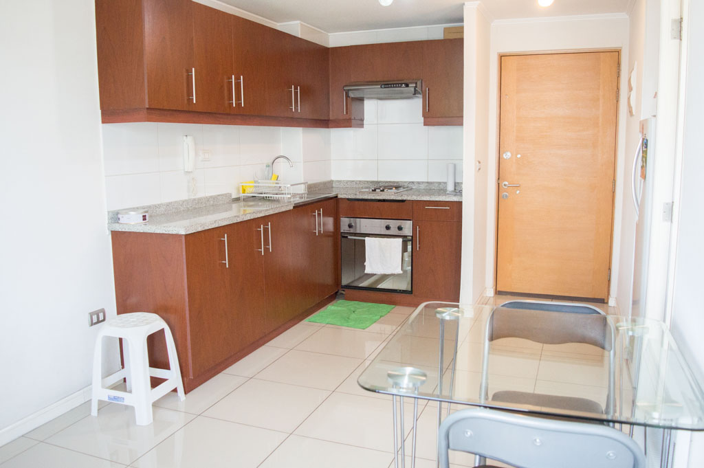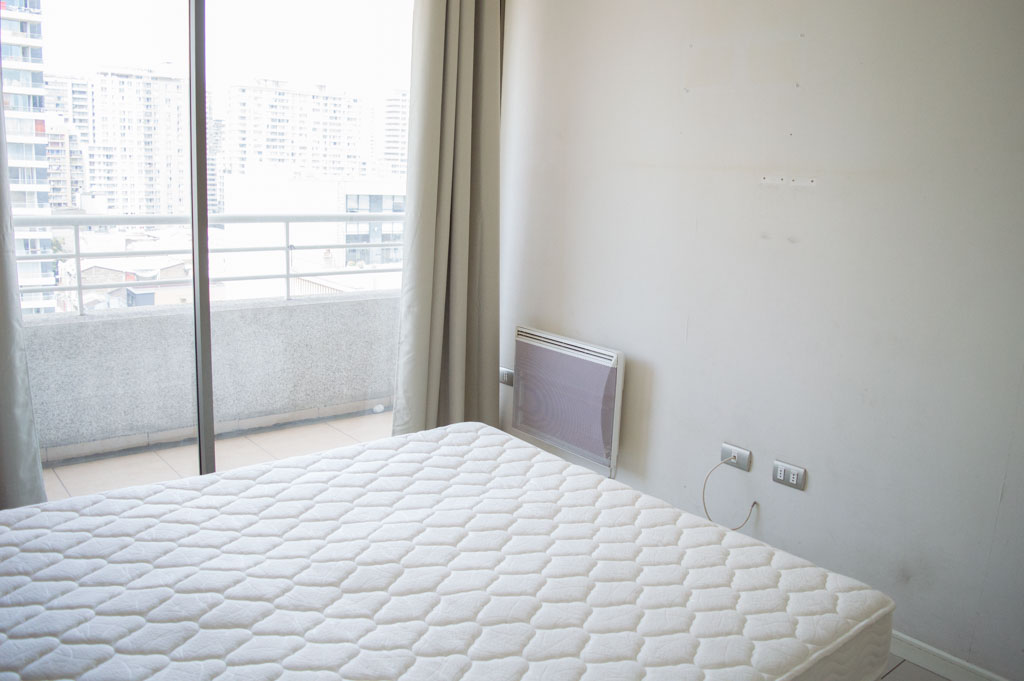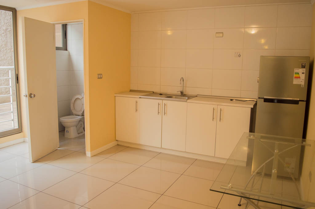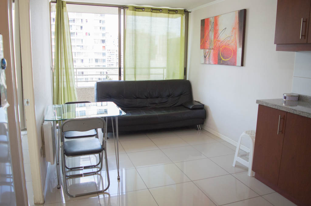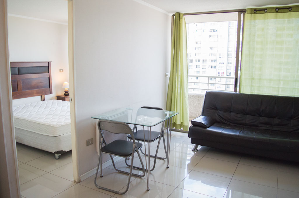 Departamento amoblado de 1 habitación ubicado a 5 minutos caminando de la parada de autobús y a 5 minutos caminando de la Estación de Metro Universidad de Chile.El departamento tiene living, comedor, cocina (abierta), 1 baño y terraza. La habitación 1 tiene cama matrimonial, clóset, 2 mesas de noche y baño en suite; El lugar mide 35m² + 3m² de terraza aproximadamente. Los gastos de servicios de gastos comunes, agua caliente, agua fría y electricidad se pagan por adelantado junto a la renta mensual, con un límite de consumo de $ 134USD. El alojamiento tiene lavandería compartida cuyo valor es $ 2USD aproximadamente por carga de ropa (lavado o secado). Se debe pagar garantía (depósito) la que será devuelta al finalizar el período de arriendo; además, se debe pagar $ 34USD al momento de devolver el alojamiento para realizar la limpieza del lugar. Cerca del alojamiento se encuentra la Avenida Bernardo O'Higgins (más conocida como Alameda) donde hay diversos locales comerciales, gran variedad de transporte público y el centro cívico de Santiago. A pasos del metro se encuentra el emblemático Instituto Nacional José Miguel Carrera, la Universidad de Chile y el Teatro Municipal de Santiago.