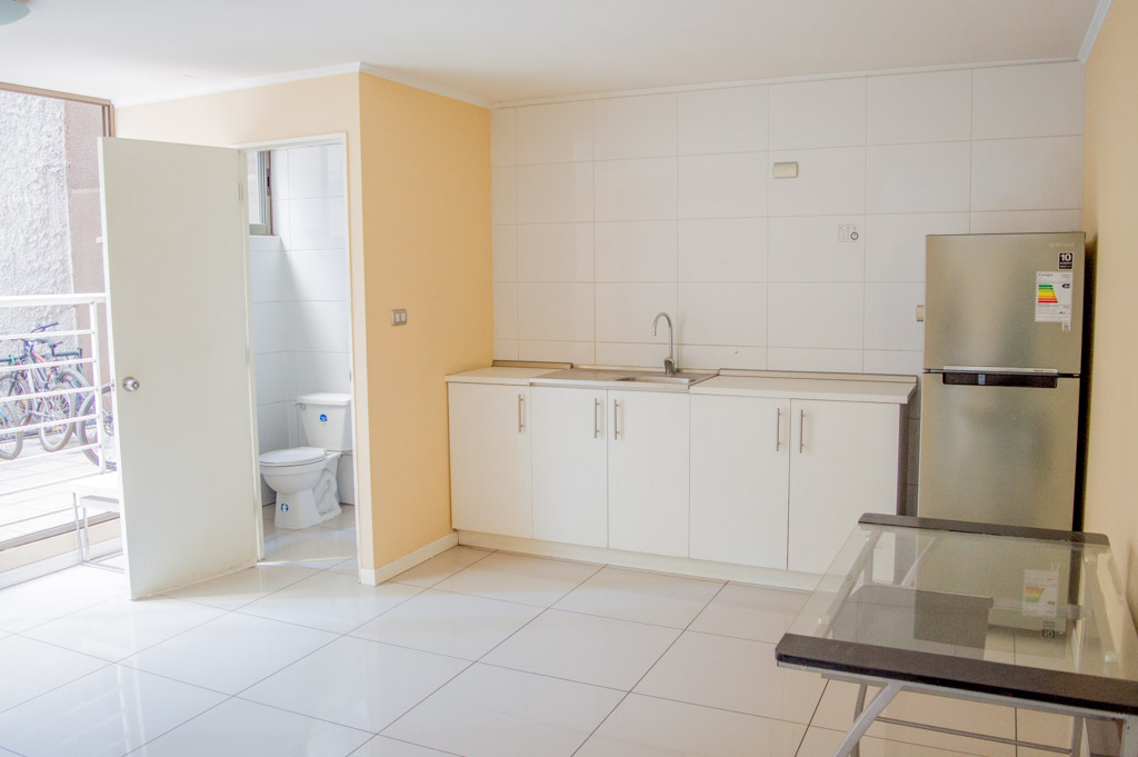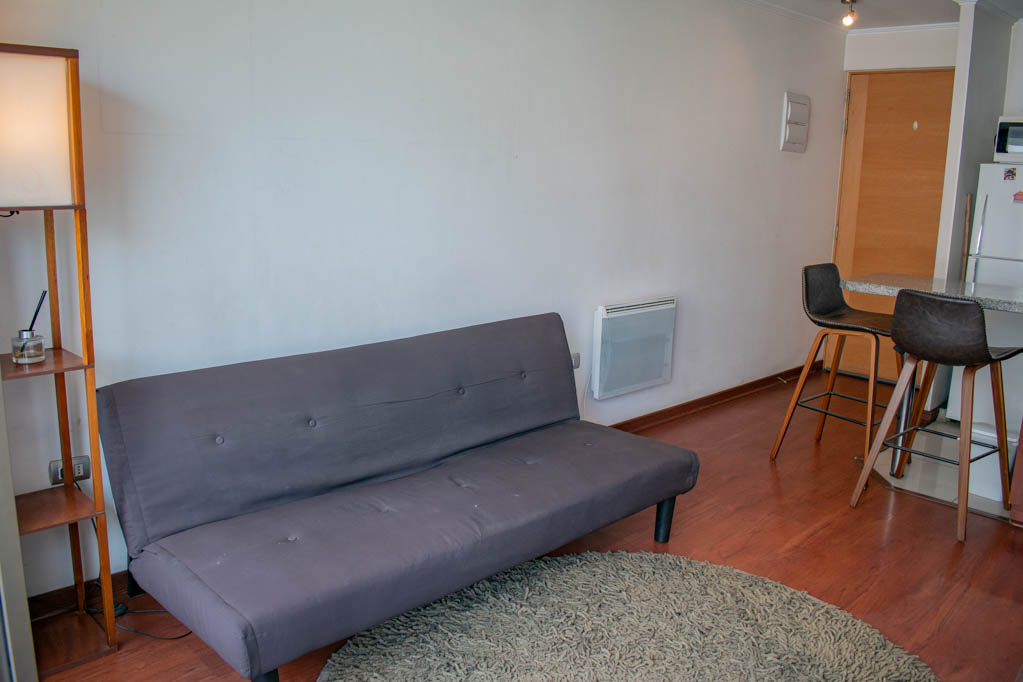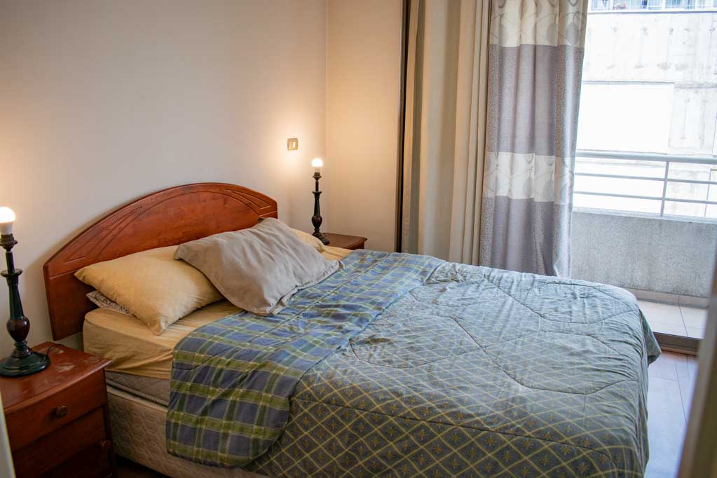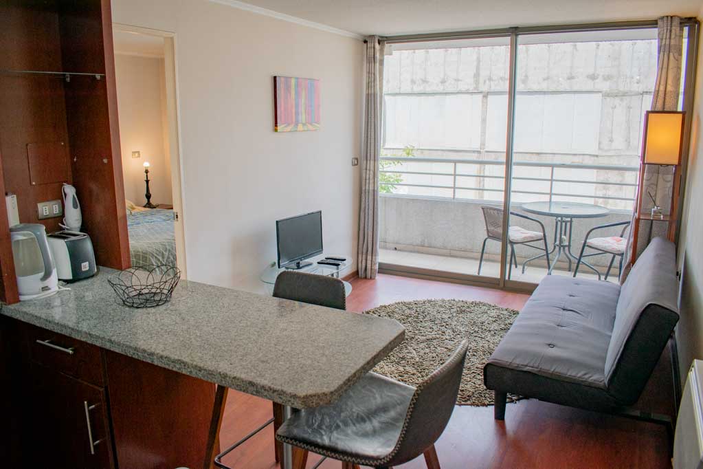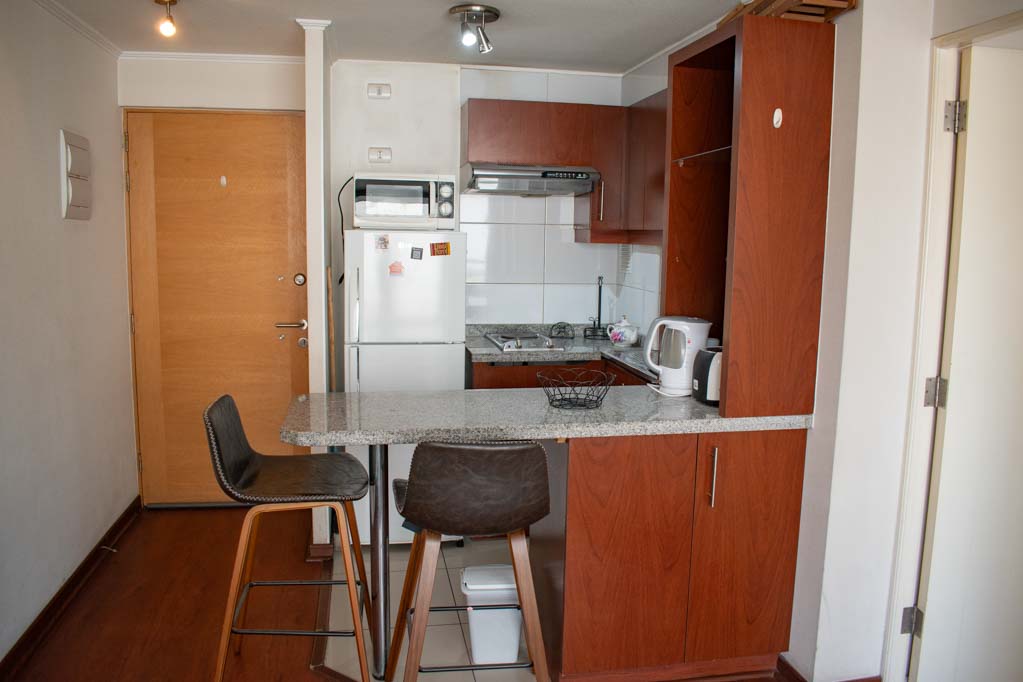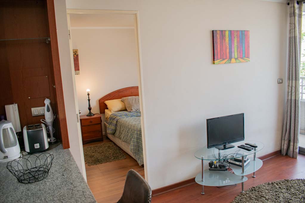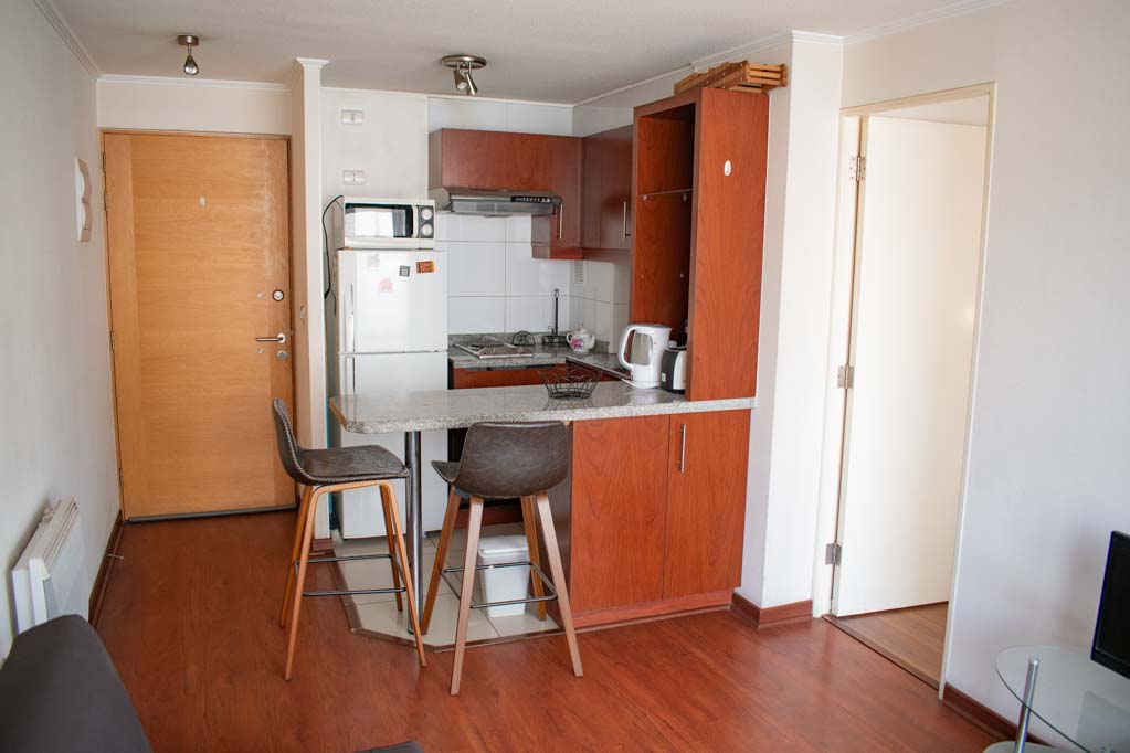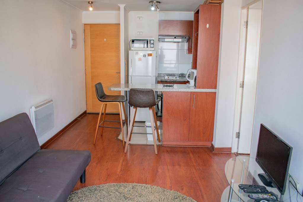 Departamento amoblado de 1 habitación ubicado a 5 minutos caminando de la parada de autobús y a 5 minutos caminando de la Estación de Metro Universidad de Chile.El departamento tiene living, comedor, cocina (abierta), 1 baño y balcón. La habitación 1 tiene cama matrimonial, walk-in clóset, 2 mesas de noche y baño en suite; El lugar mide 35m² + 3m² de terraza aproximadamente. Se debe considerar el pago de gastos de servicios de gastos comunes, agua caliente, agua fría, electricidad, internet y TV cable que suman $ 141USD aproximadamente. El alojamiento tiene lavandería compartida cuyo valor es $ 2USD aproximadamente por carga de ropa (lavado o secado). Se debe pagar garantía (depósito) la que será devuelta al finalizar el período de arriendo; además, se debe pagar $ 23USD al momento de devolver el alojamiento para realizar la limpieza del lugar. Cerca del alojamiento se encuentra la Avenida Bernardo O'Higgins (más conocida como Alameda) donde hay diversos locales comerciales, gran variedad de transporte público y el centro cívico de Santiago. A pasos del metro se encuentra el emblemático Instituto Nacional José Miguel Carrera, la Universidad de Chile y el Teatro Municipal de Santiago.