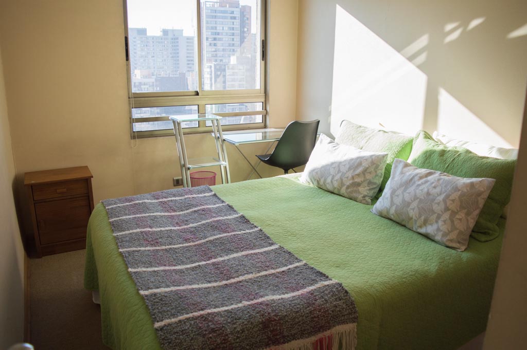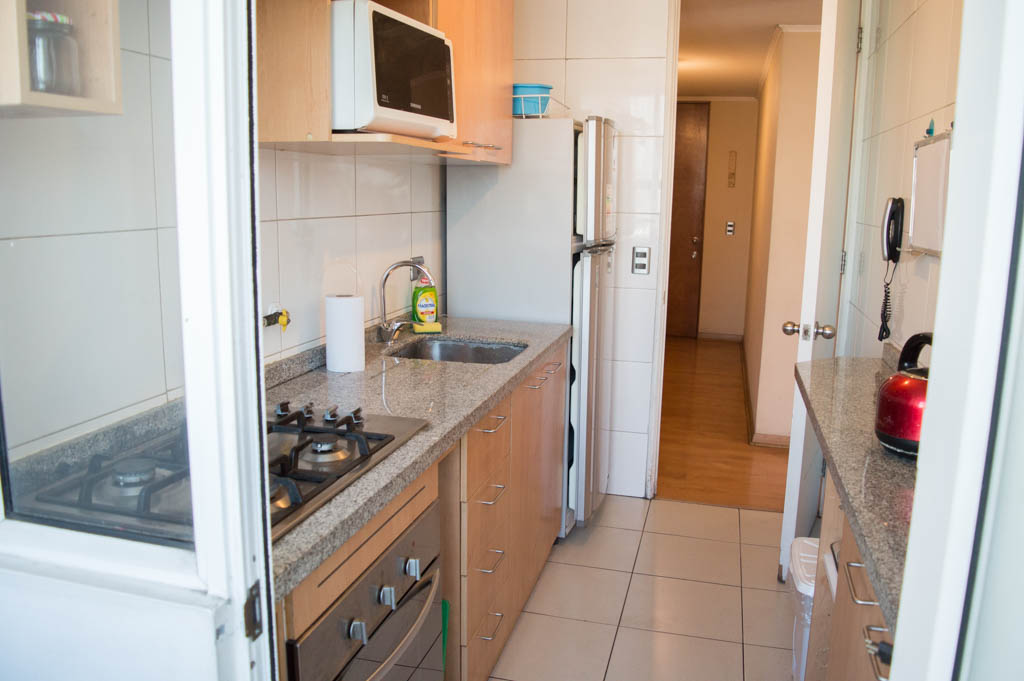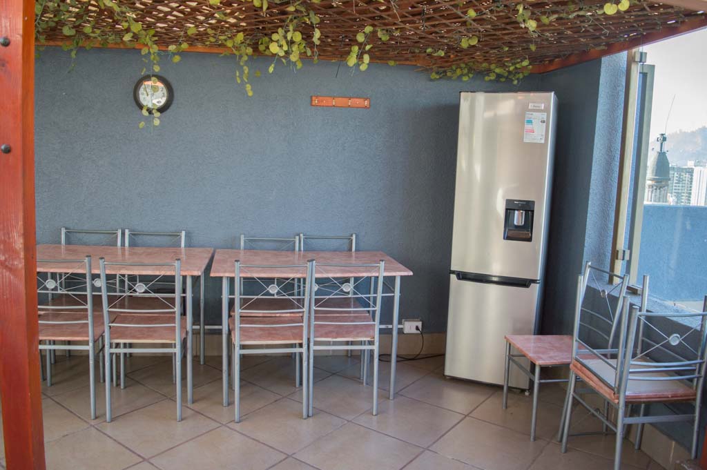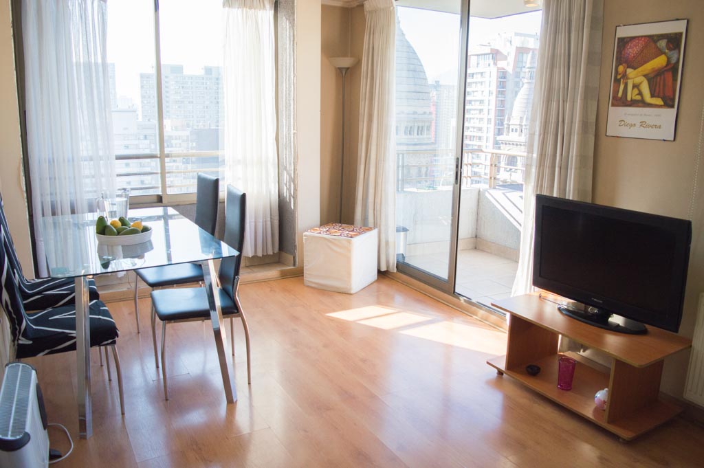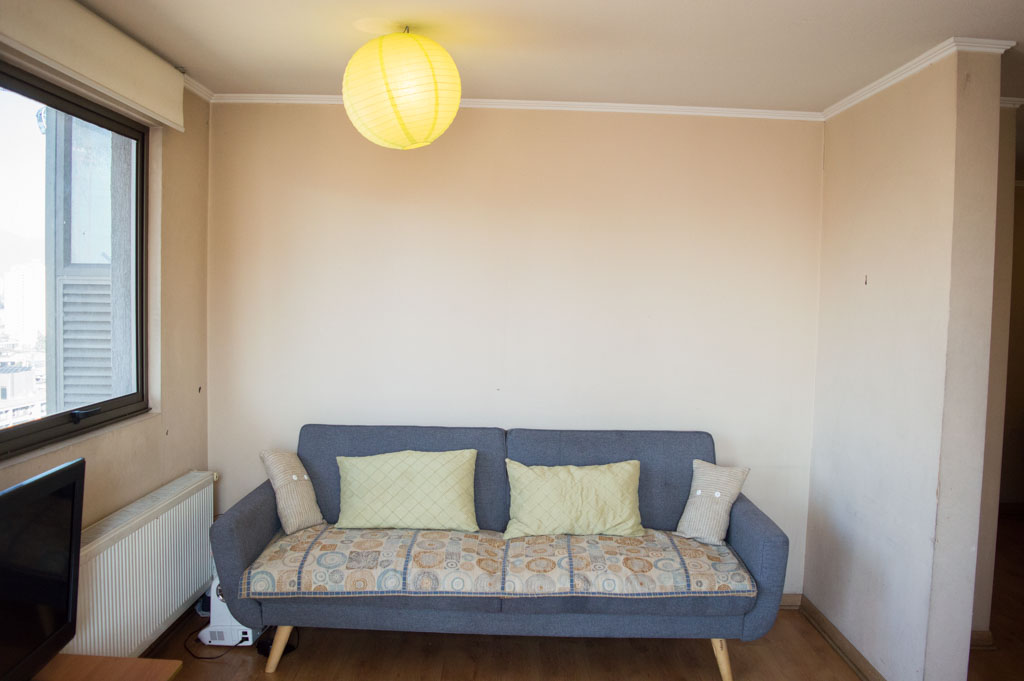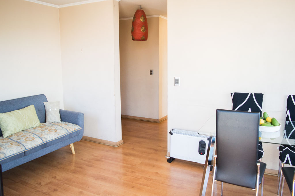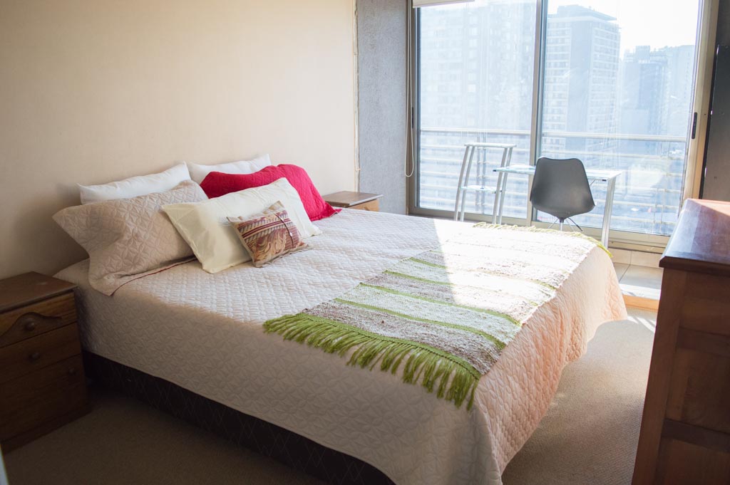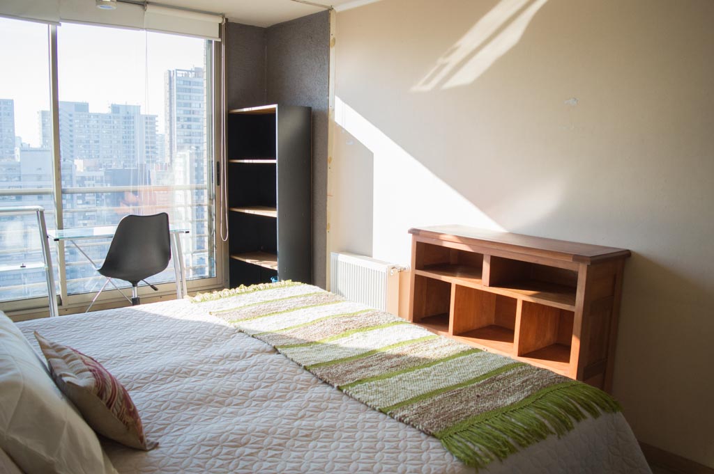 Departamento amoblado de 3 habitaciones ubicado a 2 minutos caminando de la parada de autobús y a 1 minuto caminando de la Estación de Metro Parque Almagro.El departamento tiene living, comedor, cocina (cerrada), 2 baños y terraza. La habitación 1 tiene cama matrimonial, walk-in clóset, 2 mesas de noche, escritorio y baño en suite; La habitación 2 tiene cama matrimonial, clóset, mesa de noche y escritorio; La habitación 3 tiene cama individual, clóset y mesa de noche; El lugar mide 83m² + 3m² de terraza aproximadamente. Los gastos de servicios de gastos comunes, agua caliente, agua fría, electricidad, gas e internet se pagan por adelantado junto a la renta mensual, con un límite de consumo de $ 250USD. El alojamiento tiene lavandería compartida cuyo valor es $ 2USD aproximadamente por carga de ropa (lavado o secado). Se debe pagar garantía (depósito) la que será devuelta al finalizar el período de arriendo; además, se debe pagar $ 46USD al momento de devolver el alojamiento para realizar la limpieza del lugar. Cerca del alojamiento se encuentra la Avenida Bernardo O'Higgins (más conocida como Alameda) donde hay diversos locales comerciales, gran variedad de transporte público y el centro cívico de Santiago. A pasos del metro se encuentra el emblemático Instituto Nacional José Miguel Carrera, la Universidad de Chile y el Teatro Municipal de Santiago.