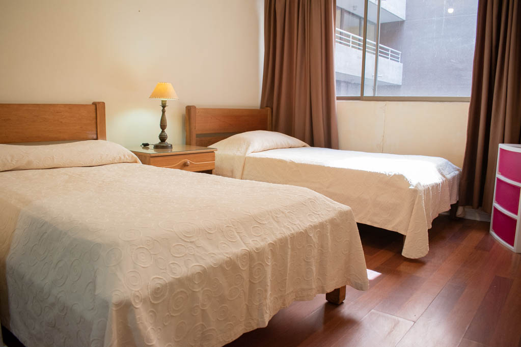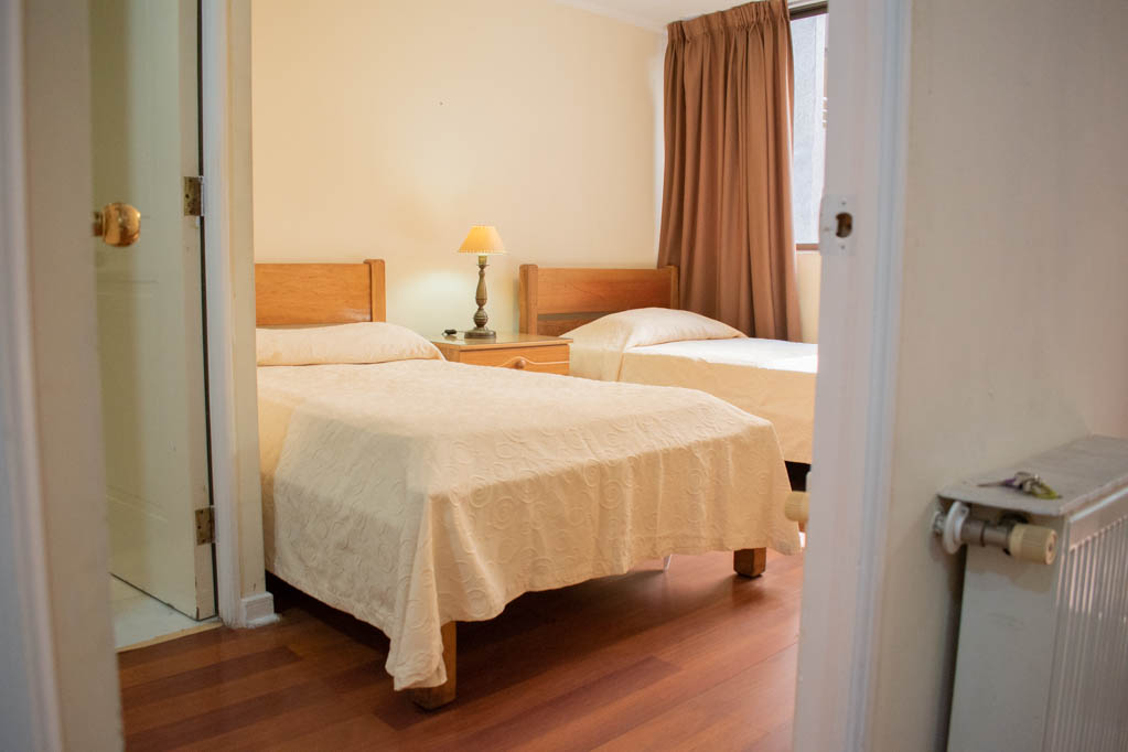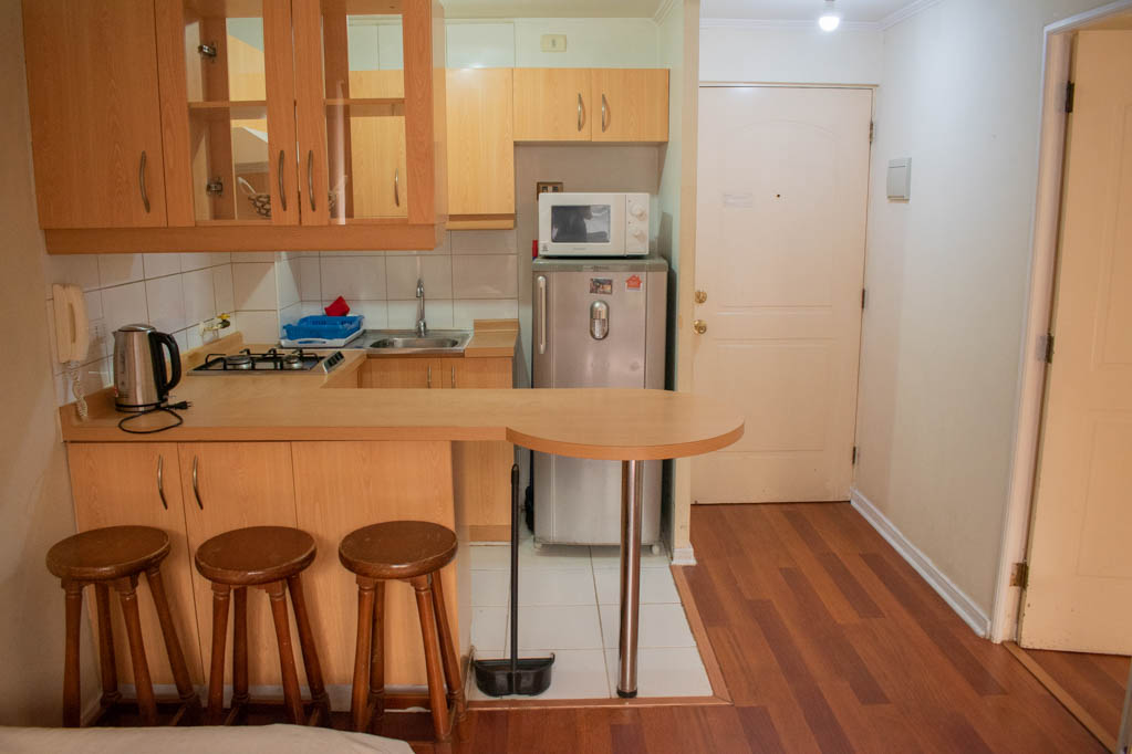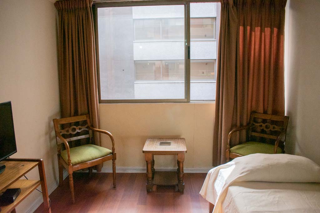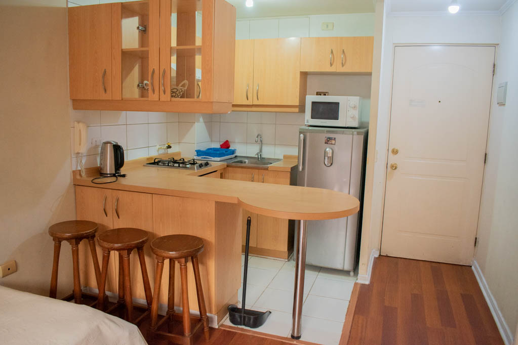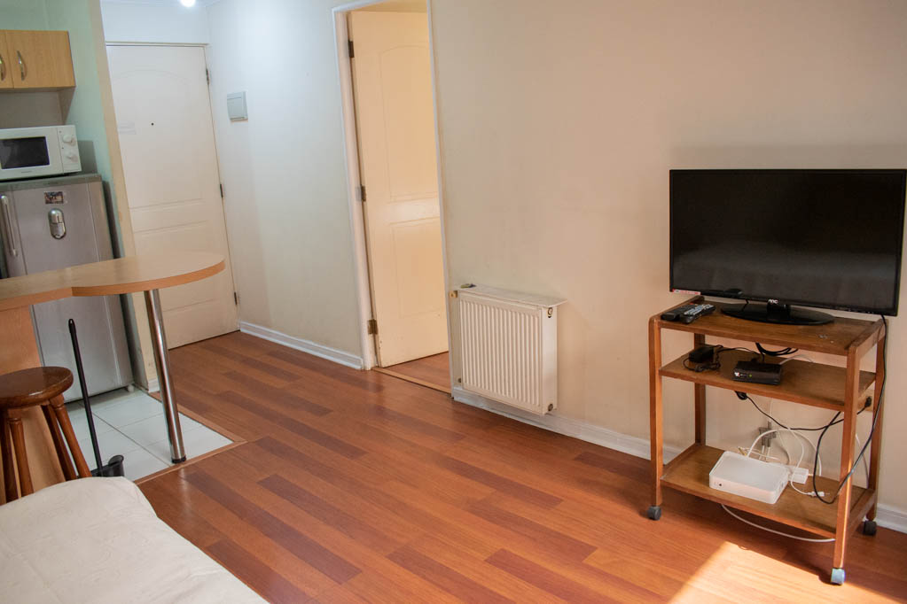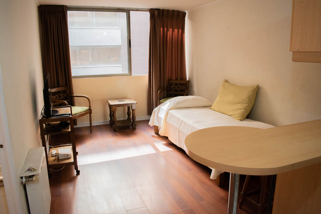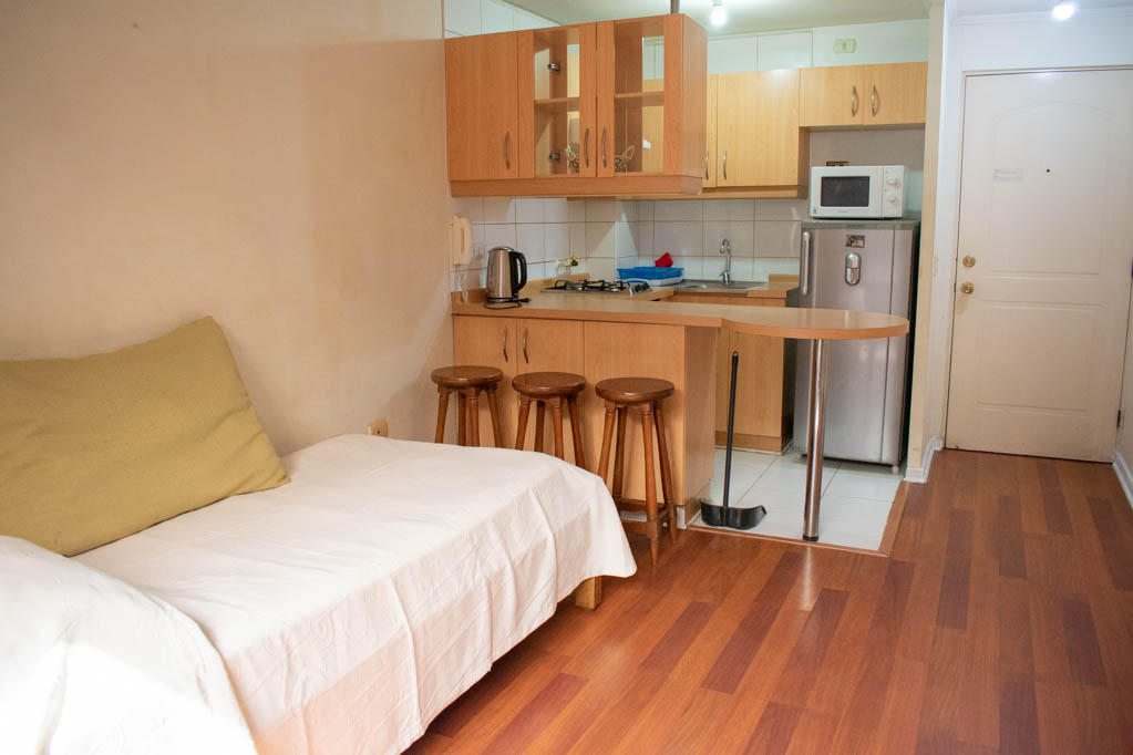 Departamento amoblado de 1 habitación ubicado a 2 minutos caminando de la parada de autobús y a 5 minutos caminando de la Estación de Metro Universidad de Chile.El departamento tiene living, comedor, cocina (abierta) y 1 baño. La habitación 1 tiene 2 camas individuales, walk-in clóset, mesa de noche y baño en suite; El lugar mide 34m² aproximadamente. Los gastos de servicios de gastos comunes, agua caliente, agua fría, electricidad, gas e internet se pagan por adelantado junto a la renta mensual, con un límite de consumo de $ 156USD. El alojamiento tiene lavandería compartida cuyo valor es $ 1USD aproximadamente por carga de ropa (lavado o secado). Se debe pagar garantía (depósito) la que será devuelta al finalizar el período de arriendo; además, se debe pagar $ 39USD al momento de devolver el alojamiento para realizar la limpieza del lugar. Cerca del alojamiento se encuentra la Avenida Bernardo O'Higgins (más conocida como Alameda) donde hay diversos locales comerciales, gran variedad de transporte público y el centro cívico de Santiago. A pasos del metro se encuentra el emblemático Instituto Nacional José Miguel Carrera, la Universidad de Chile y el Teatro Municipal de Santiago.