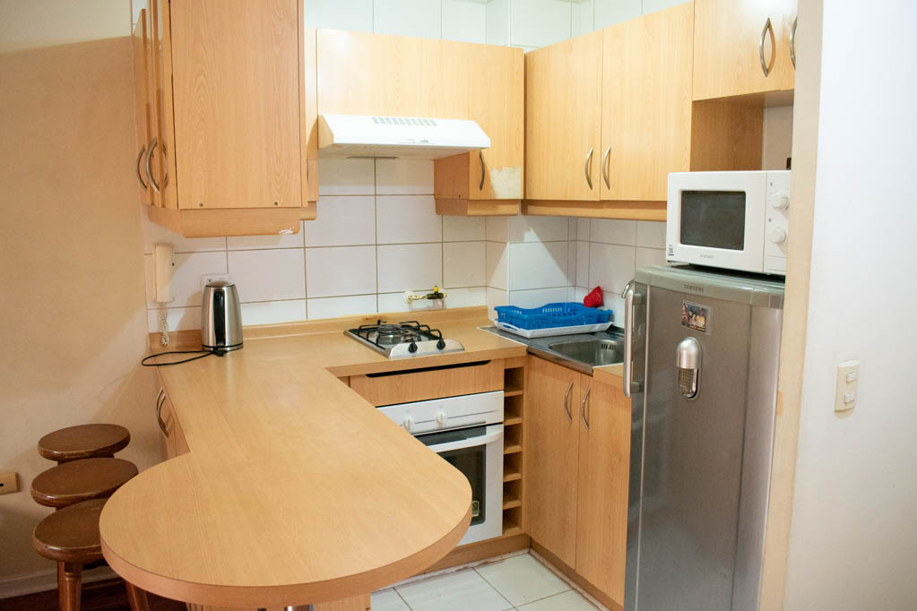 Departamento amoblado de 1 habitación ubicado a 2 minutos caminando de la parada de autobús y a 5 minutos caminando de la Estación de Metro Universidad de Chile.El departamento tiene living, comedor, cocina (abierta) y 1 baño. La habitación 1 tiene 2 camas individuales, walk-in clóset, mesa de noche y baño en suite; El lugar mide 34m² aproximadamente. Los gastos de servicios de gastos comunes, agua caliente, agua fría, electricidad, gas e internet se pagan por adelantado junto a la renta mensual, con un límite de consumo de $ 162USD. El alojamiento tiene lavandería compartida cuyo valor es $ 1USD aproximadamente por carga de ropa (lavado o secado). Se debe pagar garantía (depósito) la que será devuelta al finalizar el período de arriendo; además, se debe pagar $ 40USD al momento de devolver el alojamiento para realizar la limpieza del lugar. Cerca del alojamiento se encuentra la Avenida Bernardo O'Higgins (más conocida como Alameda) donde hay diversos locales comerciales, gran variedad de transporte público y el centro cívico de Santiago. A pasos del metro se encuentra el emblemático Instituto Nacional José Miguel Carrera, la Universidad de Chile y el Teatro Municipal de Santiago.