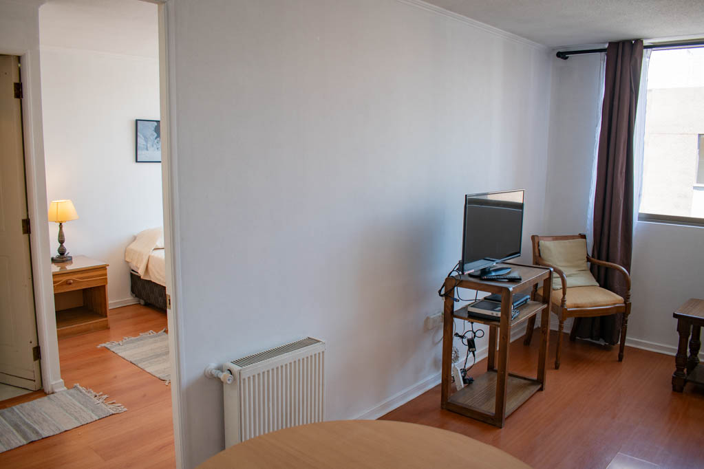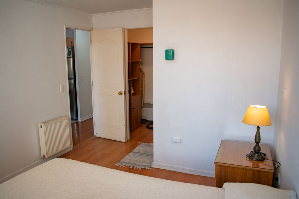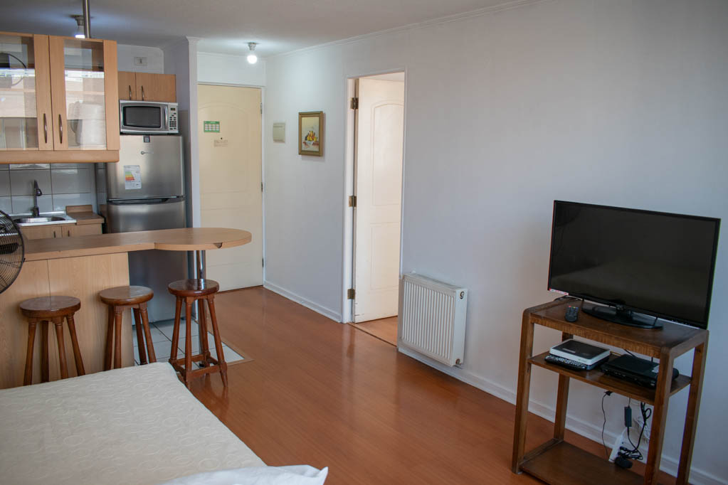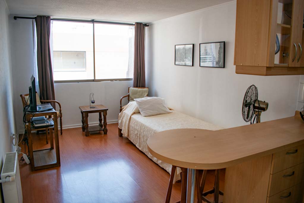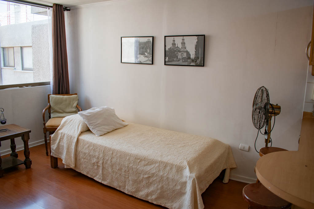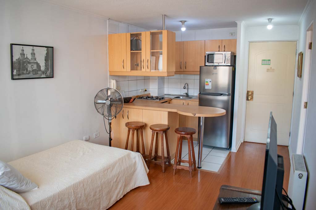 Departamento amoblado de 1 habitación ubicado a 2 minutos caminando de la parada de autobús y a 5 minutos caminando de la Estación de Metro Universidad de Chile.El departamento tiene living, comedor, cocina (abierta) y 1 baño. La habitación 1 tiene cama matrimonial, walk-in clóset, mesa de noche y baño en suite; El lugar mide 34m² aproximadamente. Los gastos de servicios de gastos comunes, agua caliente, agua fría, electricidad, gas e internet se pagan por adelantado junto a la renta mensual, con un límite de consumo de $ 154USD. El alojamiento tiene lavandería compartida cuyo valor es $ 1USD aproximadamente por carga de ropa (lavado o secado). Se debe pagar garantía (depósito) la que será devuelta al finalizar el período de arriendo; además, se debe pagar $ 39USD al momento de devolver el alojamiento para realizar la limpieza del lugar. Cerca del alojamiento se encuentra la Avenida Bernardo O'Higgins (más conocida como Alameda) donde hay diversos locales comerciales, gran variedad de transporte público y el centro cívico de Santiago. A pasos del metro se encuentra el emblemático Instituto Nacional José Miguel Carrera, la Universidad de Chile y el Teatro Municipal de Santiago.