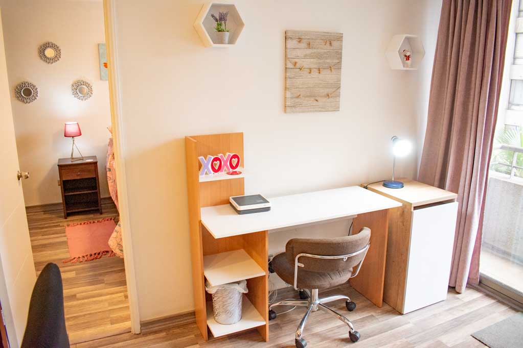 Departamento amoblado de 1 habitación ubicado a 3 minutos caminando de la parada de autobús y a 5 minutos caminando de la Estación de Metro Santa Lucía.El departamento tiene living, comedor, cocina (abierta), 1 baño y balcón. La habitación 1 tiene cama matrimonial, clóset, 2 mesas de noche y baño en suite; El lugar mide 31m² + 2m² de terraza aproximadamente. Se debe considerar el pago de gastos de servicios de gastos comunes, agua caliente, agua fría, electricidad y gas que suman $ 111USD aproximadamente. El alojamiento tiene lavandería compartida cuyo valor es $ 1USD aproximadamente por carga de ropa (lavado o secado). Se debe pagar garantía (depósito) la que será devuelta al finalizar el período de arriendo; además, se debe pagar $ 33USD al momento de devolver el alojamiento para realizar la limpieza del lugar. Cerca del alojamiento se encuentra la Biblioteca Nacional, Teatro Municipal de Santiago, Cine Arte, ferias artesanales, centros culturales y el Cerro Santa Lucía, importante foco de turismo y paseos dominicales por los atractivos que presenta, como fuentes de agua, terrazas y miradores donde puedes disfrutar de una vista privilegiada de Santiago.