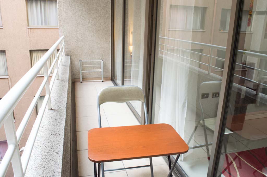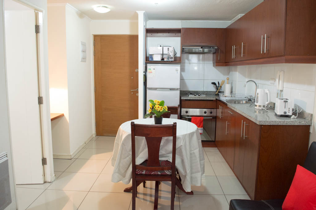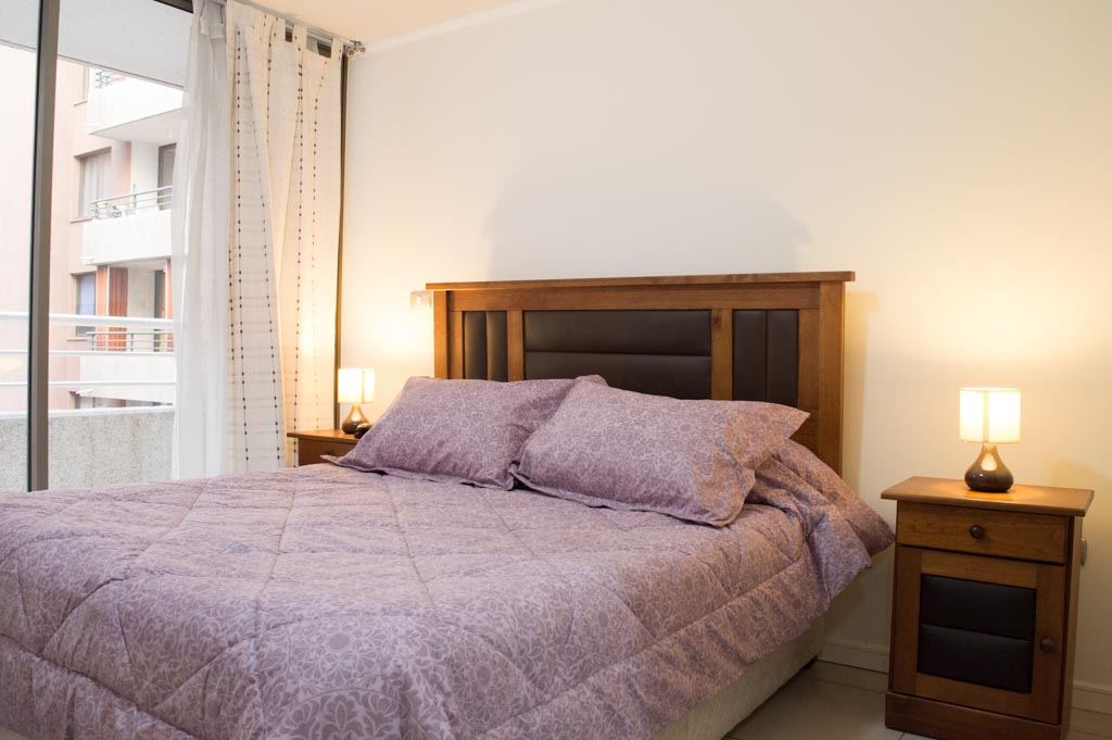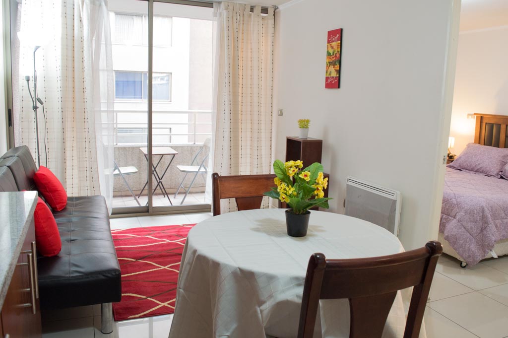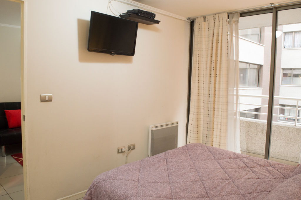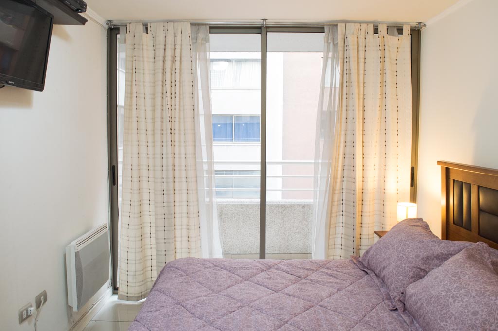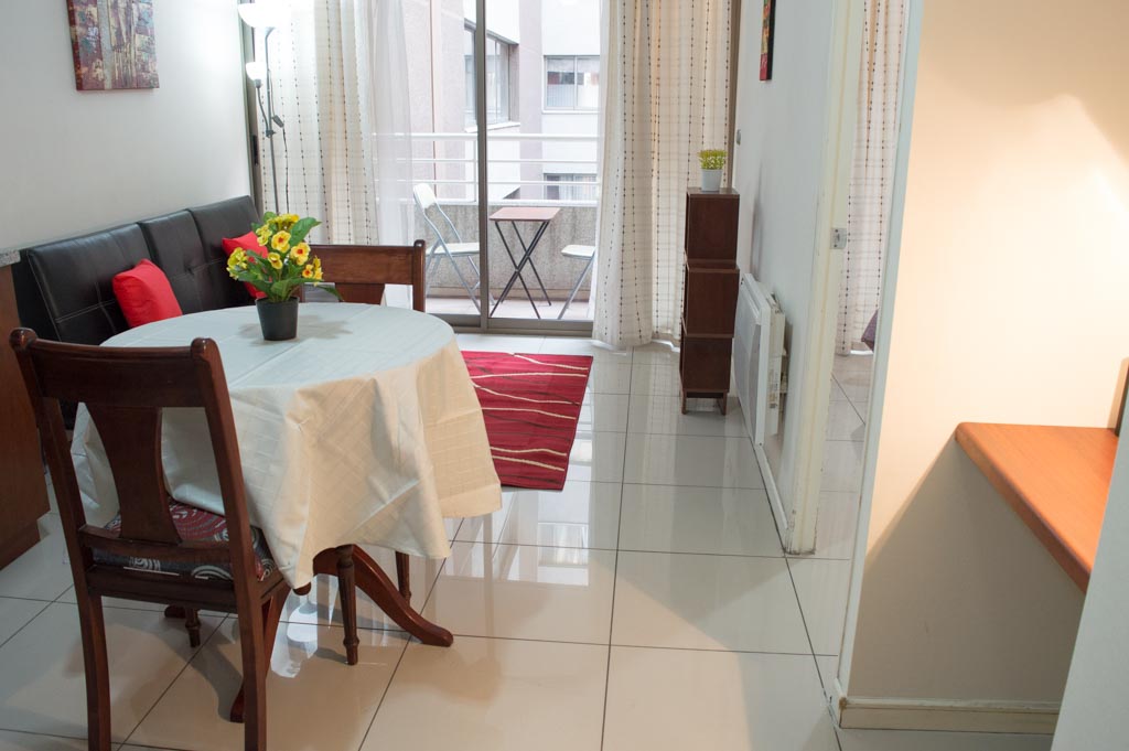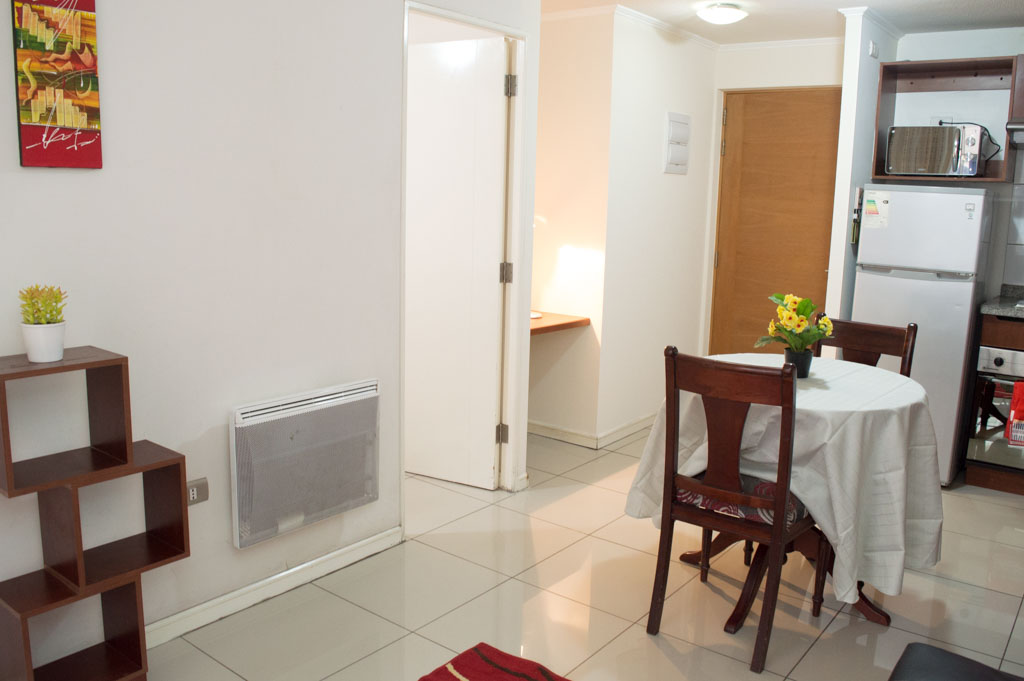 Departamento amoblado de 1 habitación ubicado a 3 minutos caminando de la parada de autobús y a 5 minutos caminando de la Estación de Metro Universidad de Chile.El departamento tiene living, comedor, cocina (abierta), 1 baño, balcón y 1 estacionamiento (opcional por un valor de $ 82USD adicional). La habitación 1 tiene cama matrimonial, clóset, 2 mesas de noche, televisor y baño en suite; El lugar mide 34m² + 5m² de terraza aproximadamente. Los gastos de servicios de gastos comunes, agua caliente, agua fría, electricidad e internet se pagan por adelantado junto a la renta mensual, con un límite de consumo de $ 142USD. El alojamiento tiene lavandería compartida cuyo valor es $ 1USD aproximadamente por carga de ropa (lavado o secado). Se debe pagar garantía (depósito) la que será devuelta al finalizar el período de arriendo; además, se debe pagar $ 38USD al momento de devolver el alojamiento para realizar la limpieza del lugar. Cerca del alojamiento se encuentra la Avenida Bernardo O'Higgins (más conocida como Alameda) donde hay diversos locales comerciales, gran variedad de transporte público y el centro cívico de Santiago. A pasos del metro se encuentra el emblemático Instituto Nacional José Miguel Carrera, la Universidad de Chile y el Teatro Municipal de Santiago.