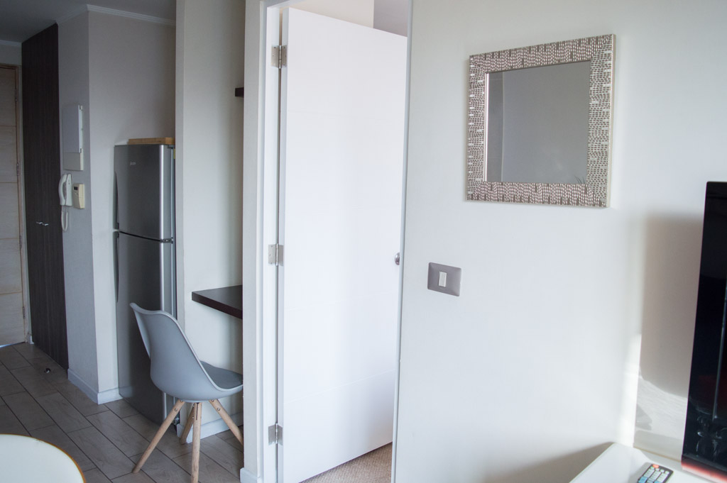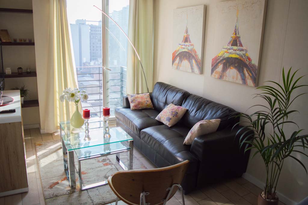 Departamento amoblado de 1 habitación ubicado a 7 minutos caminando de la parada de autobús y a 7 minutos caminando de la Estación de Metro Plaza de Armas.El departamento tiene living, comedor, cocina (abierta), 1 baño y balcón. La habitación 1 tiene cama matrimonial, clóset, 2 mesas de noche y baño en suite; El lugar mide 35m² + 1m² de terraza aproximadamente. Los gastos de servicios de gastos comunes, agua caliente, agua fría y electricidad se pagan por adelantado junto a la renta mensual, con un límite de consumo de $ 110USD. El alojamiento tiene lavandería compartida cuyo valor es $ 2USD aproximadamente por carga de ropa (lavado o secado). Se debe pagar garantía (depósito) la que será devuelta al finalizar el período de arriendo; además, se debe pagar $ 44USD al momento de devolver el alojamiento para realizar la limpieza del lugar. Cerca del alojamiento se encuentra la Plaza de Armas de Santiago, parte importante del casco histórico de la ciudad, reconocida por su arquitectura e infraestructuras, tales como el Correo de Santiago, Catedral de Santiago, Municipalidad y la Casa Colorada. Este lugar, tiene buen acceso y conectividad con varios puntos de la ciudad. El sector se caracteriza por concentrar variadas instituciones de servicios públicos y privados.