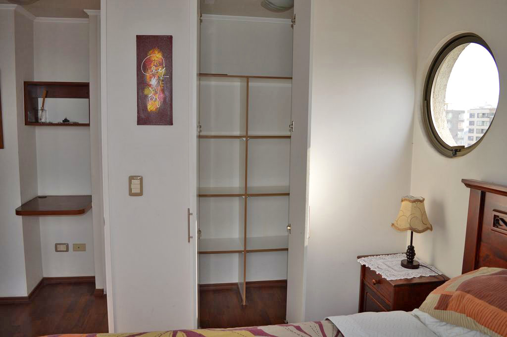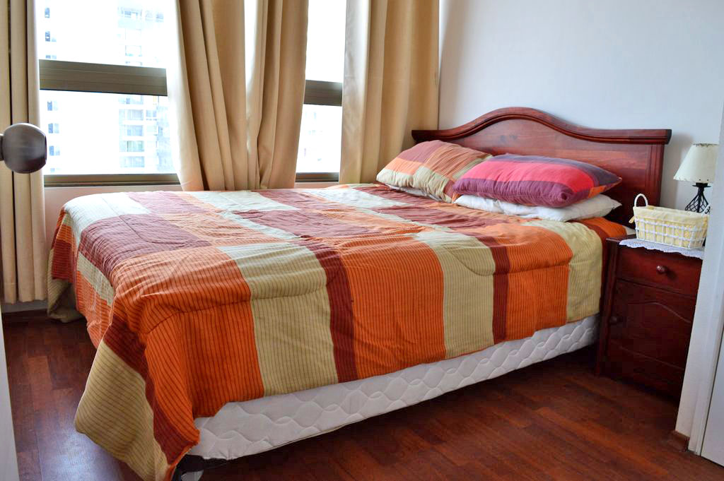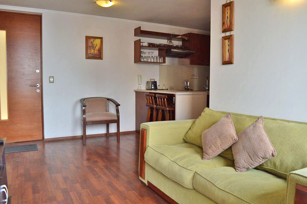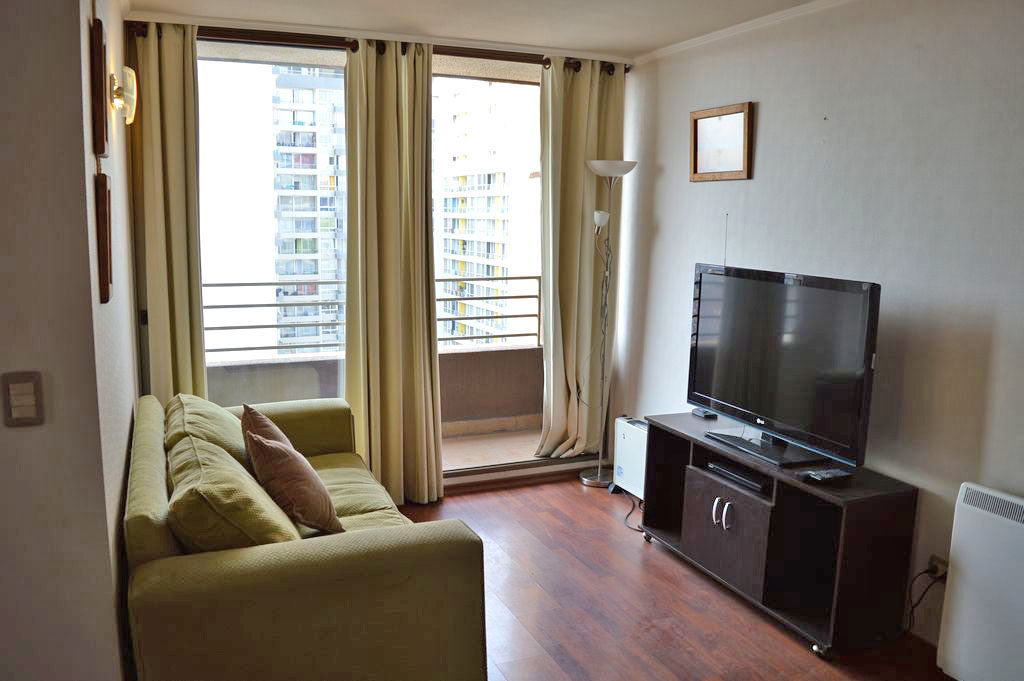 Departamento amoblado de 2 habitaciones ubicado a 3 minutos caminando de la parada de autobús y a 7 minutos caminando de la Estación de Metro Universidad de Chile.El departamento tiene living, comedor, cocina (abierta), 1 baño y terraza. La habitación 1 tiene cama matrimonial, 2 mesas de noche y baño en suite; La habitación 2 tiene cama matrimonial, clóset y mesa de noche; El lugar mide 46m² + 3m² de terraza aproximadamente. Los gastos de servicios de gastos comunes, agua caliente, agua fría y electricidad se pagan por adelantado junto a la renta mensual, con un límite de consumo de $ 117USD. El alojamiento tiene lavandería compartida (lavado o secado). Se debe pagar garantía (depósito) la que será devuelta al finalizar el período de arriendo; además, se debe pagar $ 33USD al momento de devolver el alojamiento para realizar la limpieza del lugar. Cerca del alojamiento se encuentra la Avenida Bernardo O'Higgins (más conocida como Alameda) donde hay diversos locales comerciales, gran variedad de transporte público y el centro cívico de Santiago. A pasos del metro se encuentra el emblemático Instituto Nacional José Miguel Carrera, la Universidad de Chile y el Teatro Municipal de Santiago.