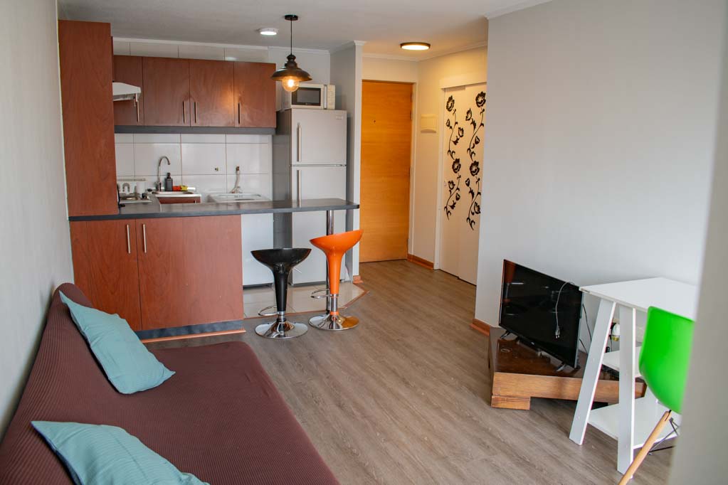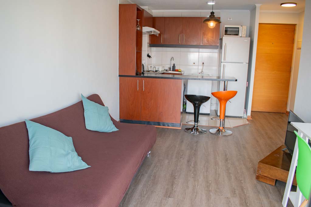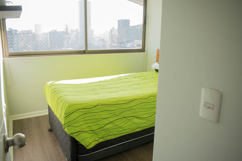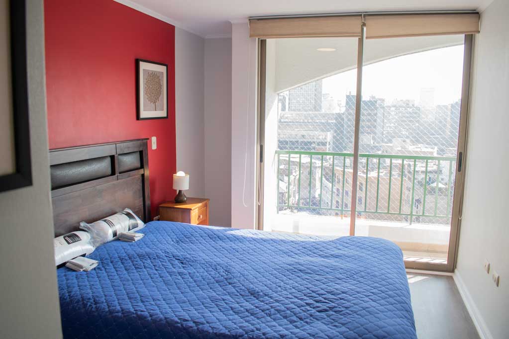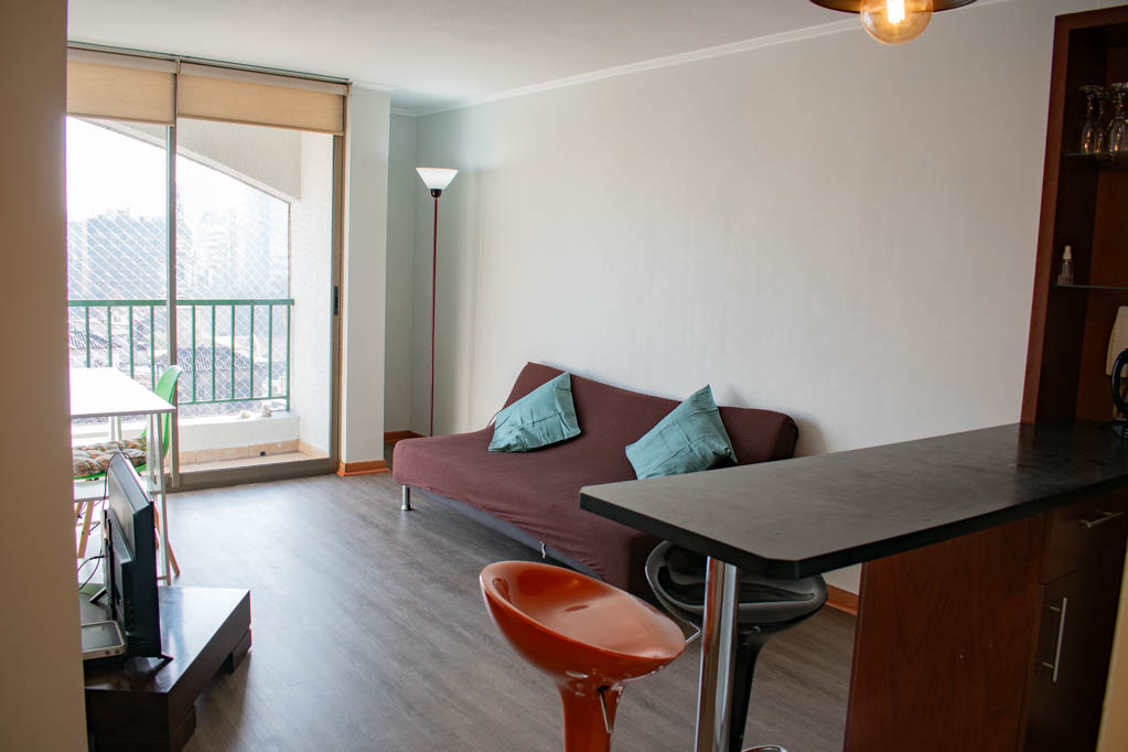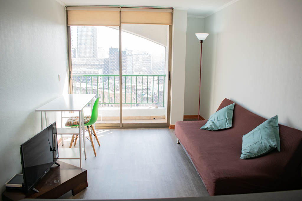 Departamento amoblado de 2 habitaciones ubicado a 4 minutos caminando de la parada de autobús y a 5 minutos caminando de la Estación de Metro Universidad de Chile.El departamento tiene living, comedor, cocina (abierta), 2 baños y balcón. La habitación 1 tiene cama matrimonial, walk-in clóset, 2 mesas de noche y baño en suite; La habitación 2 tiene cama nido y clóset; El lugar mide 50m² + 6m² de terraza aproximadamente. Se debe considerar el pago de gastos de servicios de gastos comunes, agua caliente, agua fría y electricidad que suman $ 219USD aproximadamente. El alojamiento tiene lavandería compartida cuyo valor es $ 2USD aproximadamente por carga de ropa (lavado o secado). Se debe pagar garantía (depósito) la que será devuelta al finalizar el período de arriendo; además, se debe pagar $ 116USD al momento de devolver el alojamiento para realizar la limpieza del lugar. Cerca del alojamiento se encuentra la Avenida Bernardo O'Higgins (más conocida como Alameda) donde hay diversos locales comerciales, gran variedad de transporte público y el centro cívico de Santiago. A pasos del metro se encuentra el emblemático Instituto Nacional José Miguel Carrera, la Universidad de Chile y el Teatro Municipal de Santiago.