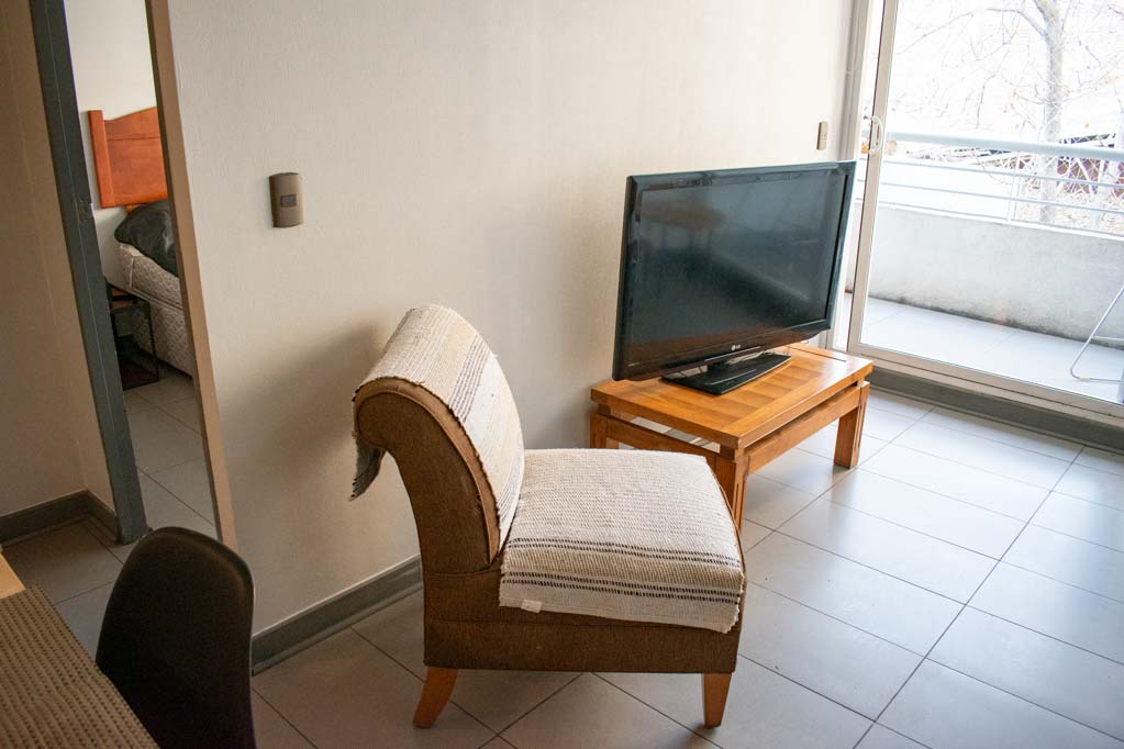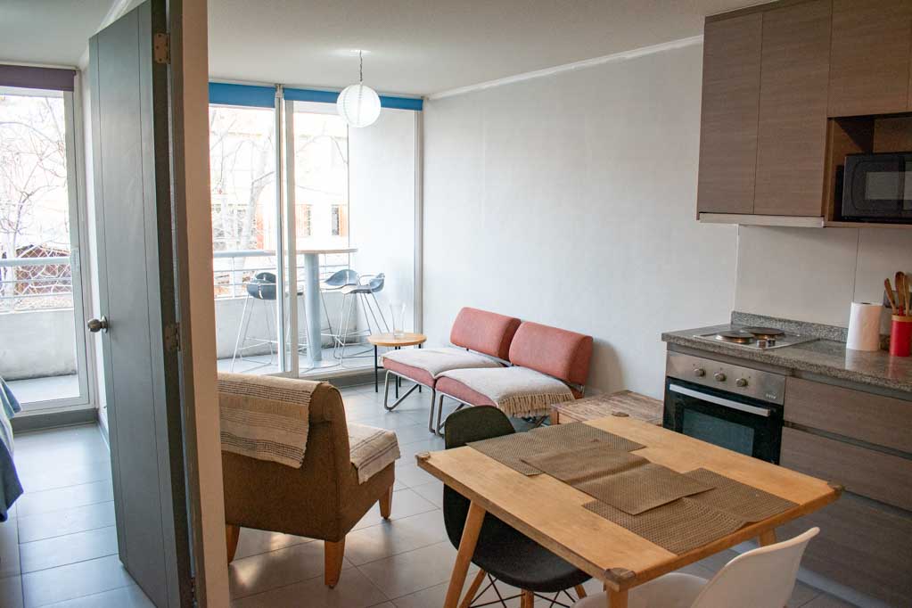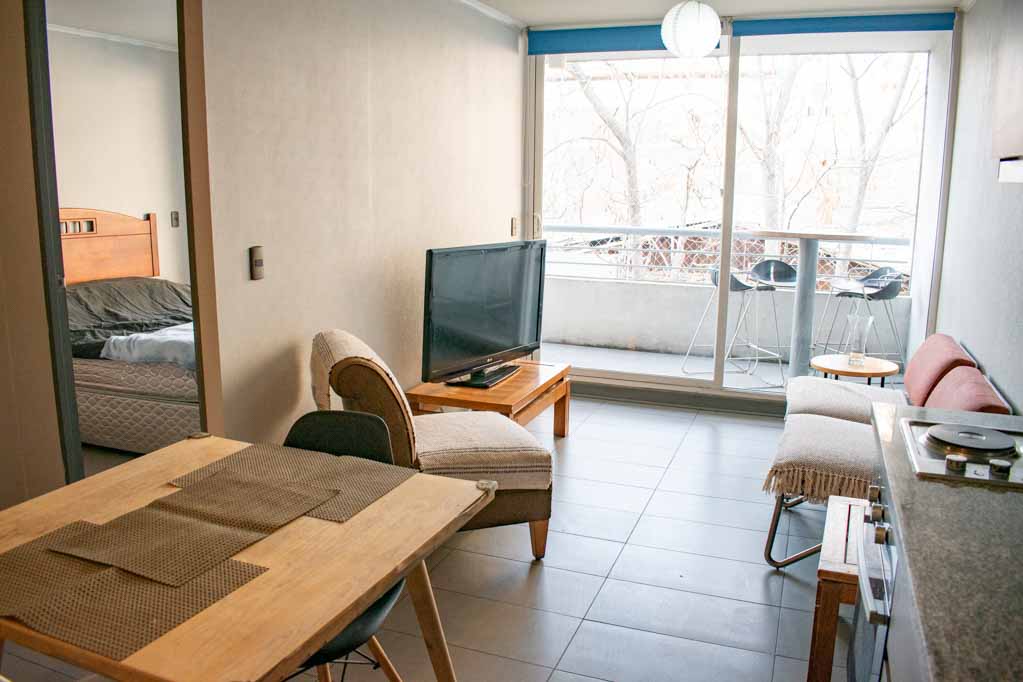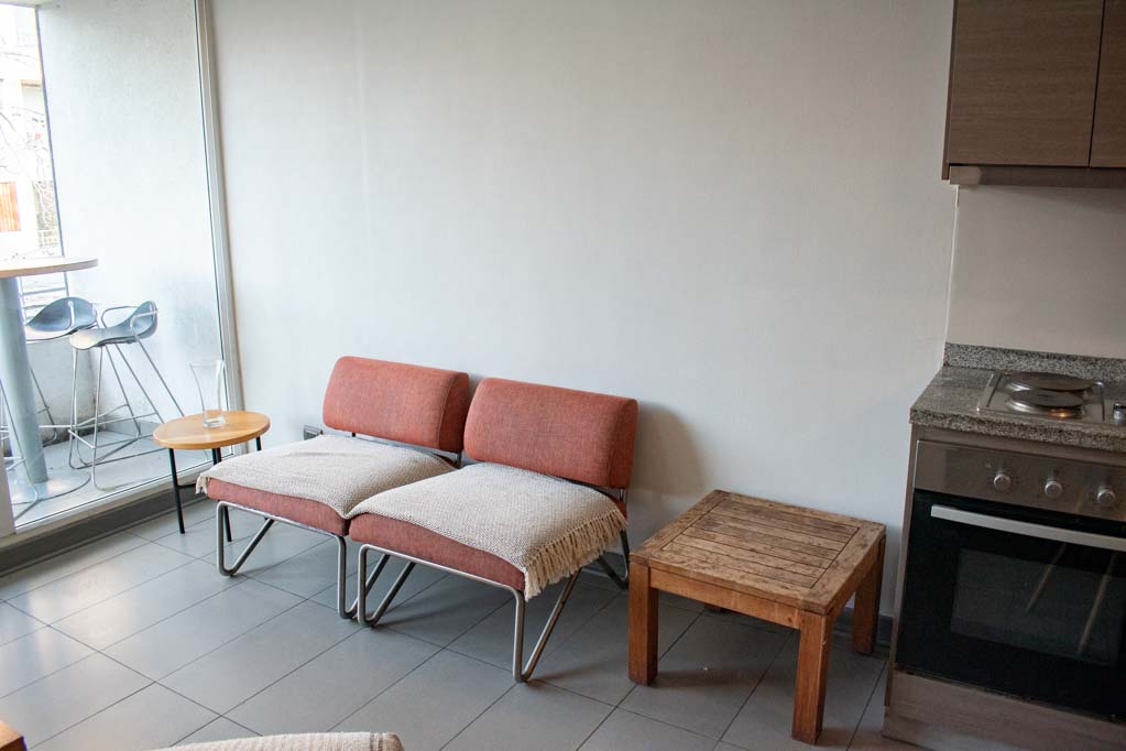 Departamento amoblado de 1 habitación ubicado a 5 minutos caminando de la parada de autobús y a 5 minutos caminando de la Estación de Metro Santa Ana.El departamento tiene living, comedor, cocina (abierta), 1 baño y balcón. La habitación 1 tiene cama matrimonial, clóset y 2 mesas de noche; El lugar mide 32m² + 5m² de terraza aproximadamente. Los gastos de servicios de gastos comunes se pagan por adelantado junto a la renta mensual, con un límite de consumo de $ 68USD. Además, se debe considerar el pago de gastos de servicios de agua caliente, agua fría y electricidad que suman $ 34USD aproximadamente. El alojamiento tiene lavandería compartida cuyo valor es $ 2USD aproximadamente por carga de ropa (lavado o secado). Se debe pagar garantía (depósito) la que será devuelta al finalizar el período de arriendo; además, se debe pagar $ 34USD al momento de devolver el alojamiento para realizar la limpieza del lugar. Cerca del alojamiento se encuentra los emblemáticos liceo 1 Javiera Carrera y Liceo Aplicación, además de la iglesia Parroquial de Santa Ana, monumento nacional. A pasos podrás encontrar la plaza de Armas de Santiago, parte importante del casco histórico de Santiago, reconocido por su arquitectura e infraestructuras, tales como el Correo de Santiago, Catedral de Santiago, Municipalidad y la Casa Colorada.