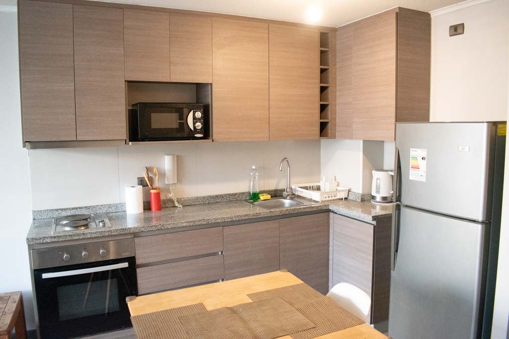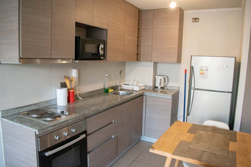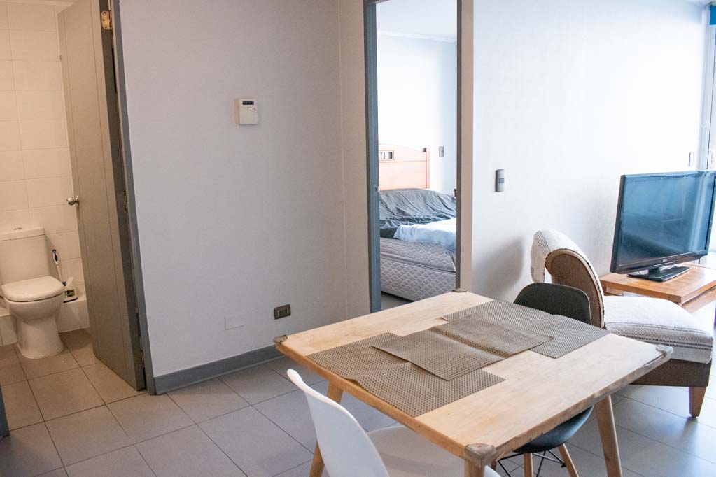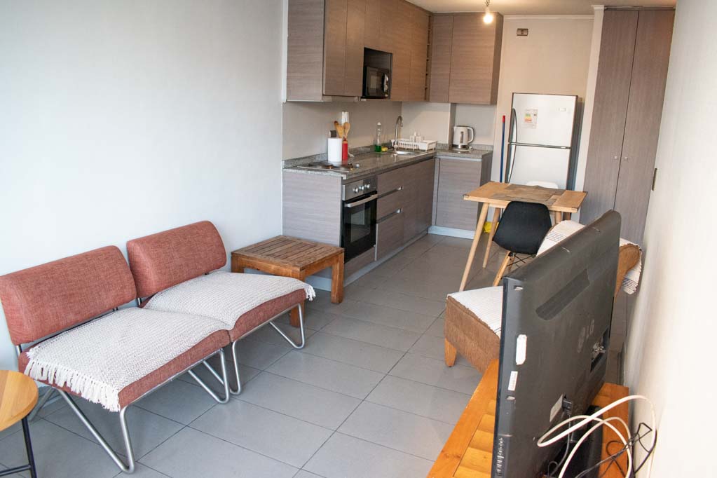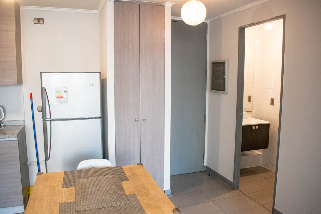 Departamento amoblado de 1 habitación ubicado a 5 minutos caminando de la parada de autobús y a 5 minutos caminando de la Estación de Metro Santa Ana.El departamento tiene living, comedor, cocina (abierta), 1 baño y balcón. La habitación 1 tiene cama matrimonial, clóset y 2 mesas de noche; El lugar mide 32m² + 5m² de terraza aproximadamente. Los gastos de servicios de gastos comunes se pagan por adelantado junto a la renta mensual, con un límite de consumo de $ 68USD. Además, se debe considerar el pago de gastos de servicios de agua caliente, agua fría y electricidad que suman $ 34USD aproximadamente. El alojamiento tiene lavandería compartida cuyo valor es $ 2USD aproximadamente por carga de ropa (lavado o secado). Se debe pagar garantía (depósito) la que será devuelta al finalizar el período de arriendo; además, se debe pagar $ 34USD al momento de devolver el alojamiento para realizar la limpieza del lugar. Cerca del alojamiento se encuentra los emblemáticos liceo 1 Javiera Carrera y Liceo Aplicación, además de la iglesia Parroquial de Santa Ana, monumento nacional. A pasos podrás encontrar la plaza de Armas de Santiago, parte importante del casco histórico de Santiago, reconocido por su arquitectura e infraestructuras, tales como el Correo de Santiago, Catedral de Santiago, Municipalidad y la Casa Colorada.