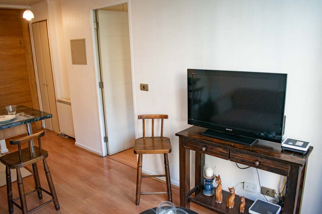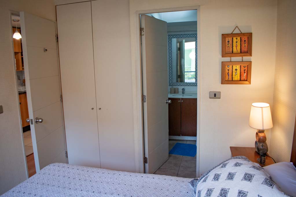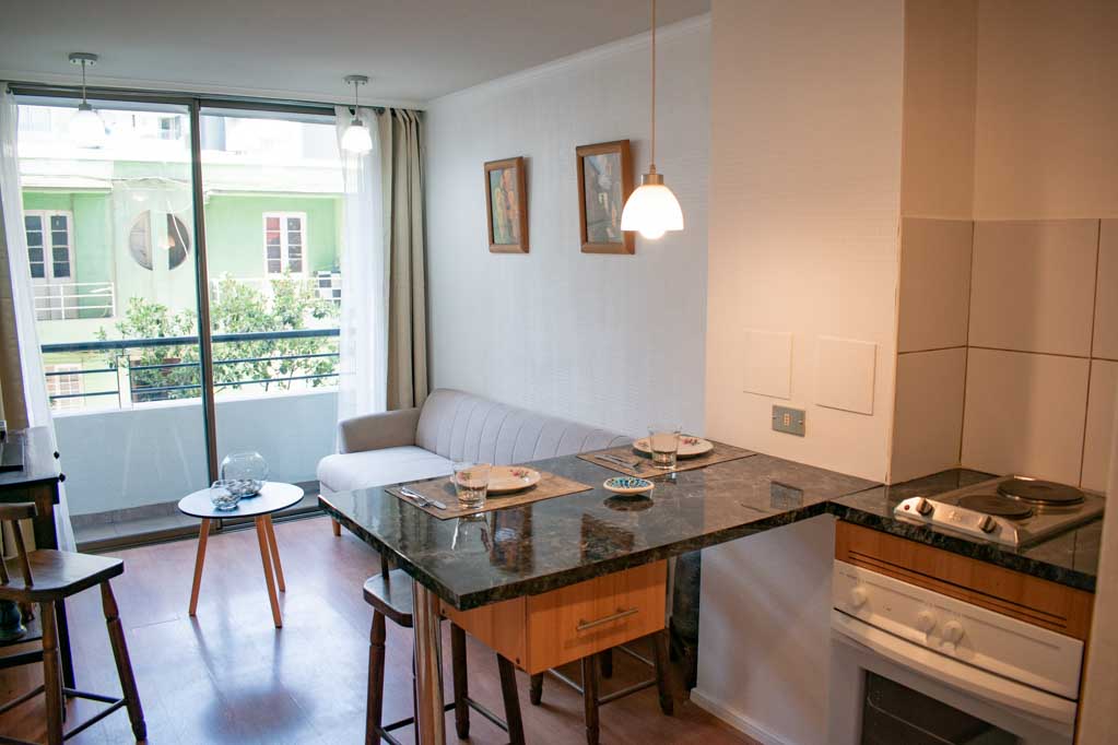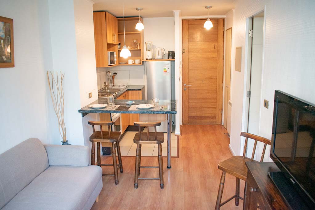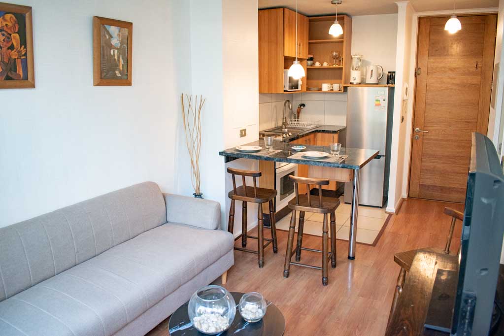 Departamento amoblado de 1 habitación ubicado a 1 minuto caminando de la parada de autobús y a 6 minutos caminando de la Estación de Metro La Moneda.El departamento tiene living, comedor, cocina (abierta), 1 baño y balcón. La habitación 1 tiene cama matrimonial, clóset, 2 mesas de noche y baño en suite; El lugar mide 32m² + 2m² de terraza aproximadamente. Los gastos de servicios de internet se pagan por adelantado junto a la renta mensual, con un límite de consumo de $ 25USD. Además, se debe considerar el pago de gastos de servicios de gastos comunes, agua caliente, agua fría y electricidad que suman $ 134USD aproximadamente. El alojamiento tiene lavandería compartida cuyo valor es $ 2USD aproximadamente por carga de ropa (lavado o secado). Se debe pagar garantía (depósito) la que será devuelta al finalizar el período de arriendo; además, se debe pagar $ 28USD al momento de devolver el alojamiento para realizar la limpieza del lugar. Cerca del alojamiento se encuentra la Avenida Bernardo O'Higgins (más conocida como Alameda), el Palacio de La Moneda y la Plaza de la Constitución, entre otras edificaciones de valor histórico y arquitectónico. También podrás encontrar, múltiples restoranes, bares, bancos y entidades gubernamentales.