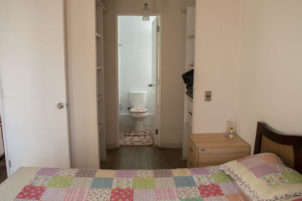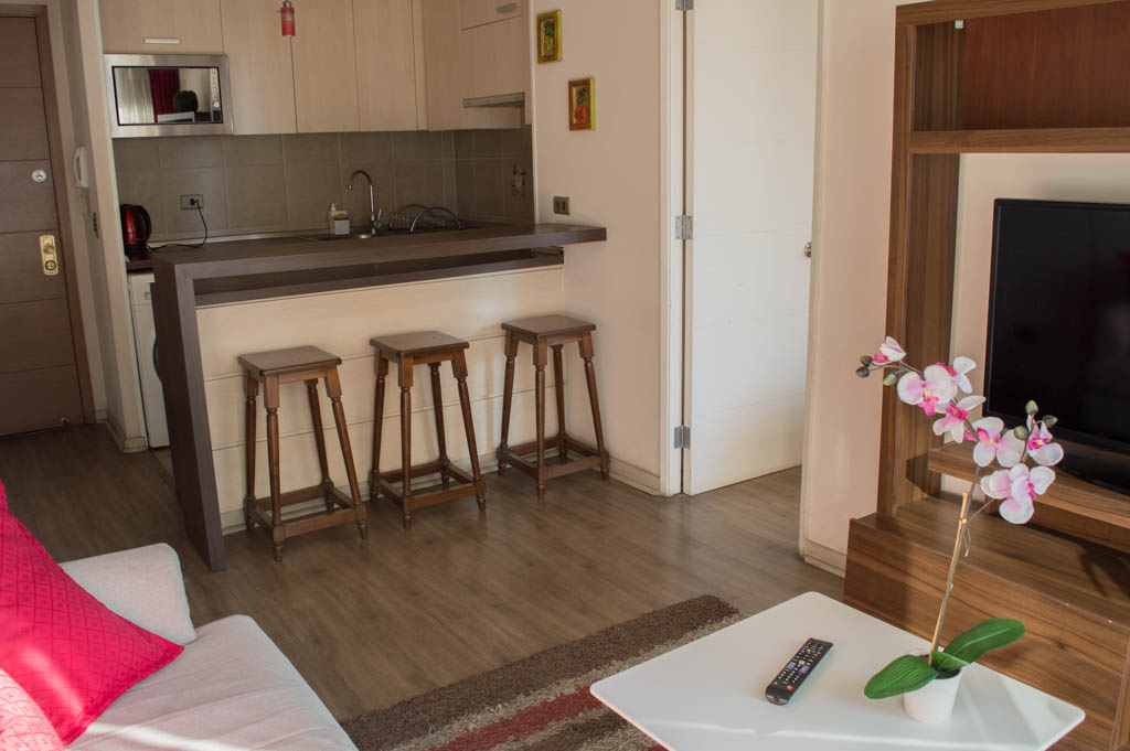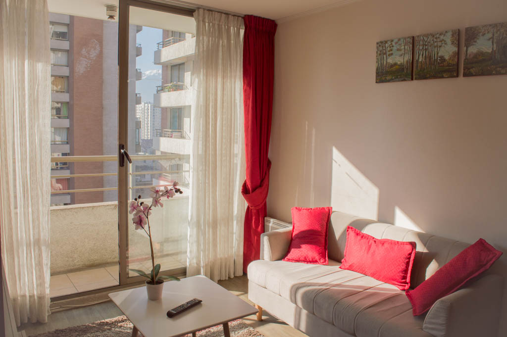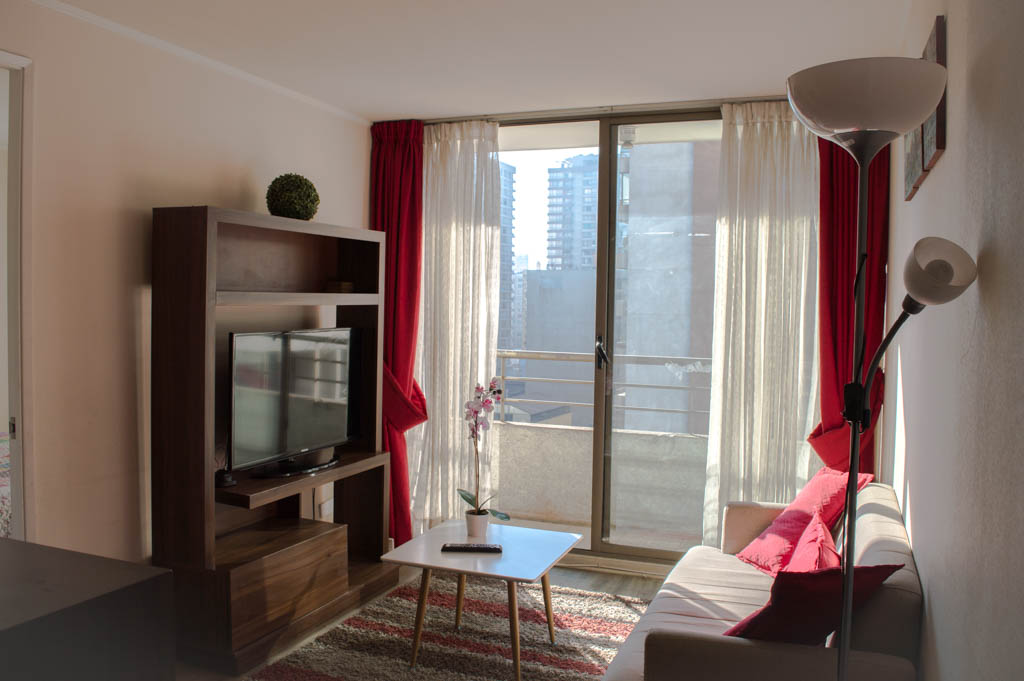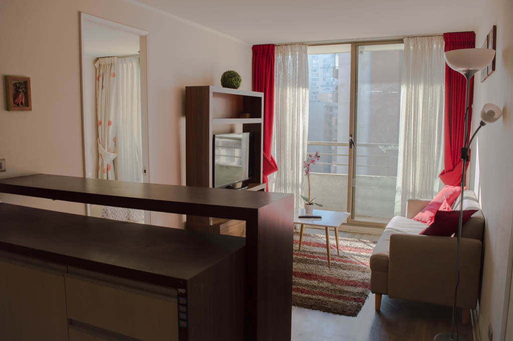 Departamento amoblado de 2 habitaciones ubicado a 2 minutos caminando de la parada de autobús y a 5 minutos caminando de la Estación de Metro Santa Lucía.El departamento tiene living, comedor, cocina (abierta), 2 baños y terraza. La habitación 1 tiene cama matrimonial, 2 clósets, mesa de noche y baño en suite; La habitación 2 tiene litera, clóset, escritorio y baño en suite; El lugar mide 65m² + 8m² de terraza aproximadamente. Se debe considerar el pago de gastos de servicios de gastos comunes, agua caliente, agua fría y electricidad que suman $ 162USD aproximadamente. El alojamiento tiene lavandería compartida cuyo valor es $ 1USD aproximadamente por carga de ropa (lavado o secado). Se debe pagar garantía (depósito) la que será devuelta al finalizar el período de arriendo; además, se debe pagar $ 43USD al momento de devolver el alojamiento para realizar la limpieza del lugar. Cerca del alojamiento se encuentra la Biblioteca Nacional, Teatro Municipal de Santiago, Cine Arte, ferias artesanales, centros culturales y el Cerro Santa Lucía, importante foco de turismo y paseos dominicales por los atractivos que presenta, como fuentes de agua, terrazas y miradores donde puedes disfrutar de una vista privilegiada de Santiago.