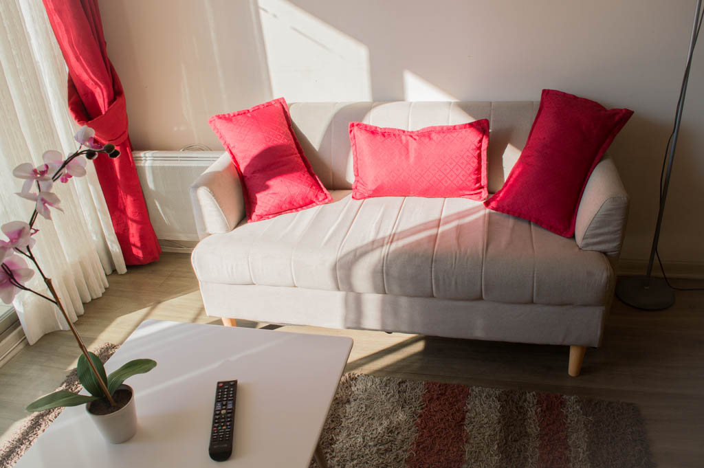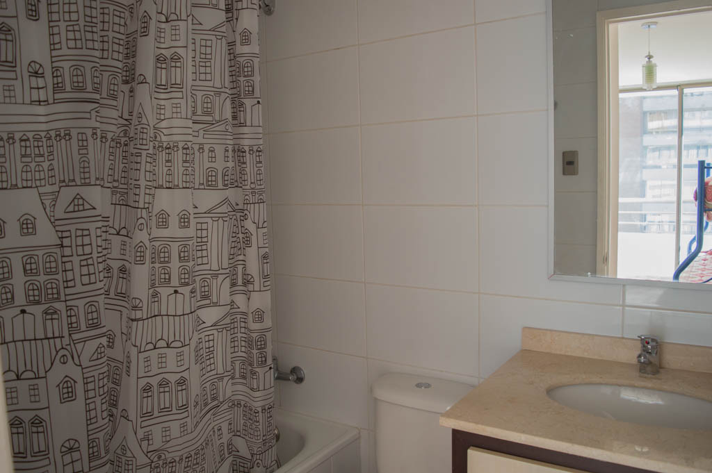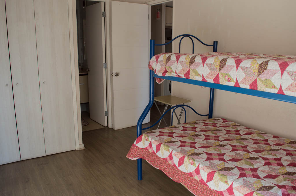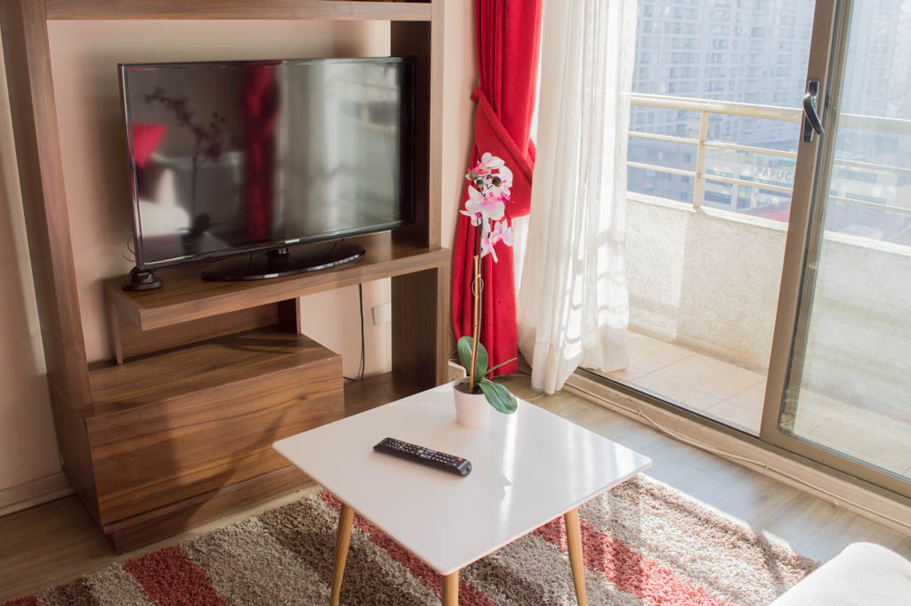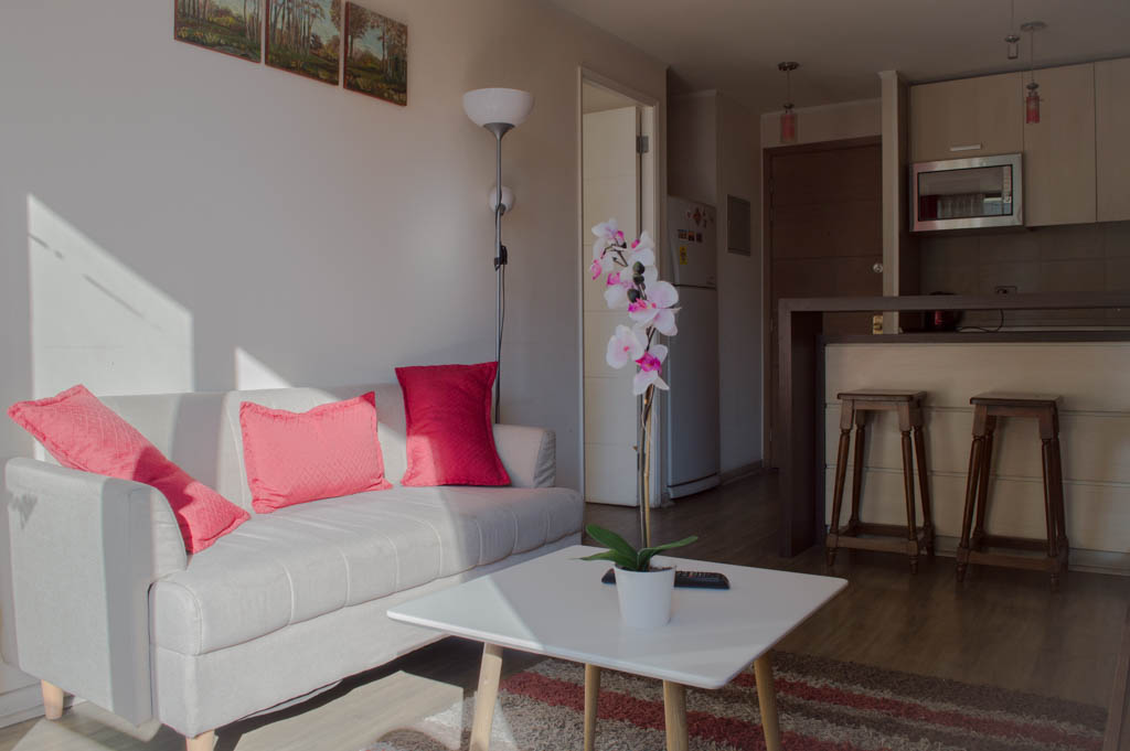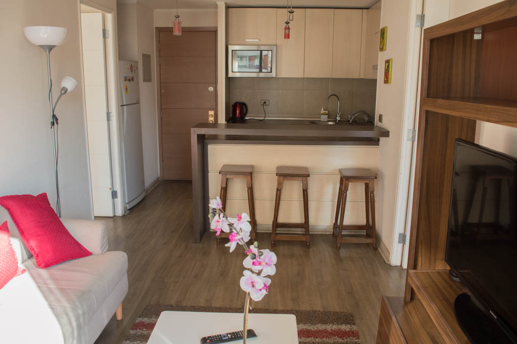 Departamento amoblado de 2 habitaciones ubicado a 2 minutos caminando de la parada de autobús y a 5 minutos caminando de la Estación de Metro Santa Lucía.El departamento tiene living, comedor, cocina (abierta), 2 baños y terraza. La habitación 1 tiene cama matrimonial, 2 clósets, mesa de noche y baño en suite; La habitación 2 tiene litera, clóset, escritorio y baño en suite; El lugar mide 65m² + 8m² de terraza aproximadamente. Se debe considerar el pago de gastos de servicios de gastos comunes, agua caliente, agua fría y electricidad que suman $ 162USD aproximadamente. El alojamiento tiene lavandería compartida cuyo valor es $ 1USD aproximadamente por carga de ropa (lavado o secado). Se debe pagar garantía (depósito) la que será devuelta al finalizar el período de arriendo; además, se debe pagar $ 43USD al momento de devolver el alojamiento para realizar la limpieza del lugar. Cerca del alojamiento se encuentra la Biblioteca Nacional, Teatro Municipal de Santiago, Cine Arte, ferias artesanales, centros culturales y el Cerro Santa Lucía, importante foco de turismo y paseos dominicales por los atractivos que presenta, como fuentes de agua, terrazas y miradores donde puedes disfrutar de una vista privilegiada de Santiago.