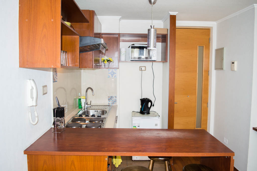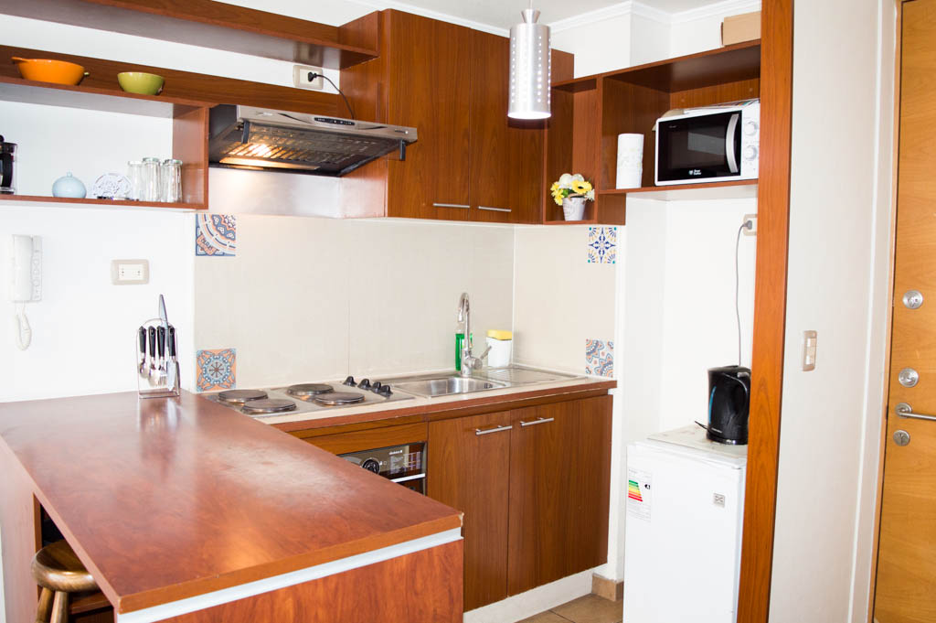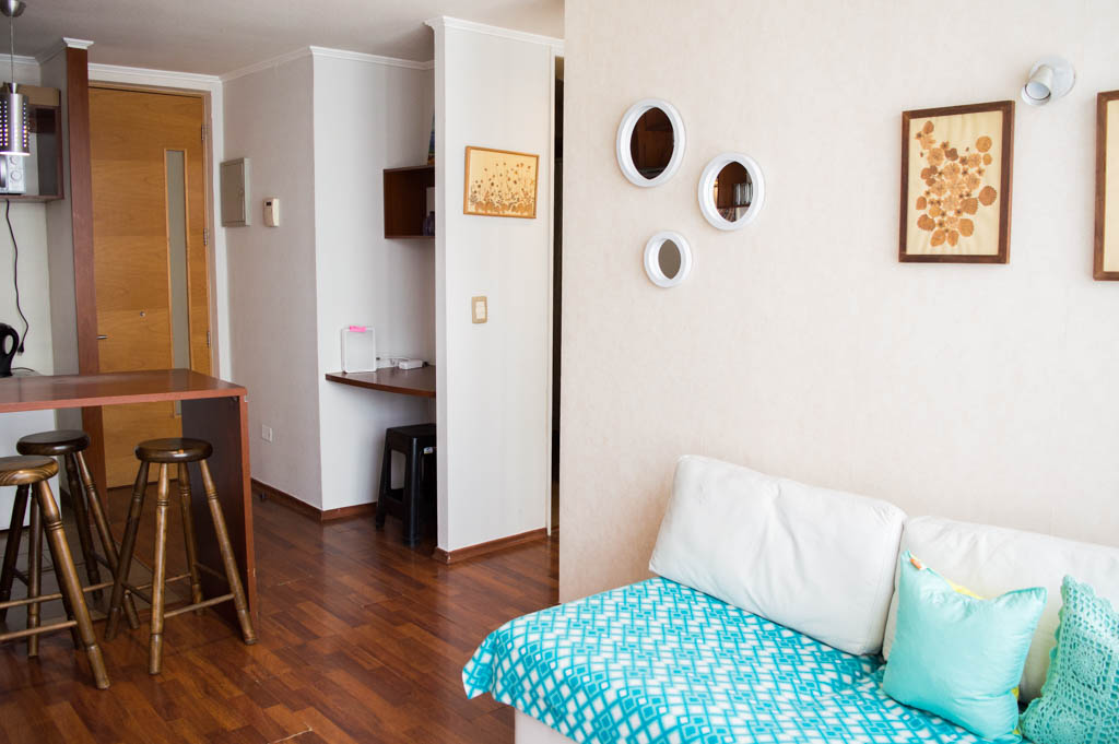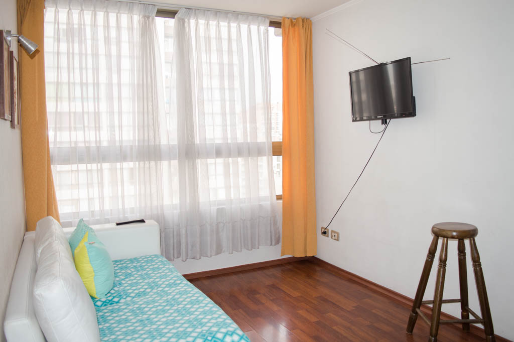 Departamento amoblado de 2 habitaciones ubicado a 1 minuto caminando de la parada de autobús y a 6 minutos caminando de la Estación de Metro La Moneda.El departamento tiene living, comedor, cocina (abierta), 1 baño y 1 estacionamiento (opcional por un valor de $ 105USD adicional). La habitación 1 tiene cama matrimonial, clóset y 2 mesas de noche; La habitación 2 tiene cama individual, sofá cama y clóset; El lugar mide 40m² aproximadamente. Los gastos de servicios de internet se pagan por adelantado junto a la renta mensual, con un límite de consumo de $ 23USD. Además, se debe considerar el pago de gastos de servicios de gastos comunes, agua caliente, agua fría y electricidad que suman $ 91USD aproximadamente. El alojamiento tiene lavandería compartida cuyo valor es $ 2USD aproximadamente por carga de ropa (lavado o secado). Se debe pagar garantía (depósito) la que será devuelta al finalizar el período de arriendo; además, se debe pagar $ 23USD al momento de devolver el alojamiento para realizar la limpieza del lugar. Cerca del alojamiento se encuentra la Avenida Bernardo O'Higgins (más conocida como Alameda), el Palacio de La Moneda y la Plaza de la Constitución, entre otras edificaciones de valor histórico y arquitectónico. También podrás encontrar, múltiples restoranes, bares, bancos y entidades gubernamentales.