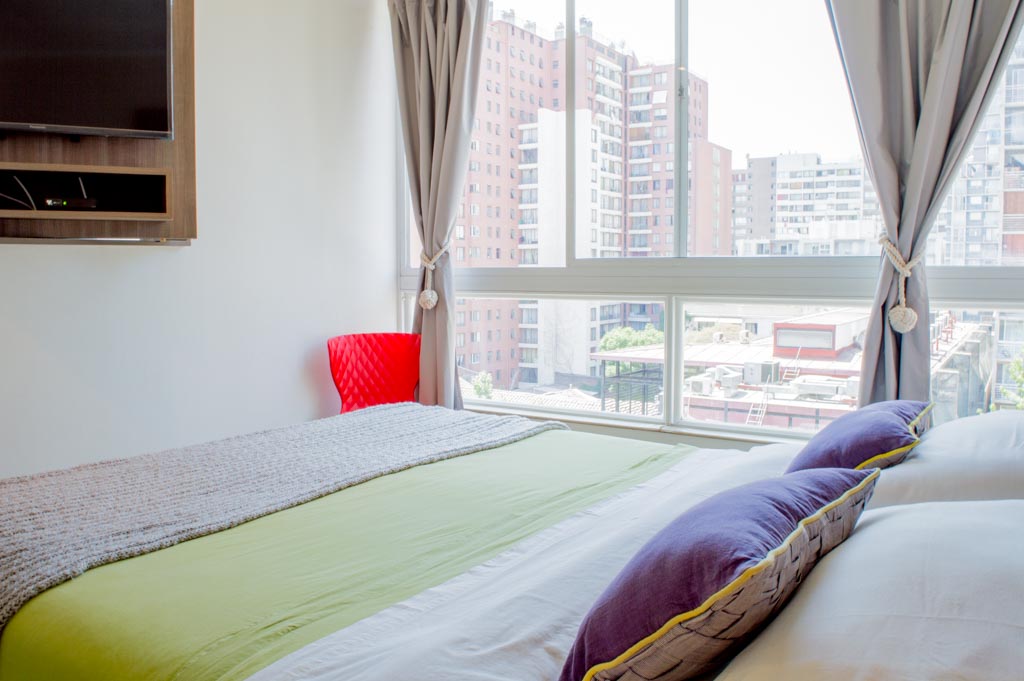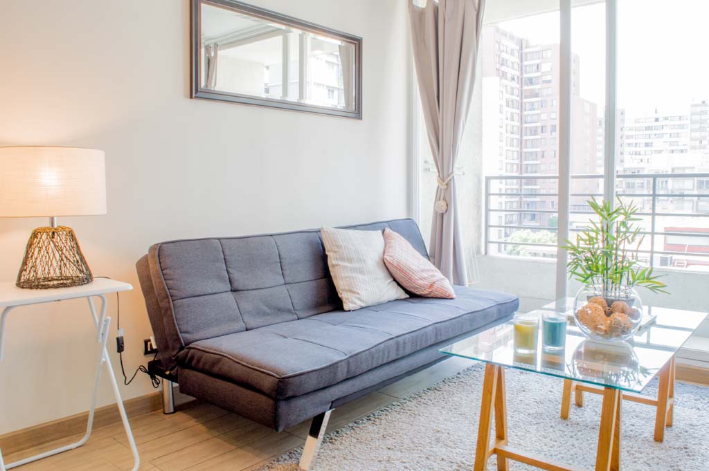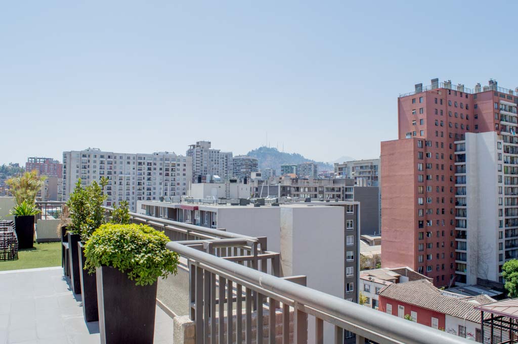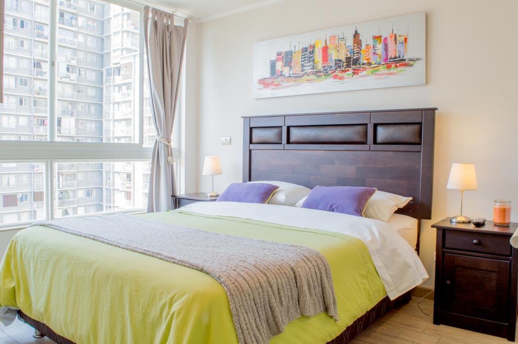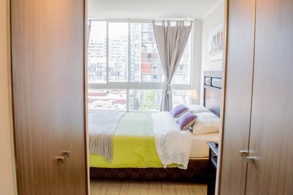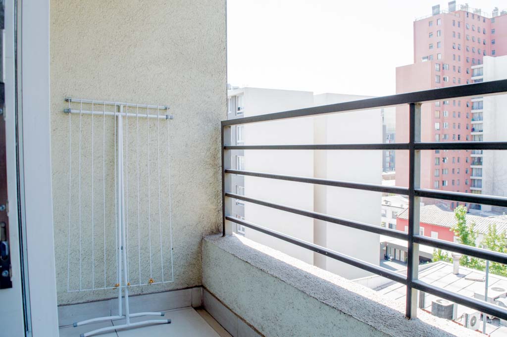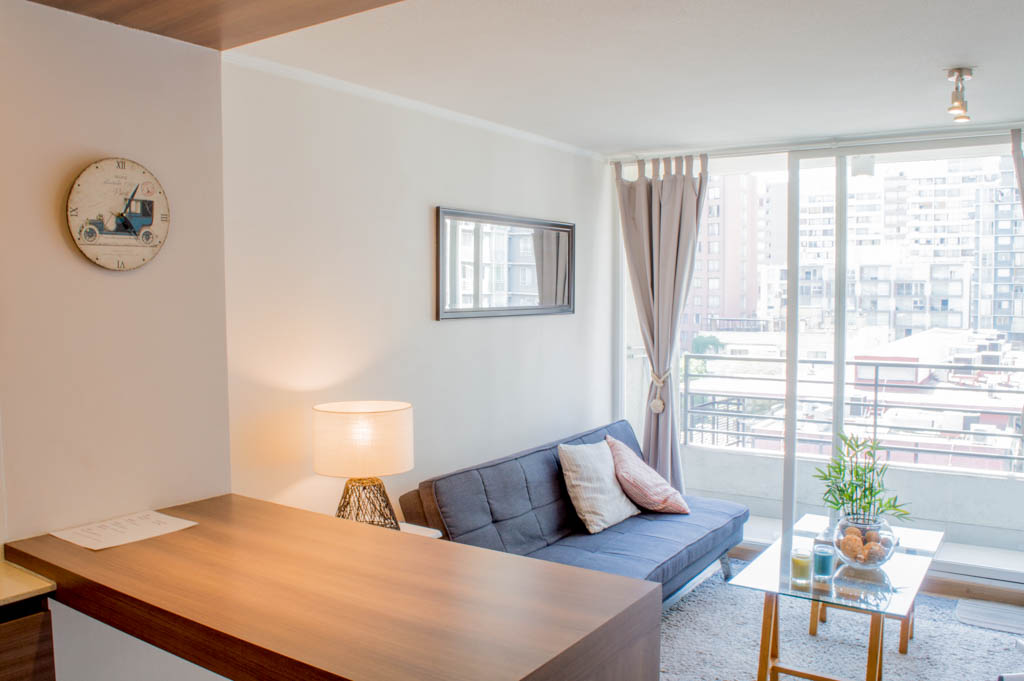 Departamento amoblado de 1 habitación ubicado a 2 minutos caminando de la parada de autobús y a 11 minutos caminando de la Estación de Metro Santa Lucía.El departamento tiene comedor, cocina (abierta), 1 baño, balcón y 1 estacionamiento (opcional por un valor de $ 66USD adicional). La habitación 1 tiene cama matrimonial, clóset, 2 mesas de noche, televisor y baño en suite; El lugar mide 35m² + 5m² de terraza aproximadamente. Se debe considerar el pago de gastos de servicios de gastos comunes, agua caliente, agua fría, electricidad, internet y TV cable que suman $ 175USD aproximadamente. El alojamiento tiene lavandería compartida cuyo valor es $ 2USD aproximadamente por carga de ropa (lavado o secado). Se debe pagar garantía (depósito) la que será devuelta al finalizar el período de arriendo; además, se debe pagar $ 55USD al momento de devolver el alojamiento para realizar la limpieza del lugar. Cerca del alojamiento se encuentra la Biblioteca Nacional, Teatro Municipal de Santiago, Cine Arte, ferias artesanales, centros culturales y el Cerro Santa Lucía, importante foco de turismo y paseos dominicales por los atractivos que presenta, como fuentes de agua, terrazas y miradores donde puedes disfrutar de una vista privilegiada de Santiago.