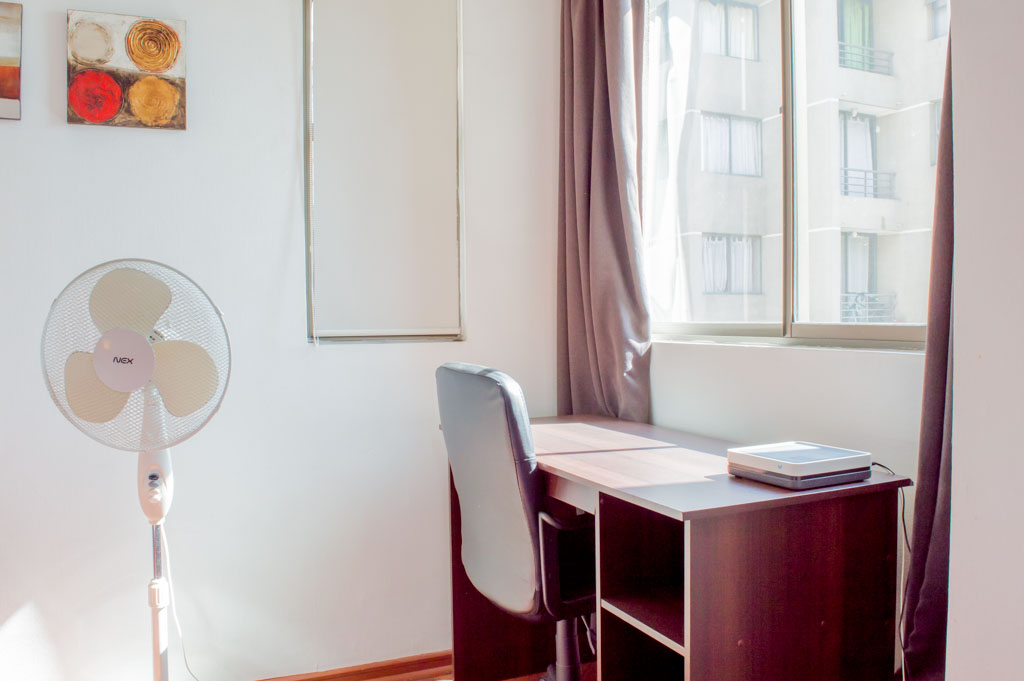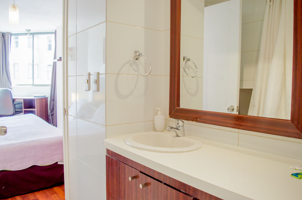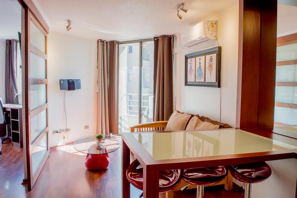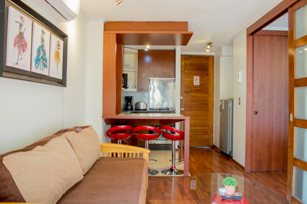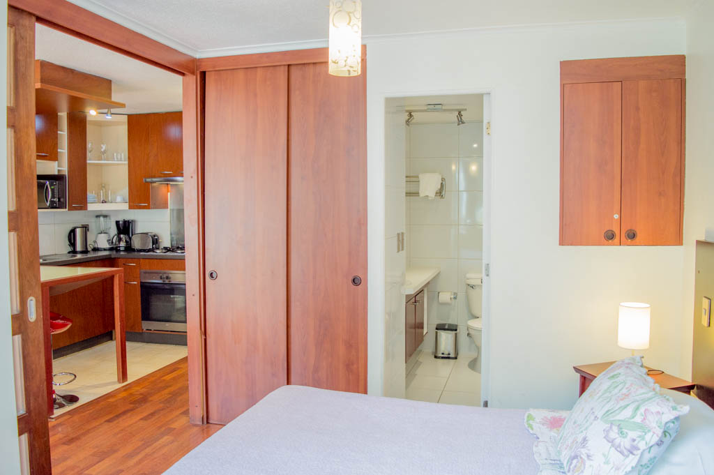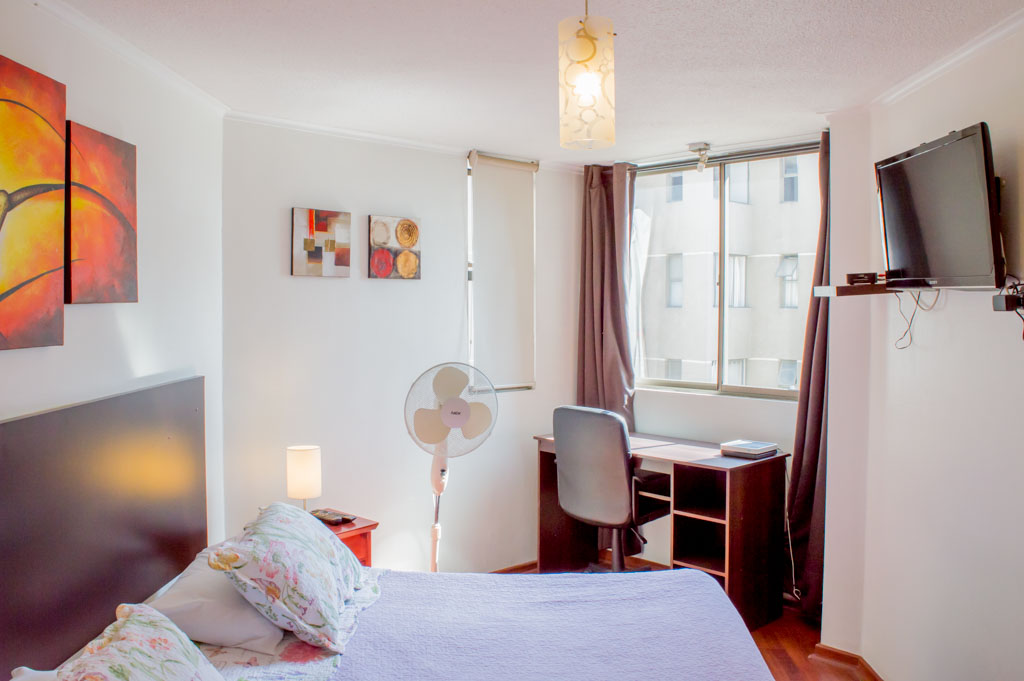 Departamento amoblado de 1 habitación ubicado a 2 minutos caminando de la parada de autobús y a 6 minutos caminando de la Estación de Metro Bellas Artes.El departamento tiene living, comedor, cocina (abierta), 1 baño y balcón. La habitación 1 tiene cama matrimonial, clóset, 2 mesas de noche, escritorio, silla y baño en suite; El lugar mide 35m² + 1m² de terraza aproximadamente. Los gastos de servicios de gastos comunes, agua caliente, agua fría, electricidad, gas, internet y TV cable se pagan por adelantado junto a la renta mensual, con un límite de consumo de $ 179USD. El alojamiento tiene lavandería compartida cuyo valor es $ 1USD aproximadamente por carga de ropa (lavado o secado). Se debe pagar garantía (depósito) la que será devuelta al finalizar el período de arriendo; además, se debe pagar $ 33USD al momento de devolver el alojamiento para realizar la limpieza del lugar. Cerca del alojamiento se encuentra el Barrio Lastarria y Barrio Bellas Artes (barrios históricos - culturales), caracterizados por sus casonas del siglo XIX restauradas y utilizadas como restaurantes, cafeterías, librerías, centros culturales, entre otros. A pasos podrás encontrar el Museo Nacional de Bellas Artes, donde se resguarda lo más valioso del arte nacional e internacional y el Parque Forestal, lugar ideal para compartir con amigos, practicar deportes y pasear.