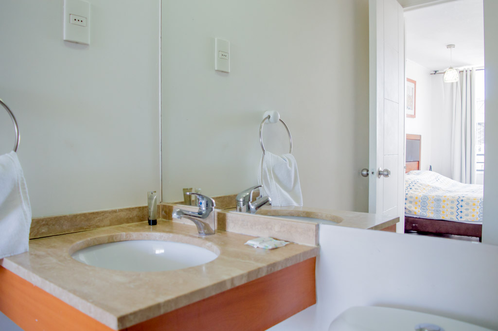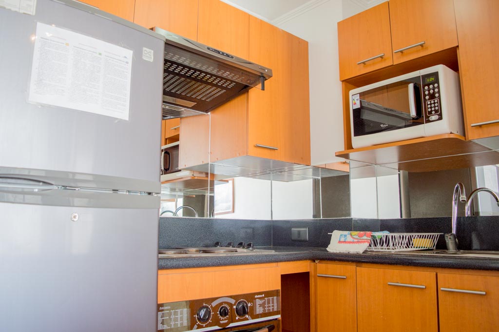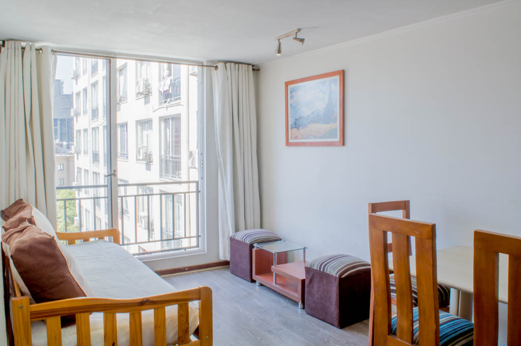 Departamento amoblado de 2 habitaciones ubicado a 2 minutos caminando de la parada de autobús y a 2 minutos caminando de la Estación de Metro Universidad de Chile.El departamento tiene living, comedor, cocina (abierta) y 2 baños. La habitación 1 tiene cama matrimonial, 2 mesas de noche, televisor y baño en suite; La habitación 2 tiene litera, clóset y mesa de noche; El lugar mide 45m² aproximadamente. Los gastos de servicios de gastos comunes, agua caliente, agua fría, electricidad, internet y TV cable se pagan por adelantado junto a la renta mensual, con un límite de consumo de $ 215USD. El alojamiento tiene lavandería compartida cuyo valor es $ 1USD aproximadamente por carga de ropa (lavado o secado). Se debe pagar garantía (depósito) la que será devuelta al finalizar el período de arriendo; además, se debe pagar $ 45USD al momento de devolver el alojamiento para realizar la limpieza del lugar. Cerca del alojamiento se encuentra la Avenida Bernardo O'Higgins (más conocida como Alameda) donde hay diversos locales comerciales, gran variedad de transporte público y el centro cívico de Santiago. A pasos del metro se encuentra el emblemático Instituto Nacional José Miguel Carrera, la Universidad de Chile y el Teatro Municipal de Santiago.